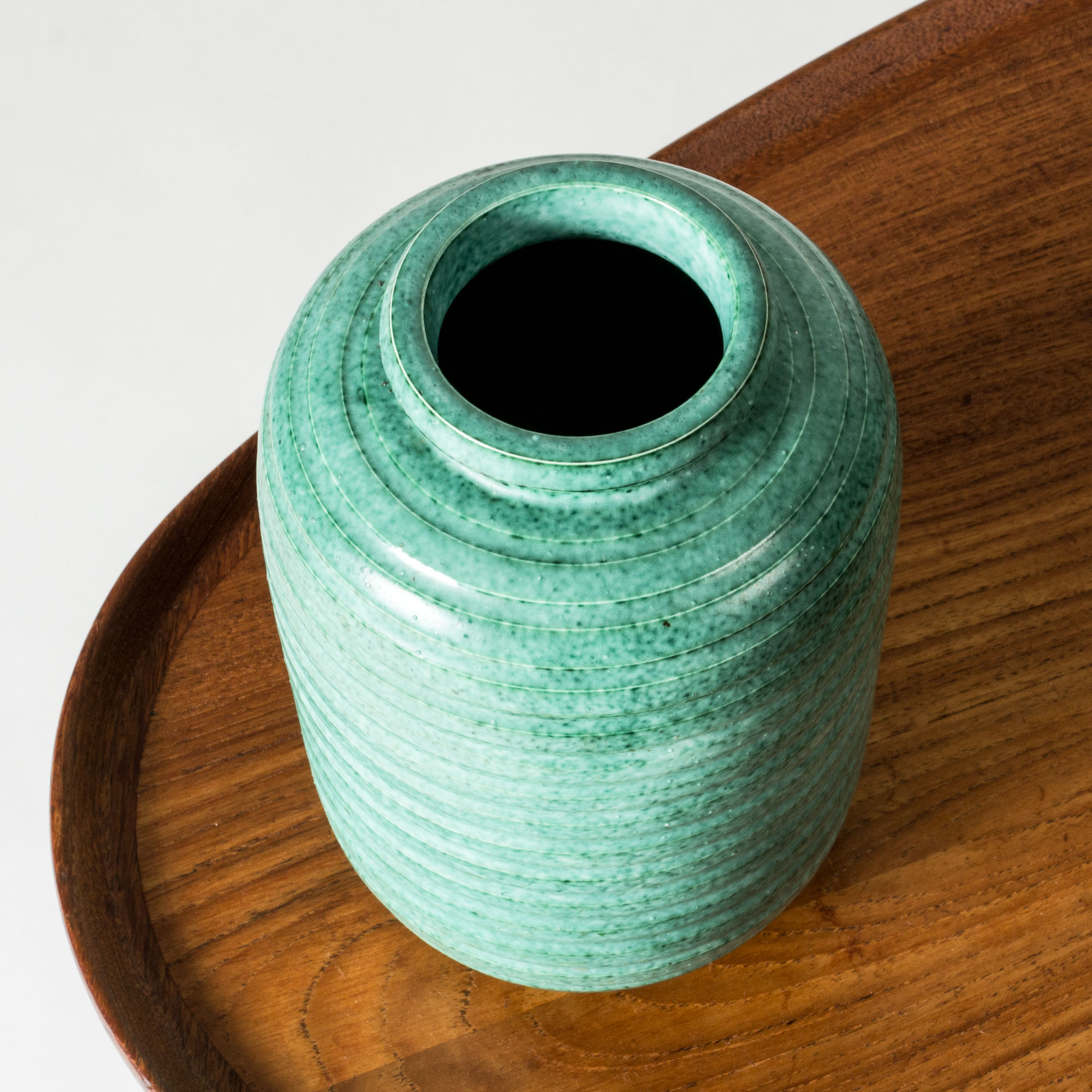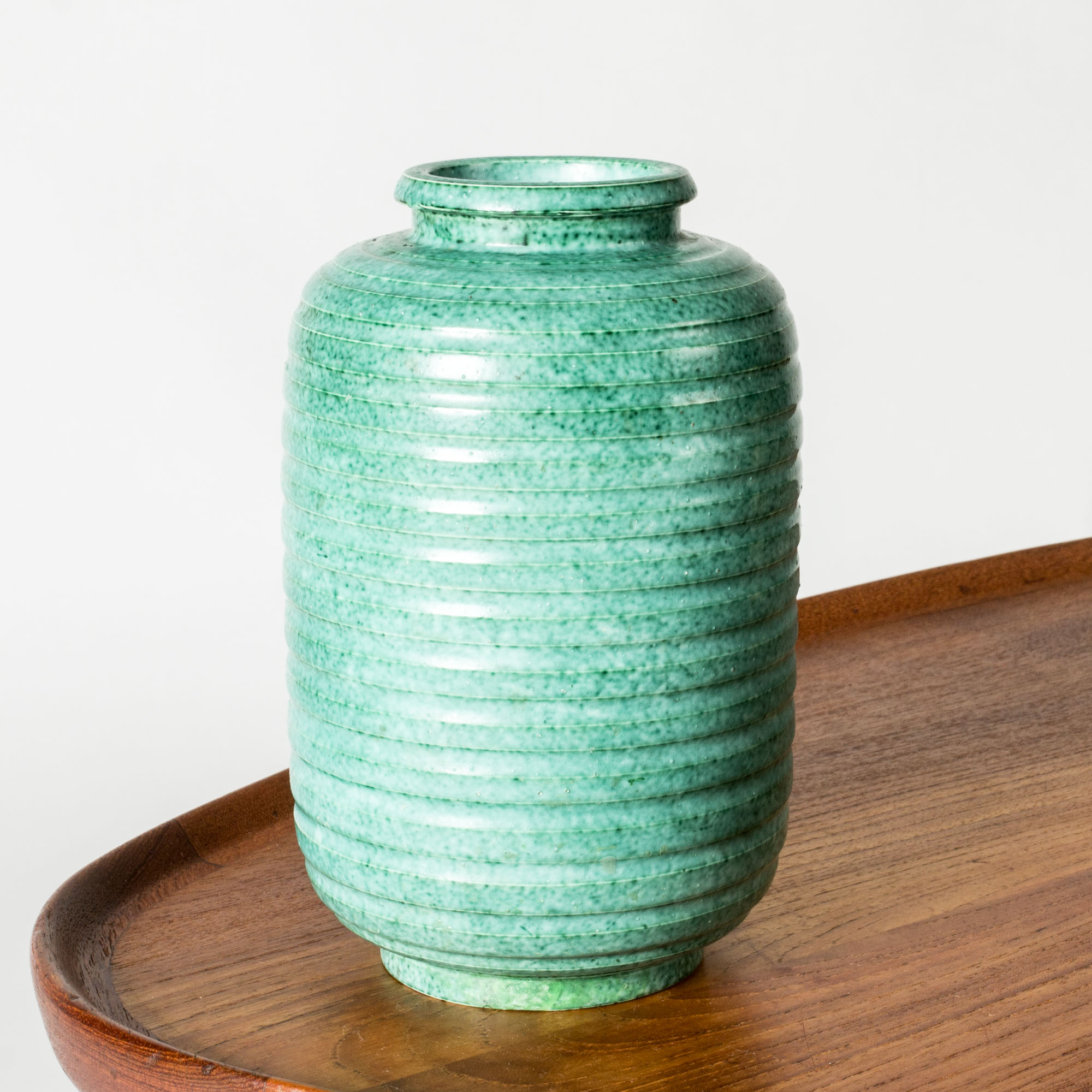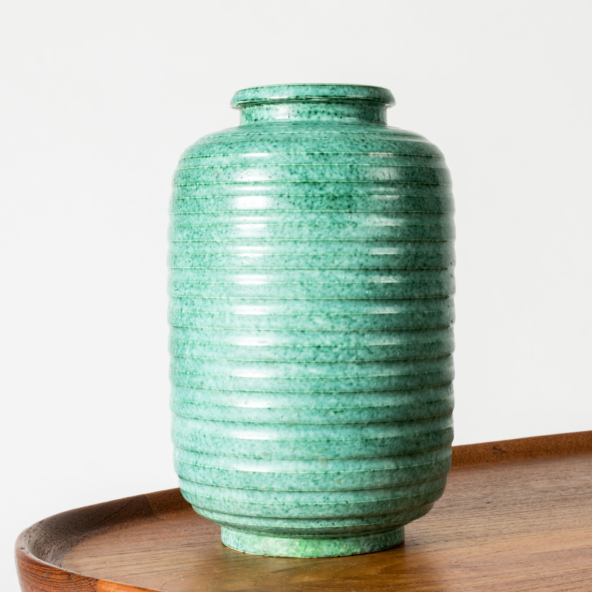 Early stoneware “Argenta” vase by Wilhelm Kåge in a compact cylinder form. Decorated with a pattern of embossed stripes.
