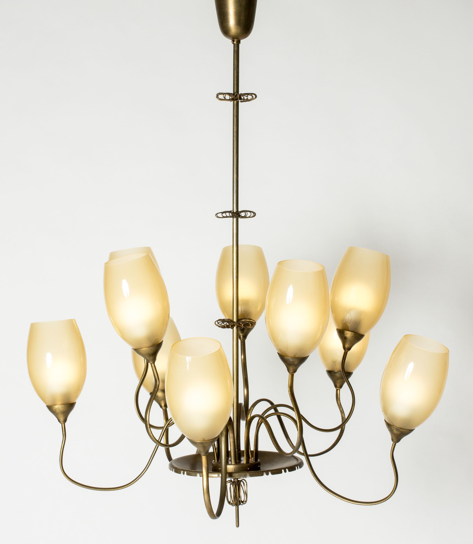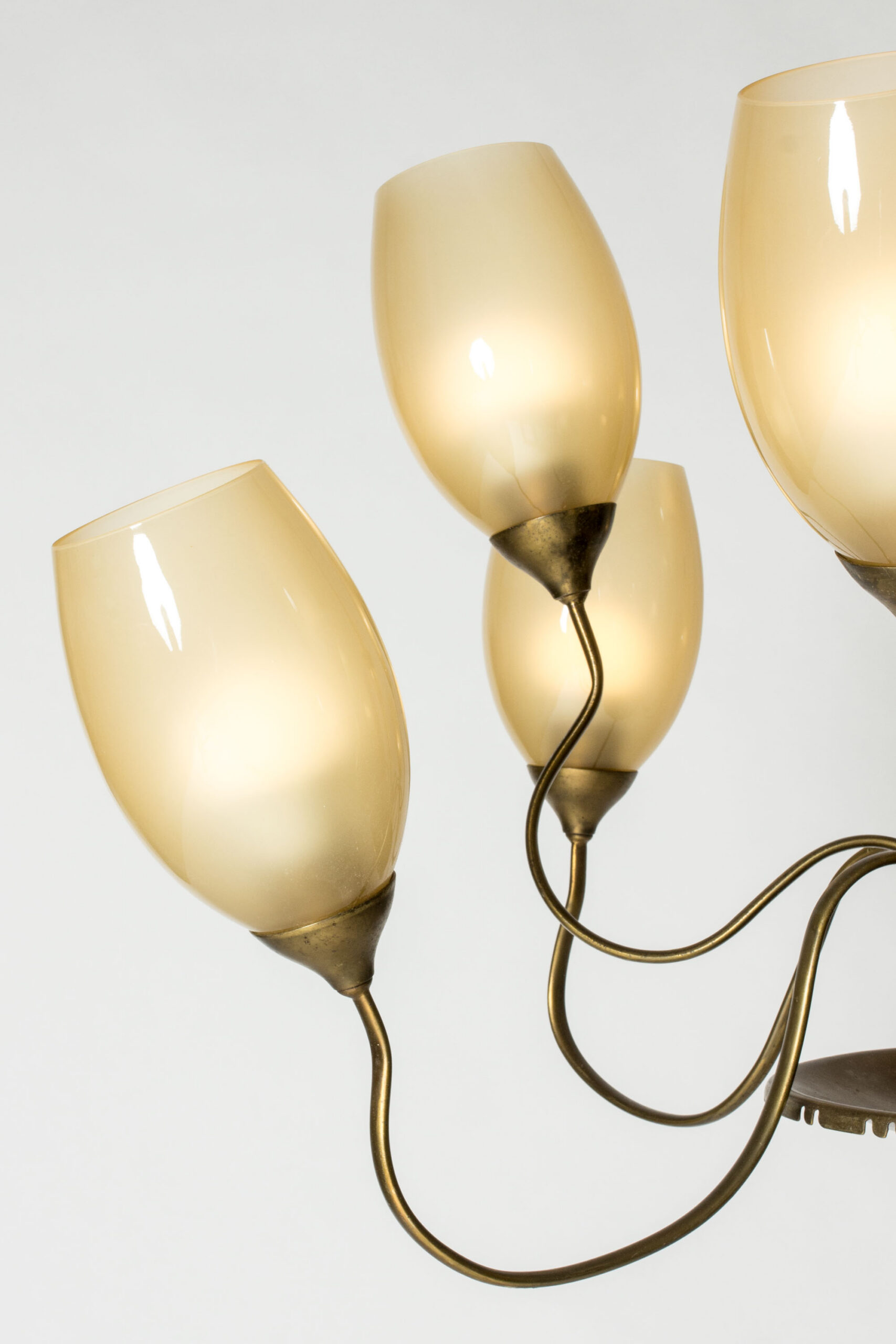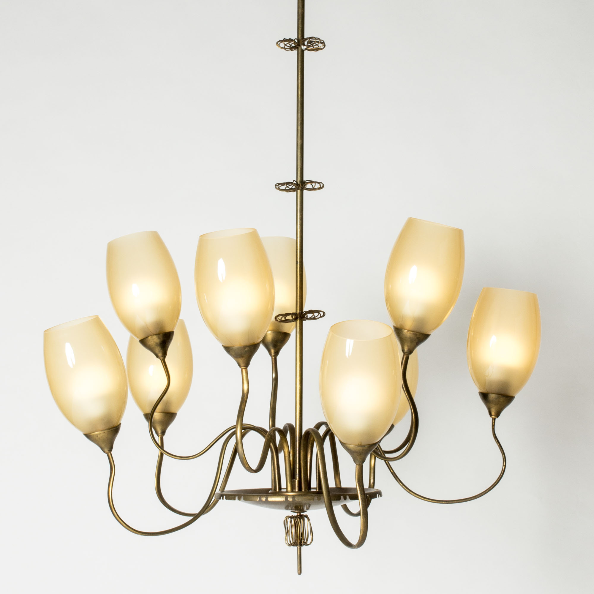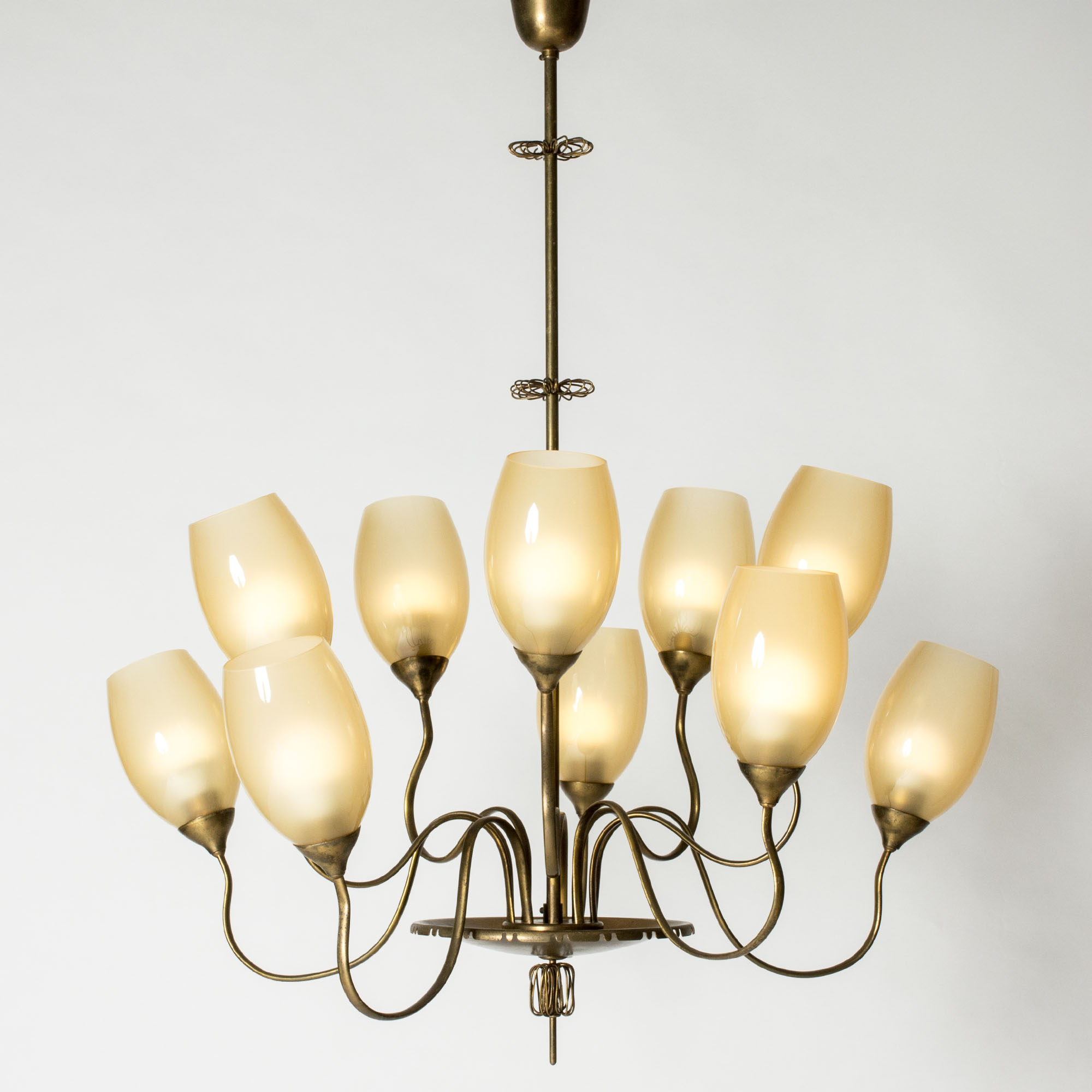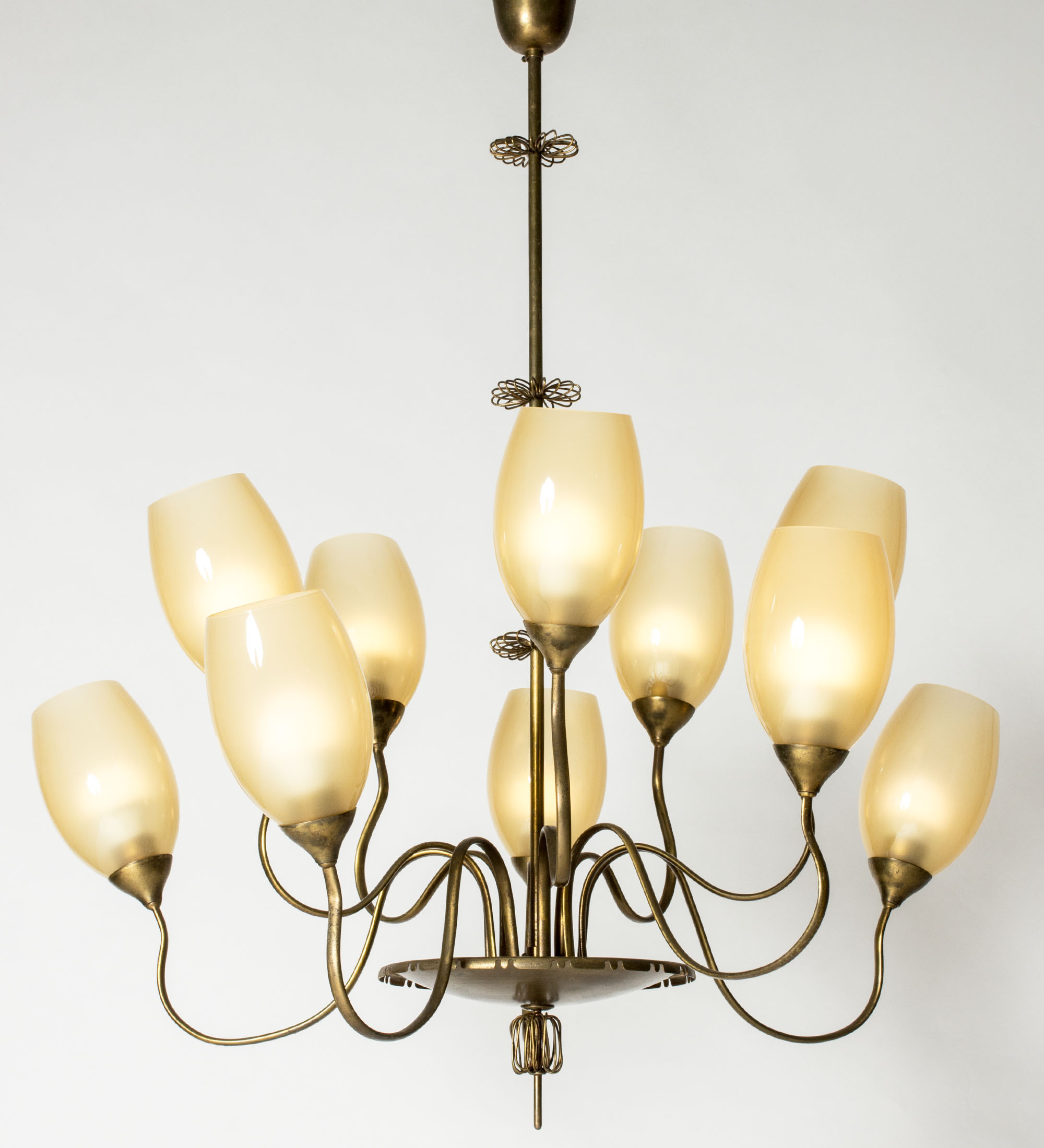 Amazing chandelier by Paavo Tynell, made from brass in a graceful design with ten curved arms. Beautiful stylized flowers made from wire decorate the stem and bottom. Glass shades in a warm honey nuance with a subtle sheen.
