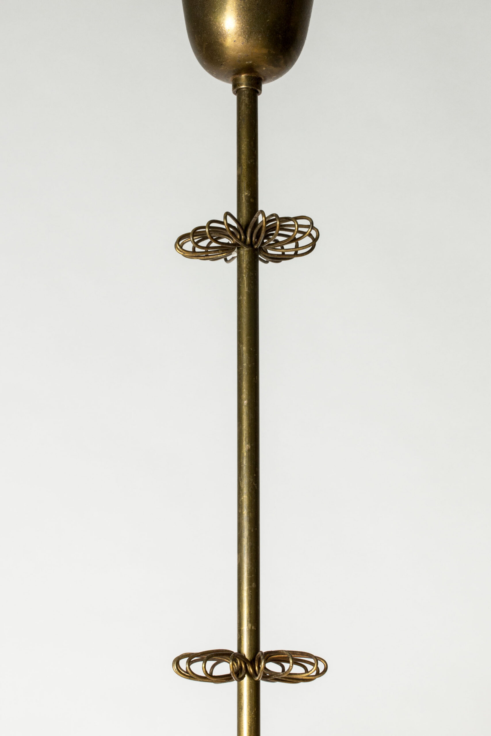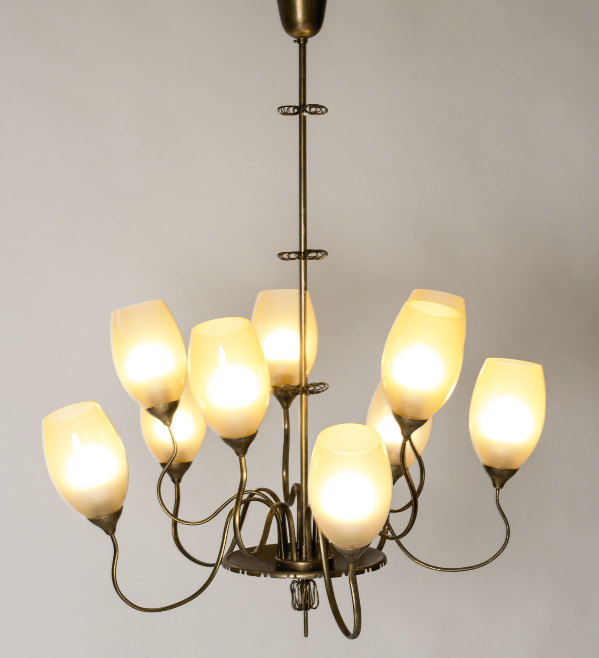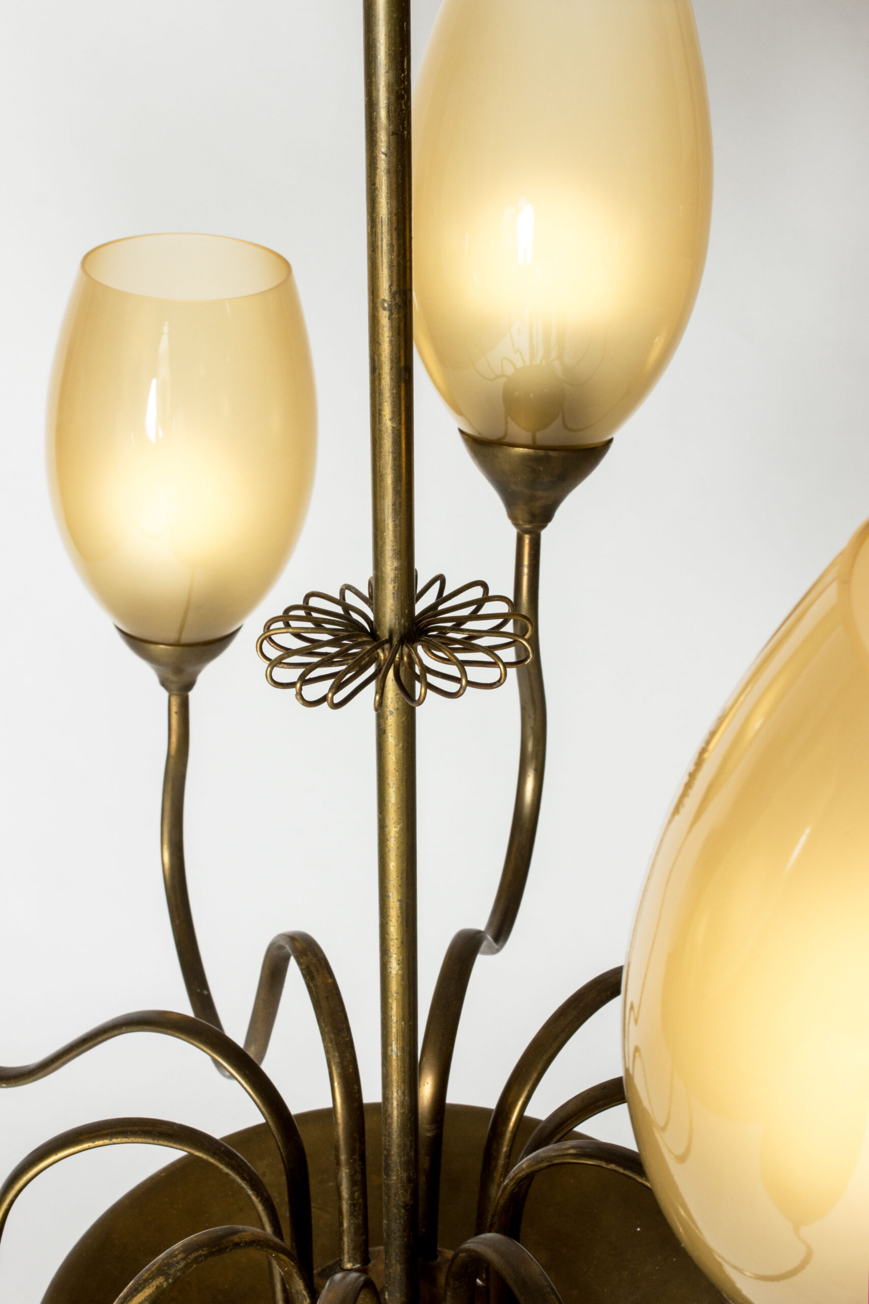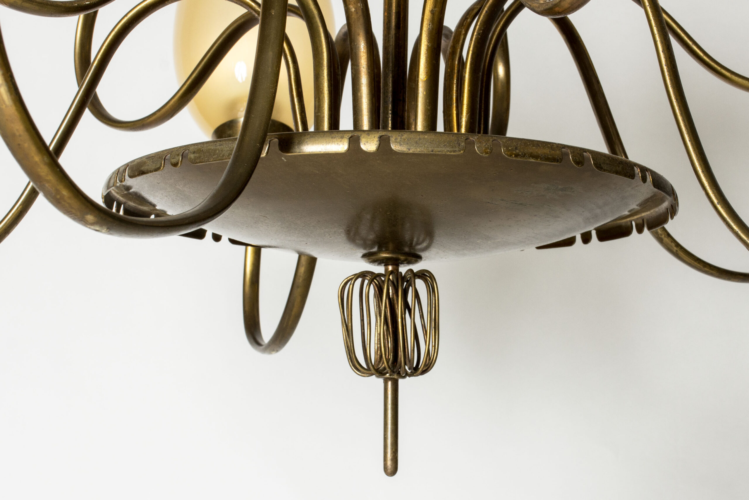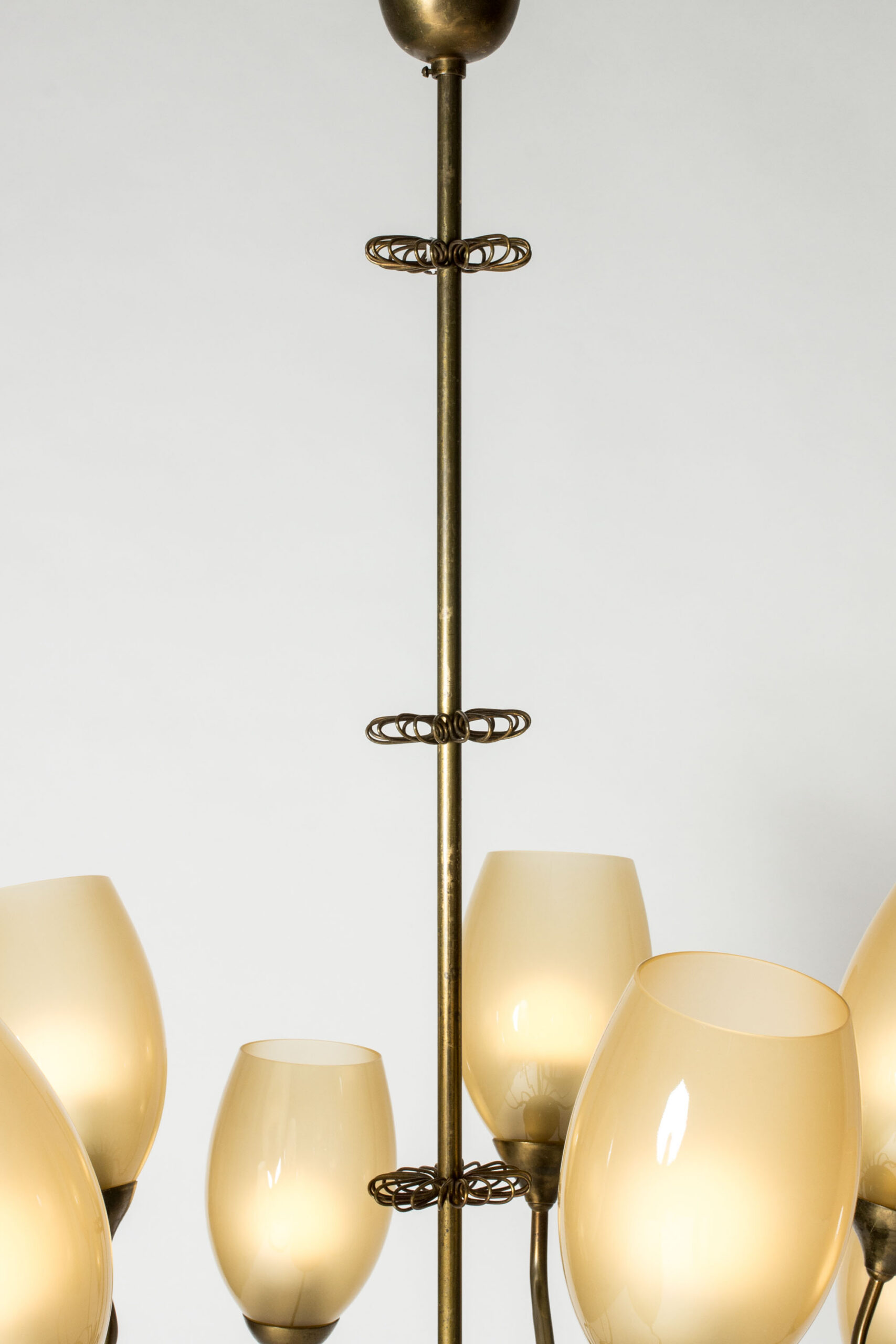Amazing chandelier by Paavo Tynell, made from brass in a graceful design with ten curved arms. Beautiful stylized flowers made from wire decorate the stem and bottom. Glass shades in a warm honey nuance with a subtle sheen.
