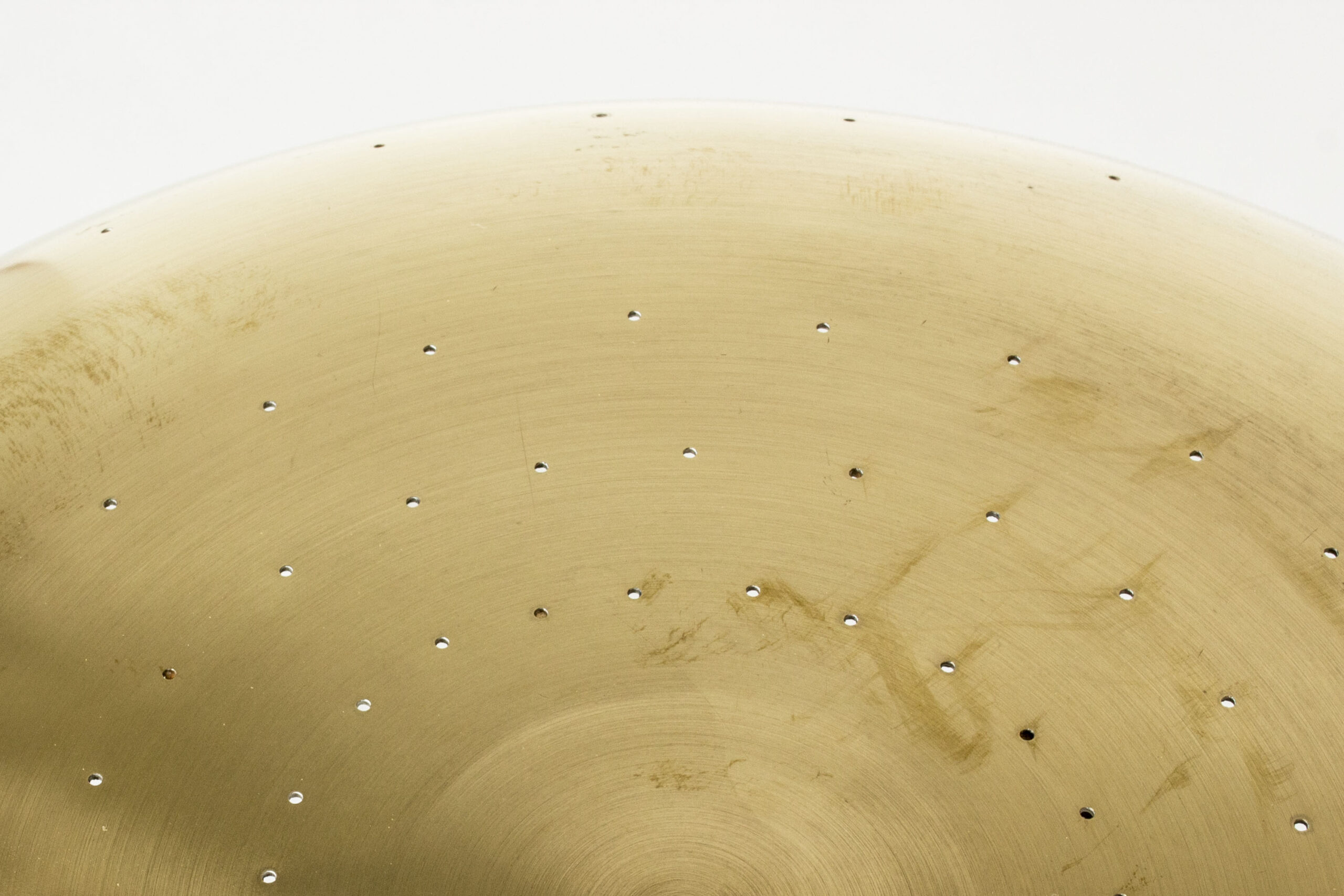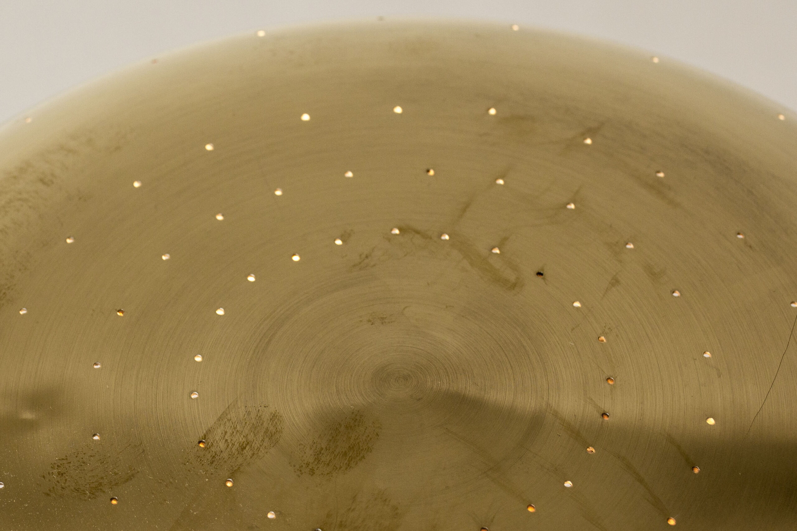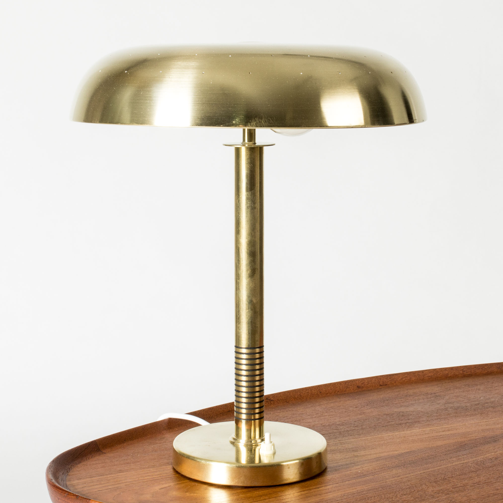 Sleek table lamp from Boréns, made from brass. Wide brass shade with rounded forms, base with elegant stripes. Shade perforated with a pattern of small holes, that let the light out gently.