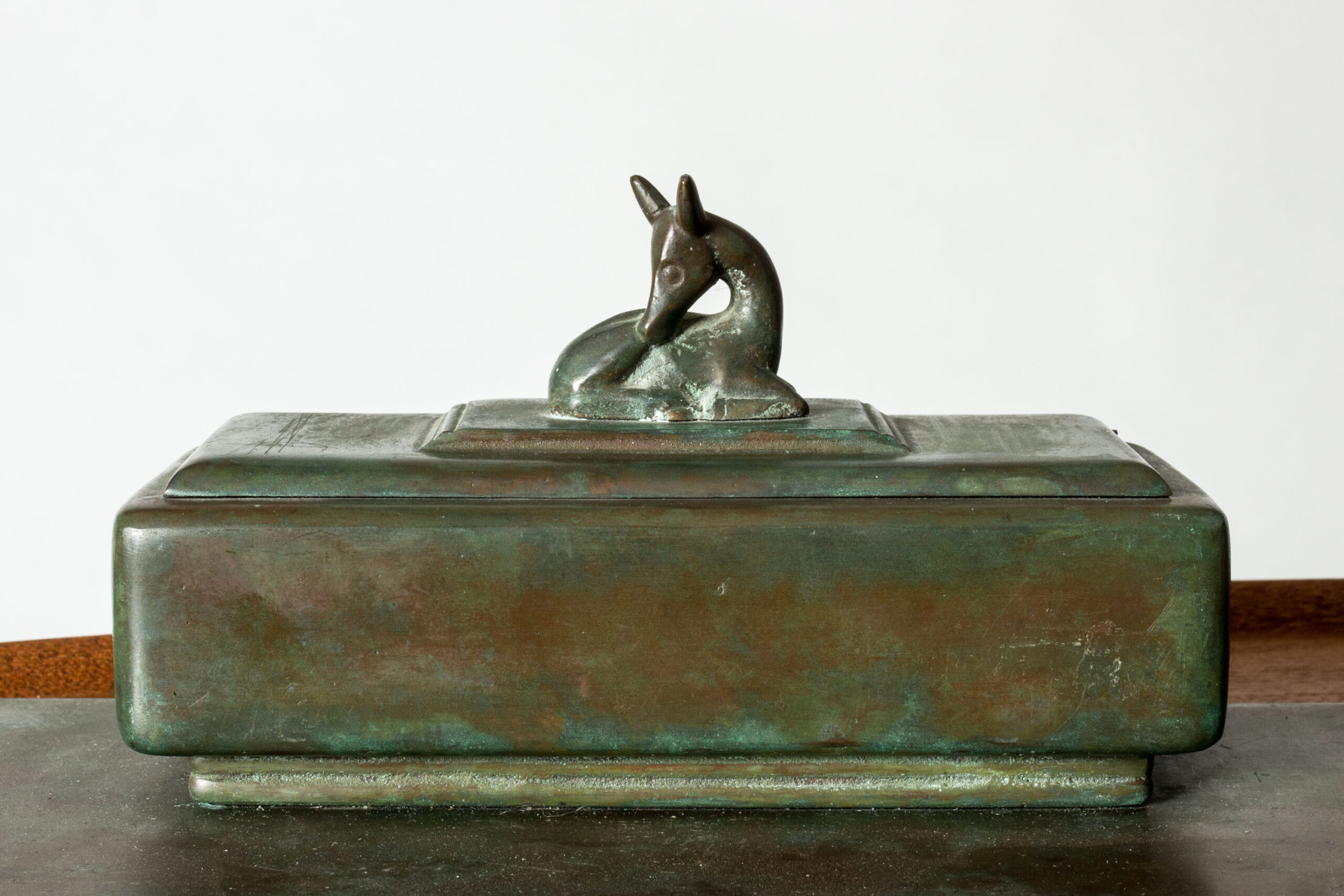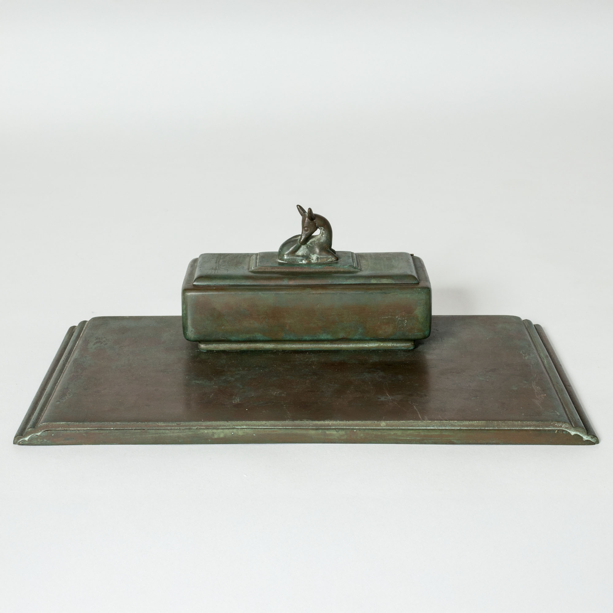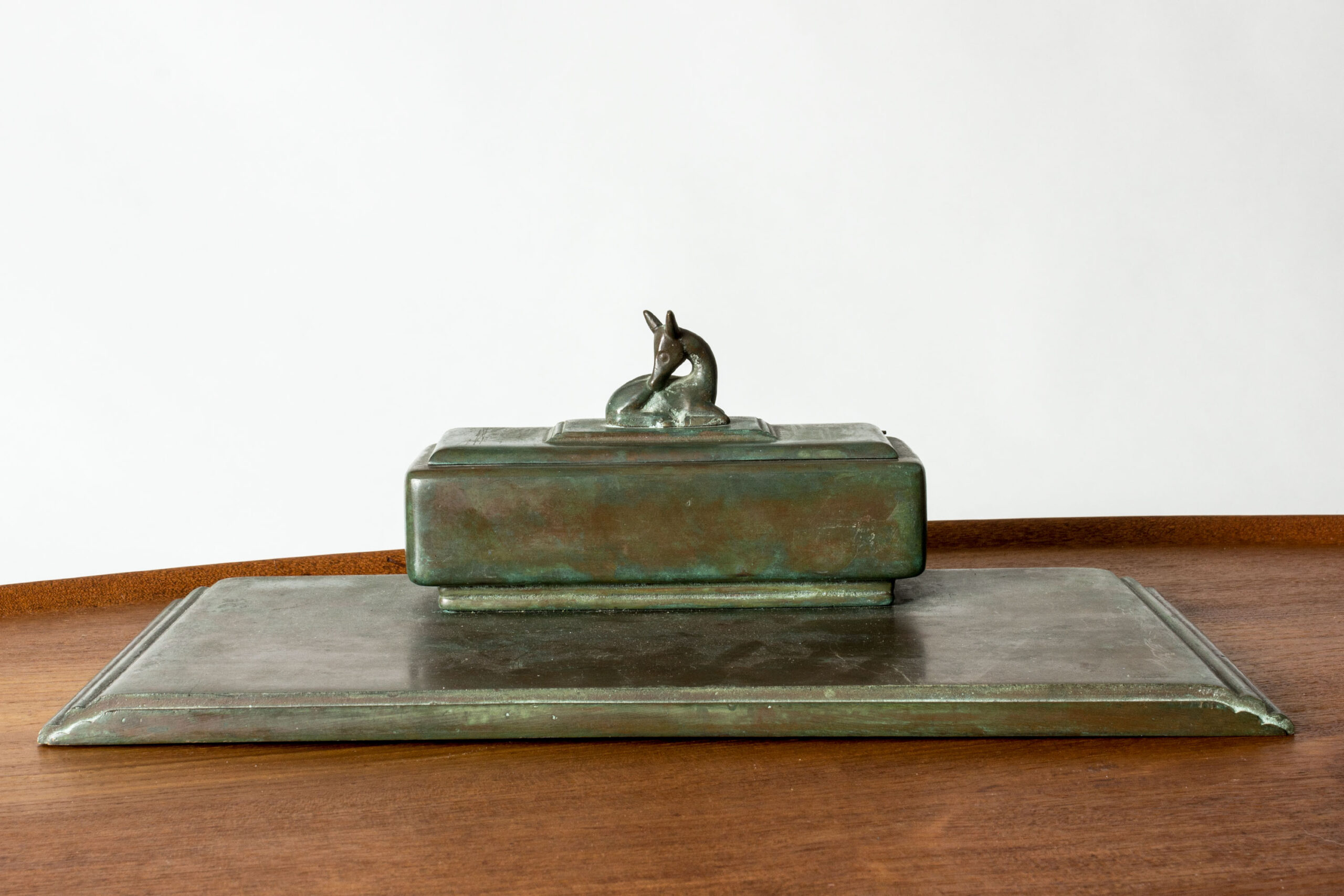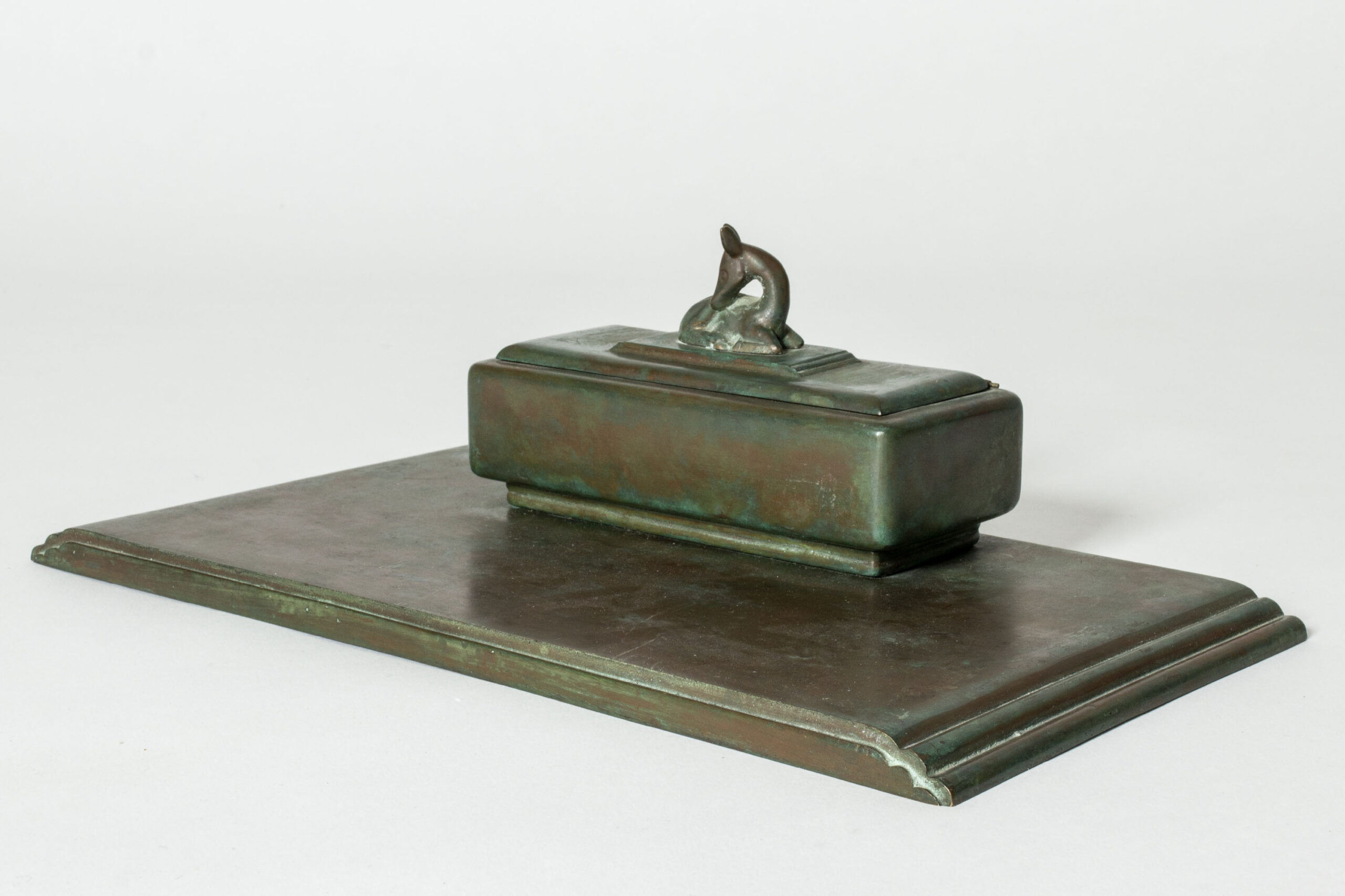 Elegant inkwell by Sune Bäckström, made from bronze in a beautiful deep green color. The lid of the inkwell is decorated with a lovely fawn.