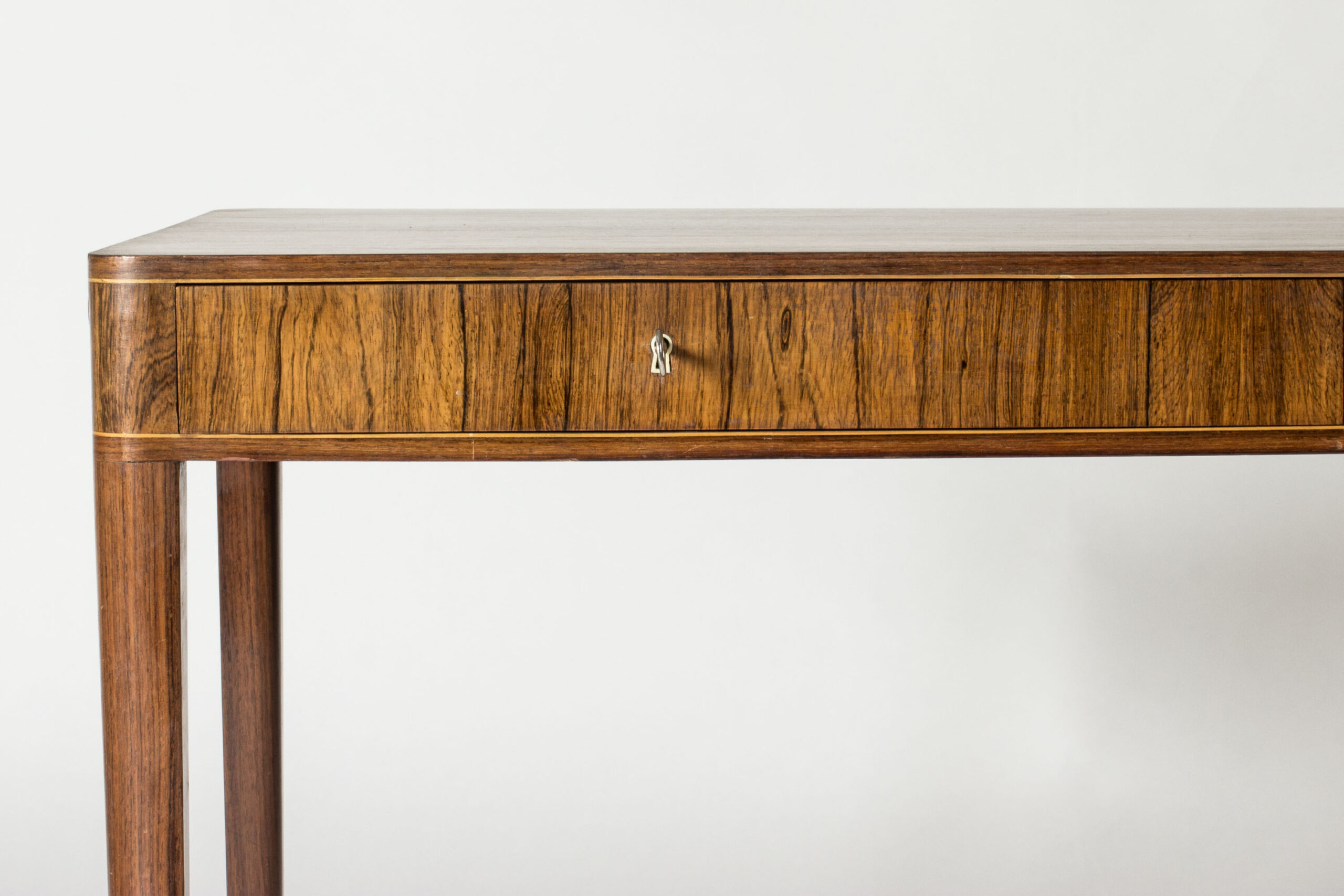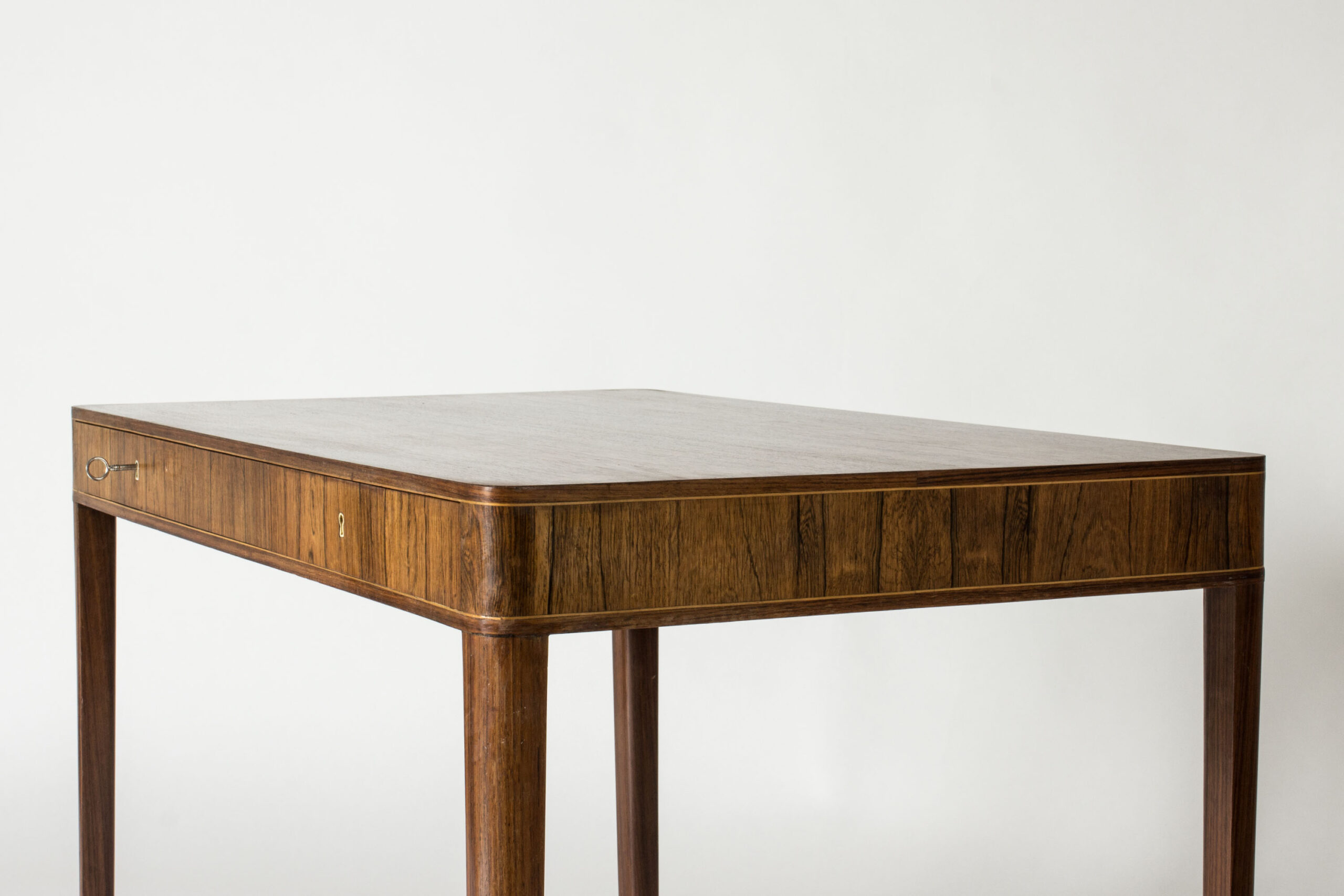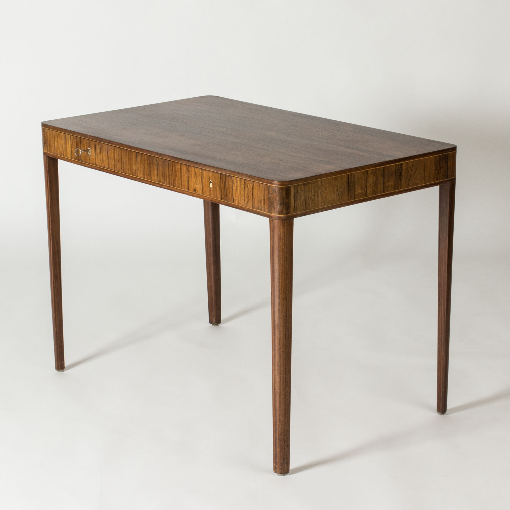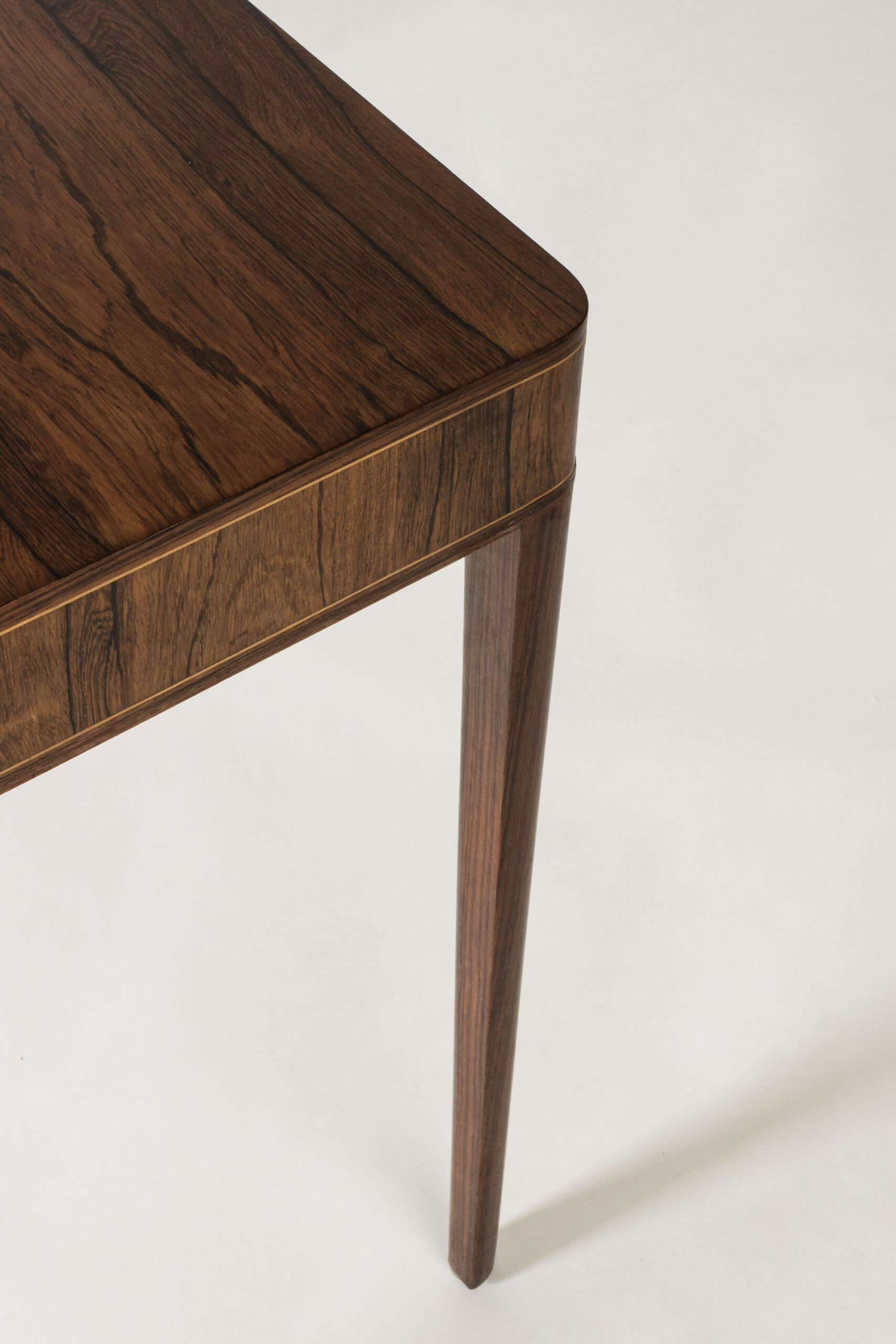 Beautiful small desk, built by master carpenter Hjalmar Jackson. Made from rosewood with elegant inlayed lines of lighter wood.