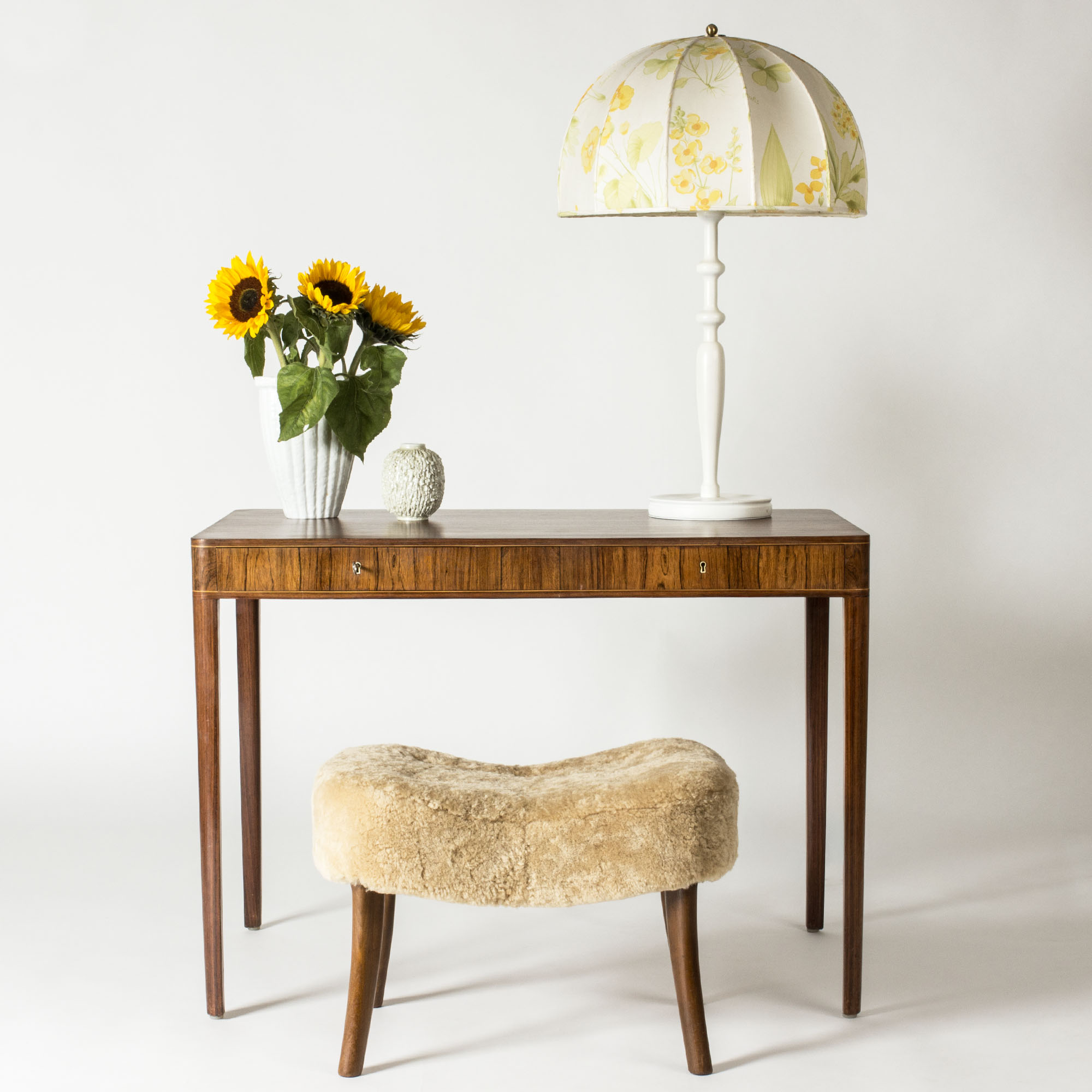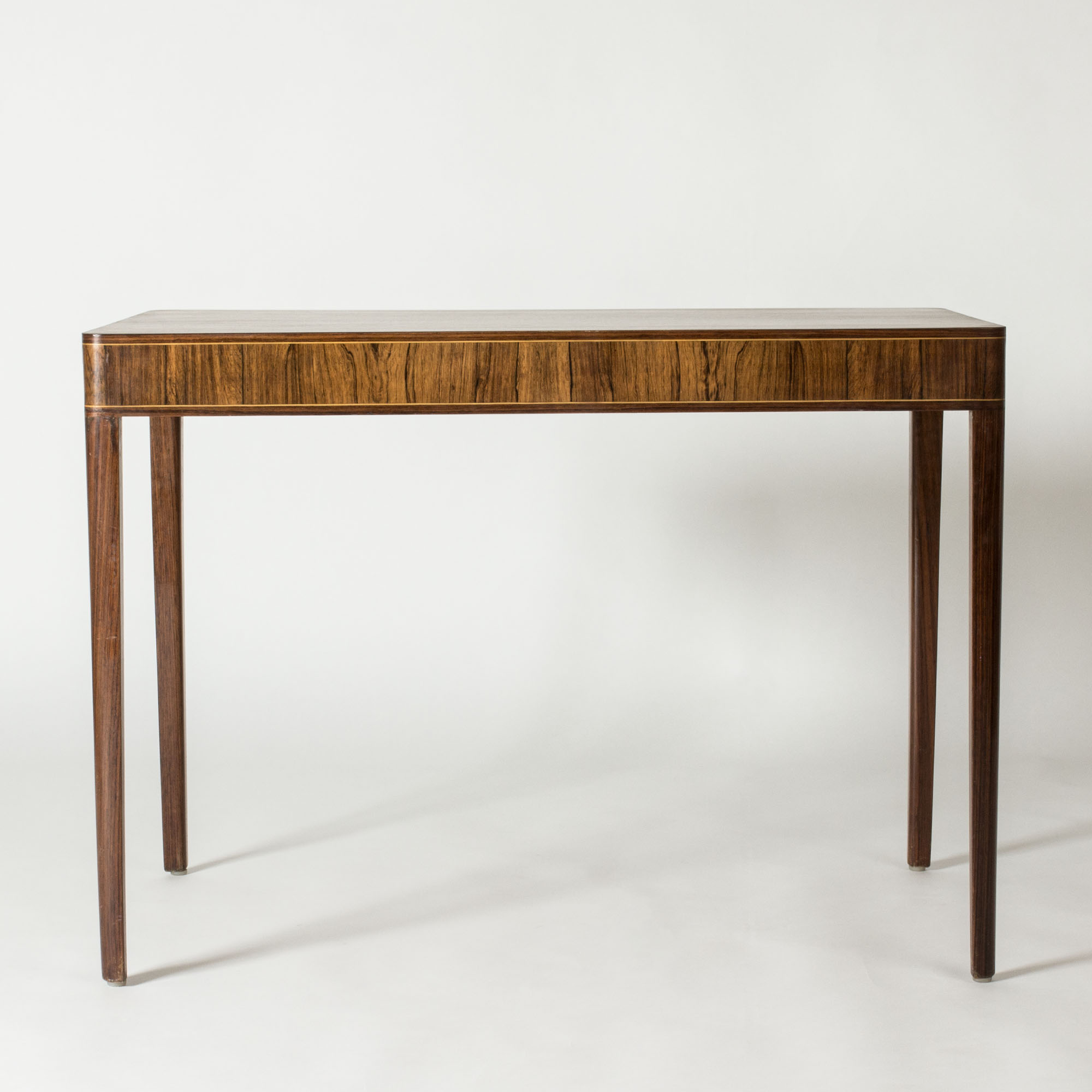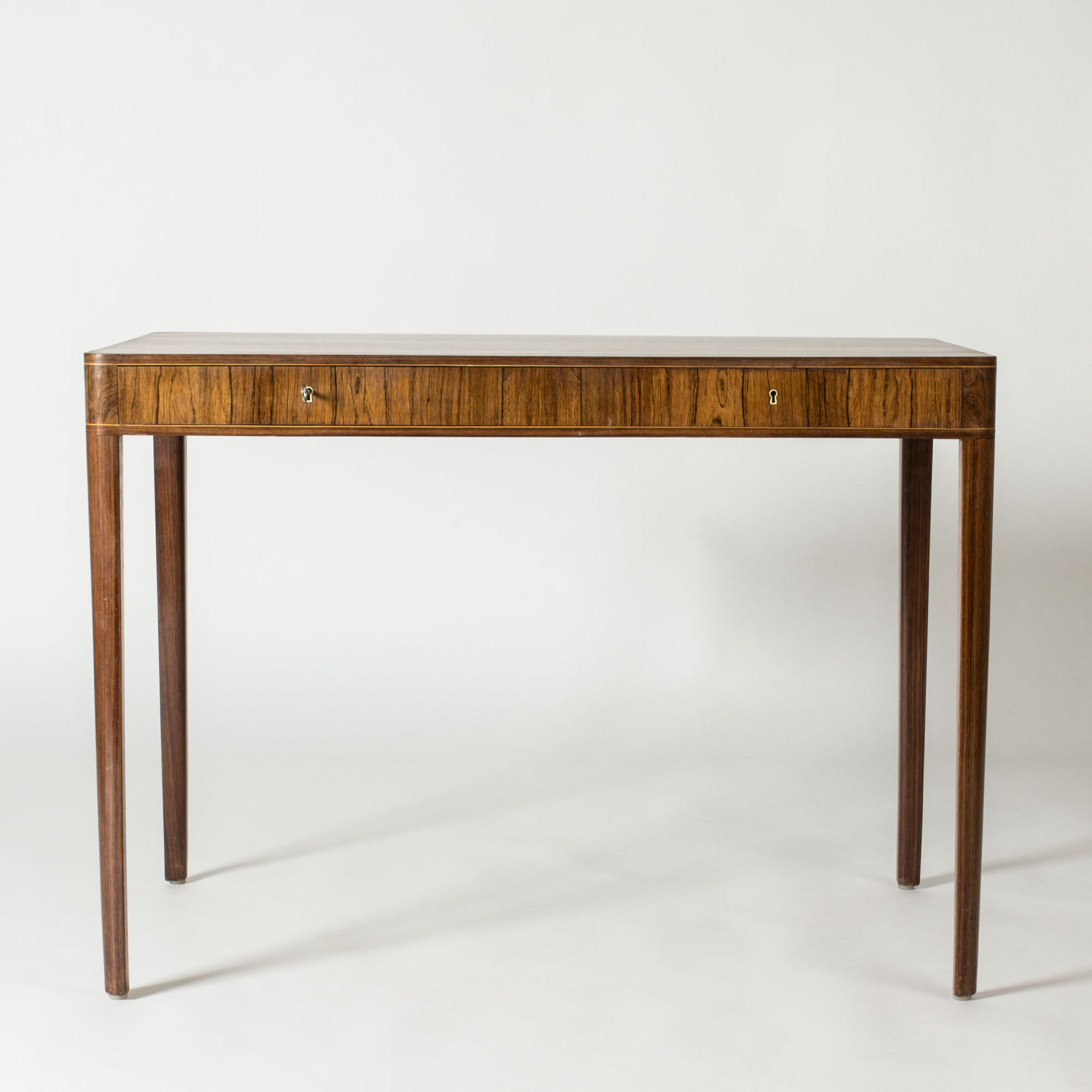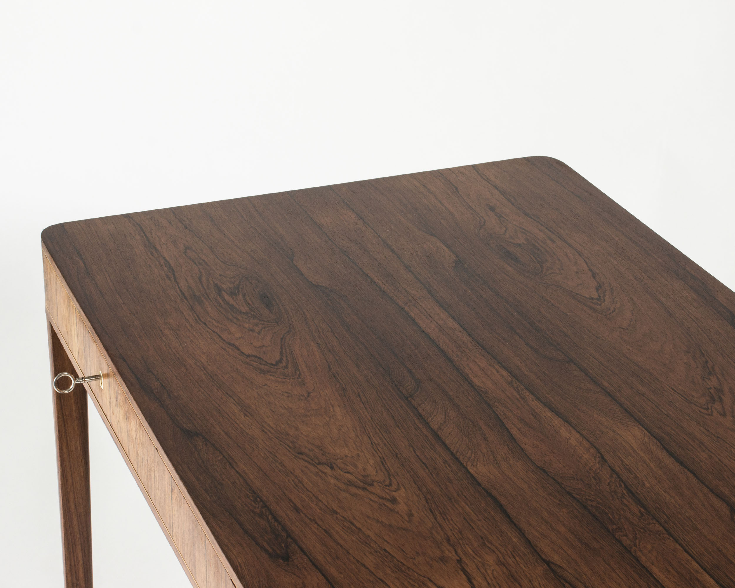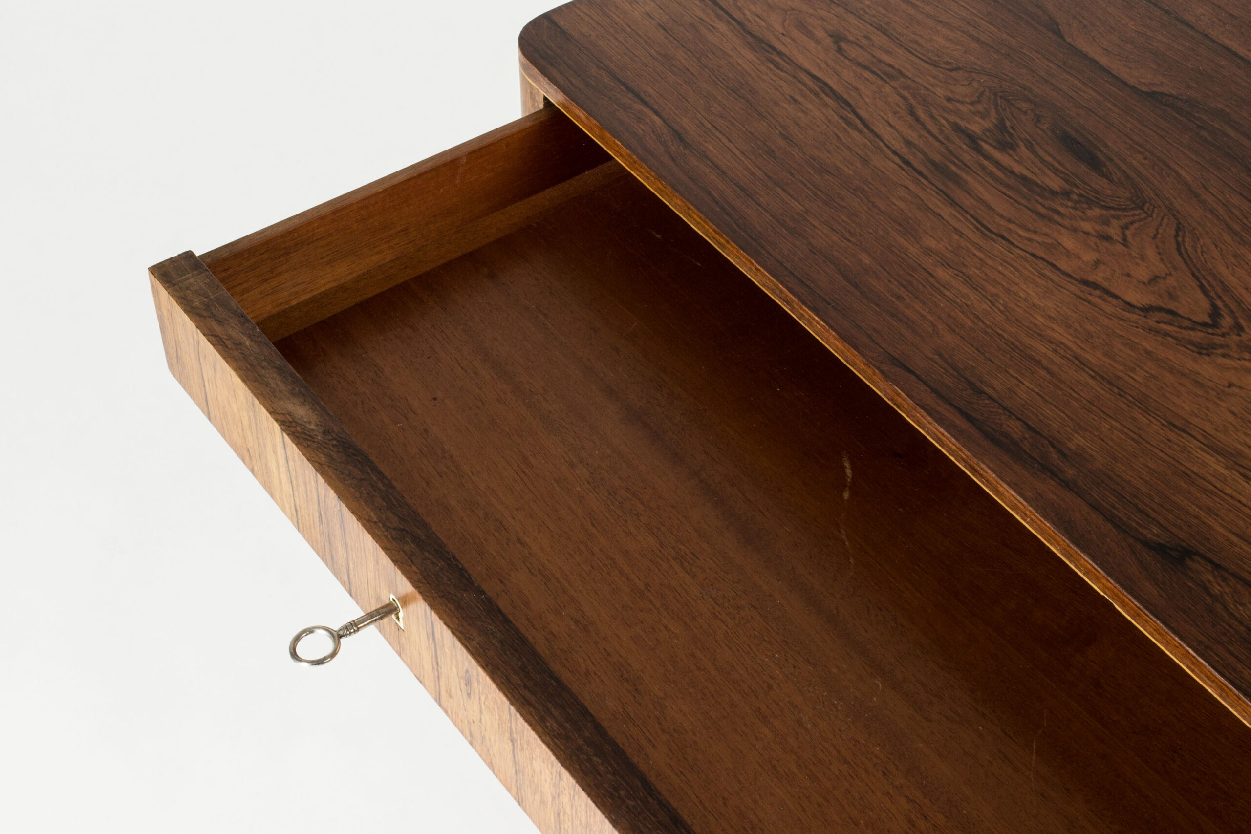 Beautiful small desk, built by master carpenter Hjalmar Jackson. Made from rosewood with elegant inlayed lines of lighter wood.
