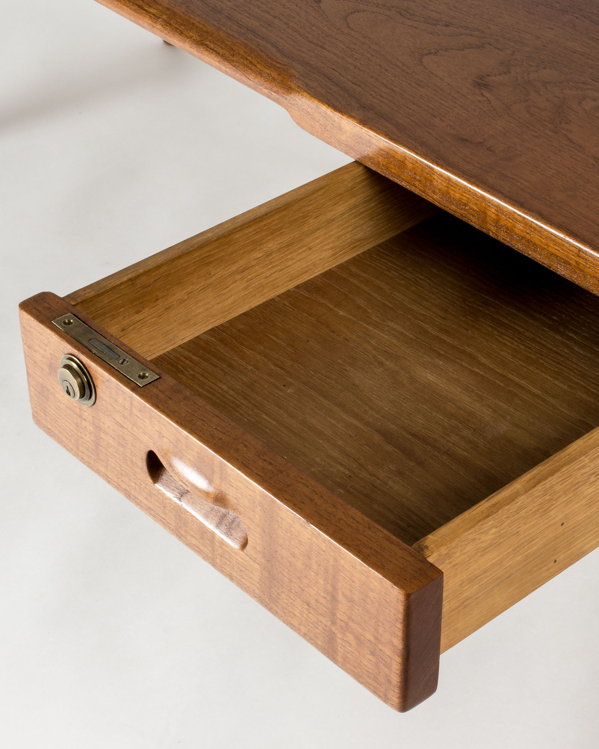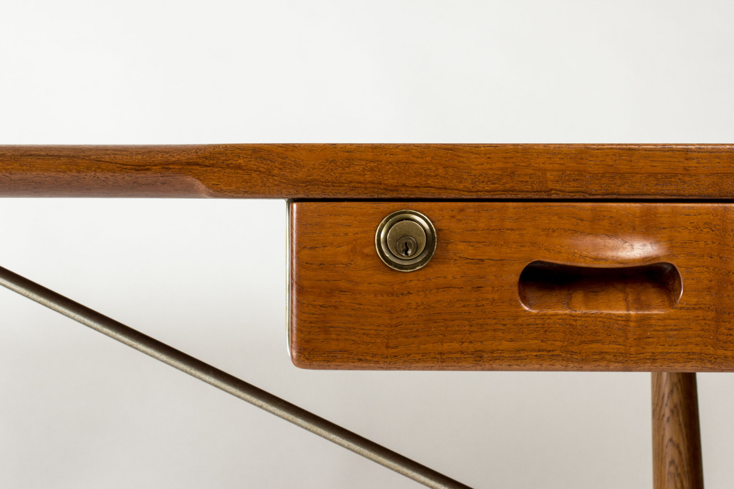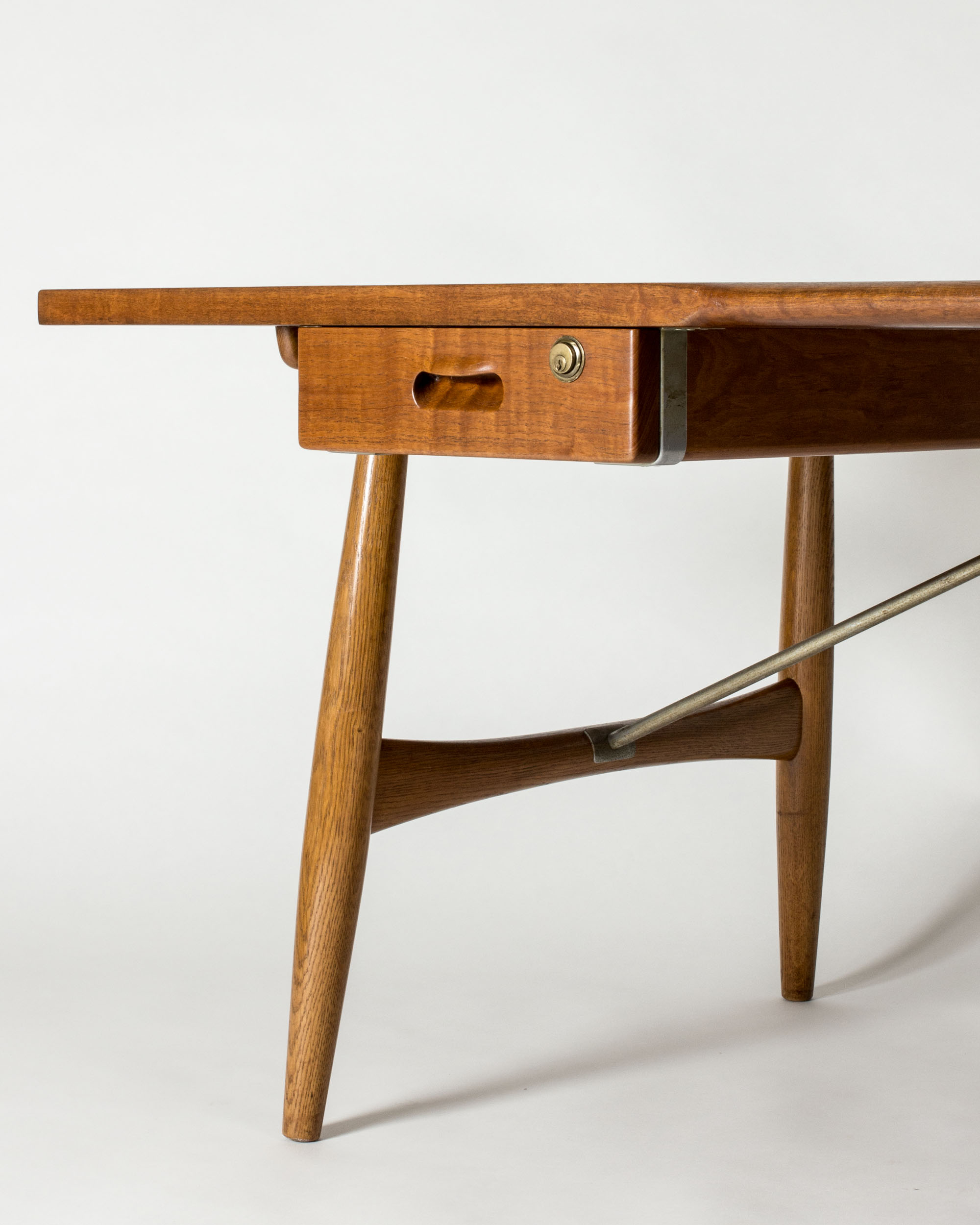 Amazing “Architect’s Desk”, model #JH571, by Hans J. Wegner, made from teak in a generous size. Subtly tapering oak legs supported by brass stretchers. Deep drawers with custom made locks. Rare model with sculpted wooded handles, made during a few years in the 1960s.