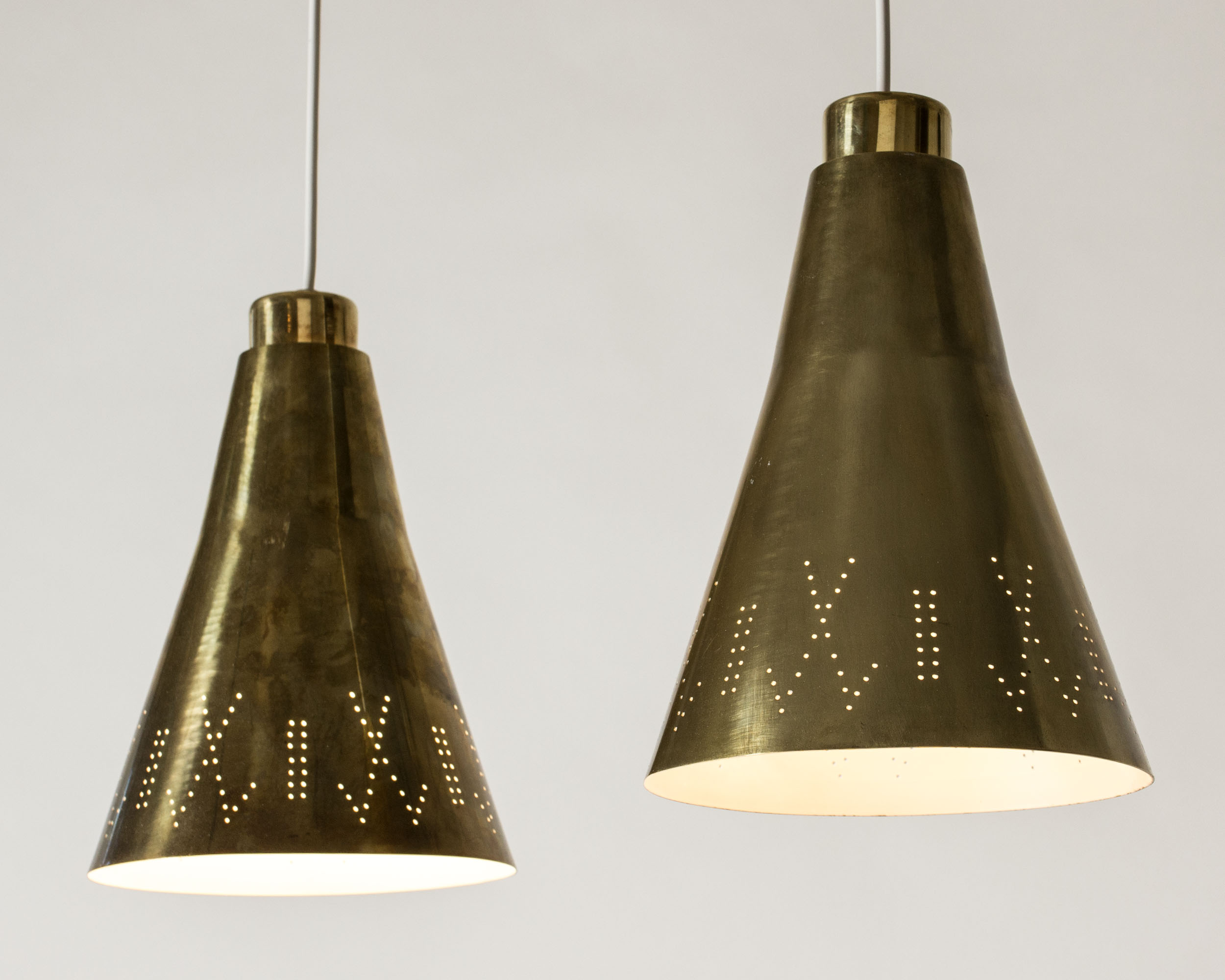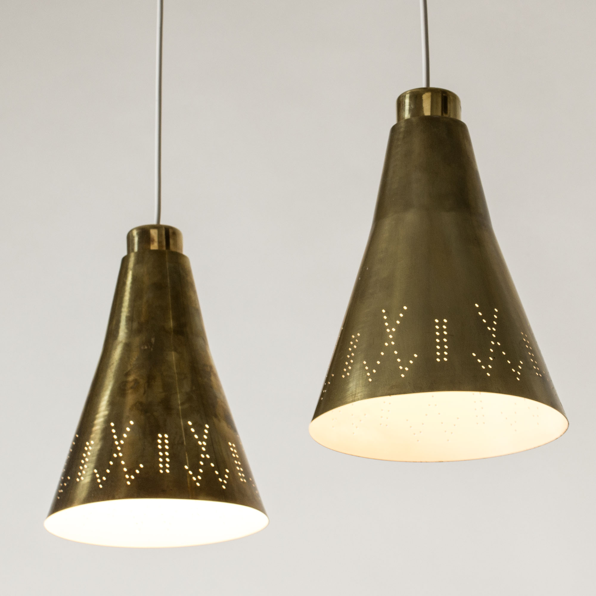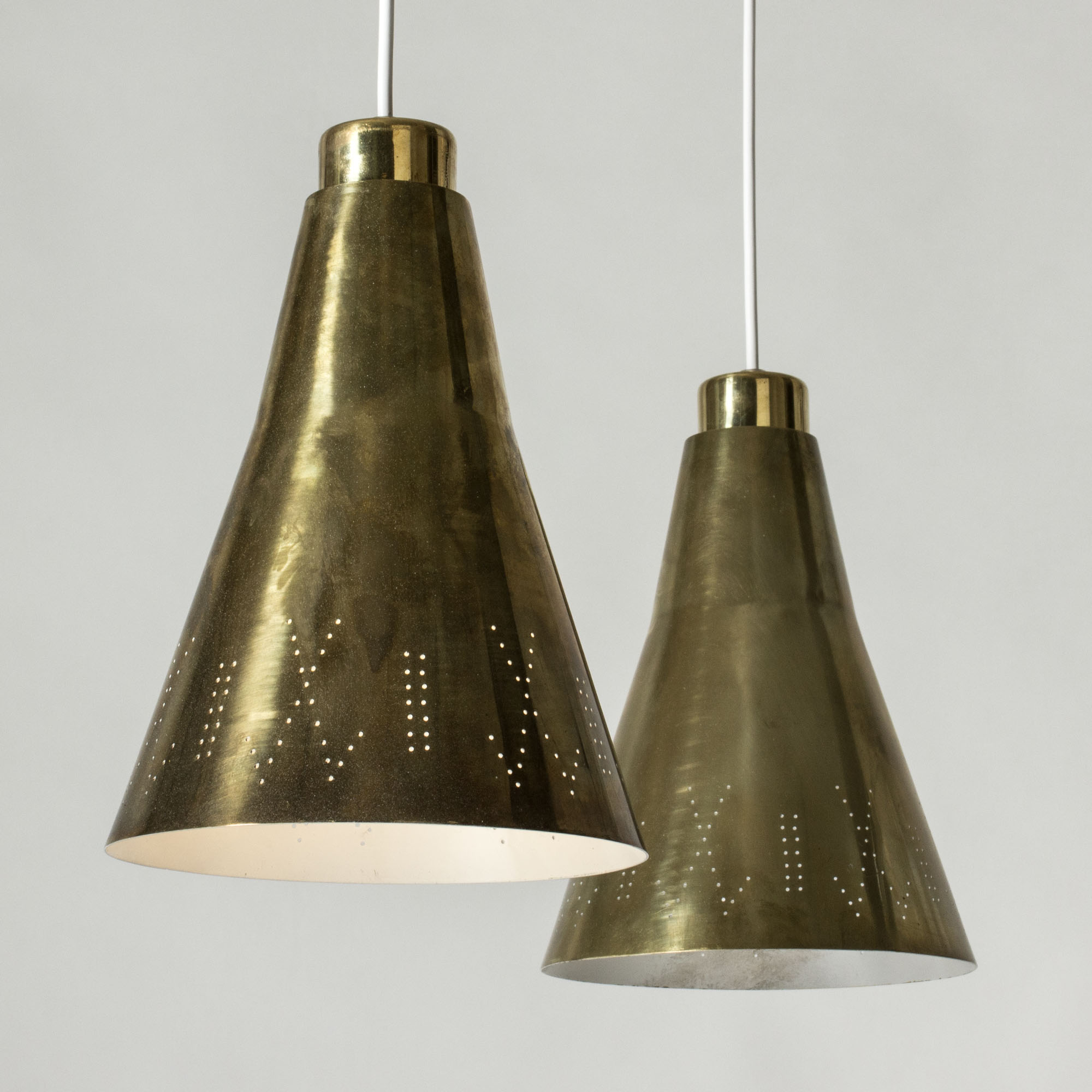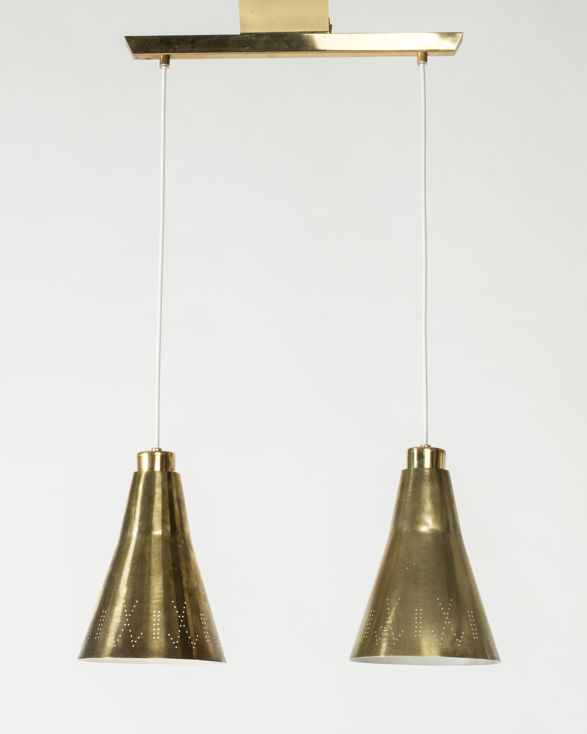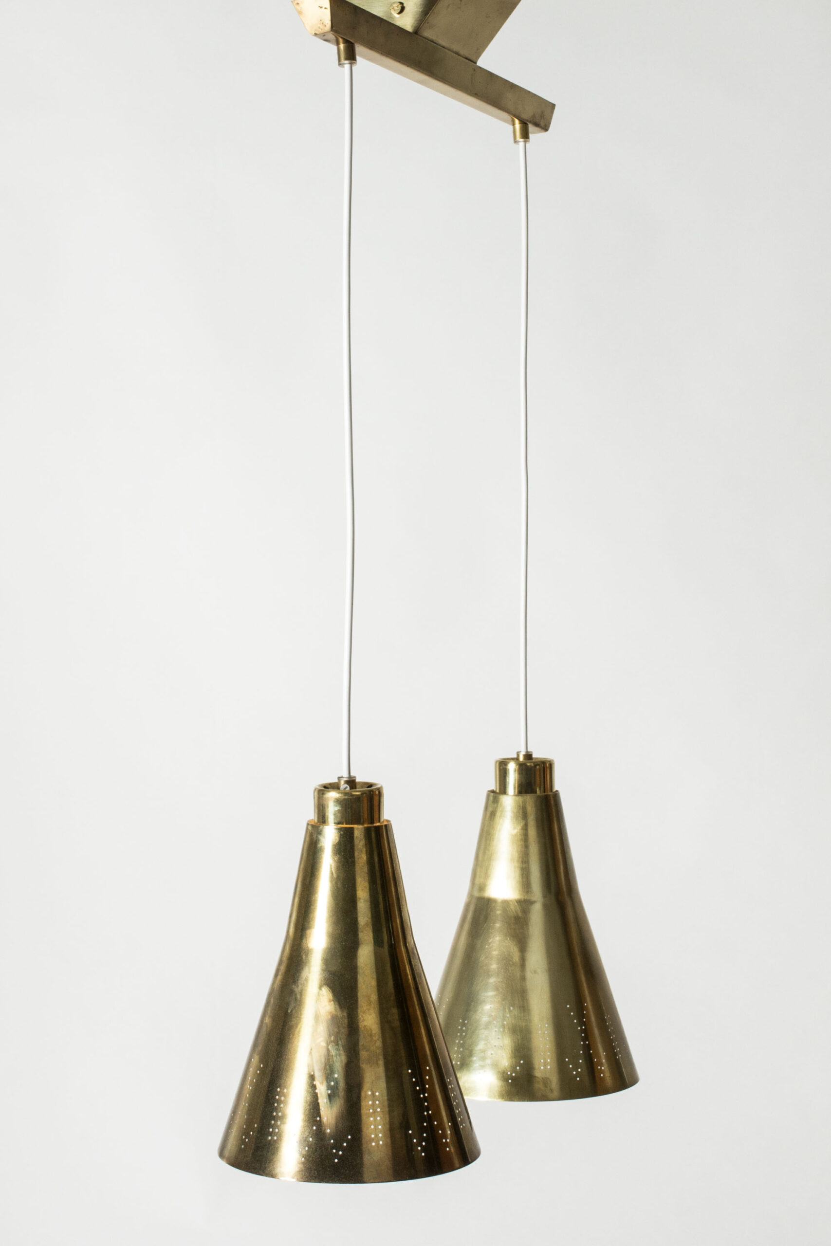 Cool brass ceiling light by Paavo Tynell, with two conical shades perforated with small holes in a decorative graphic pattern. Suspended from a brass ceiling cup that hides the cords.