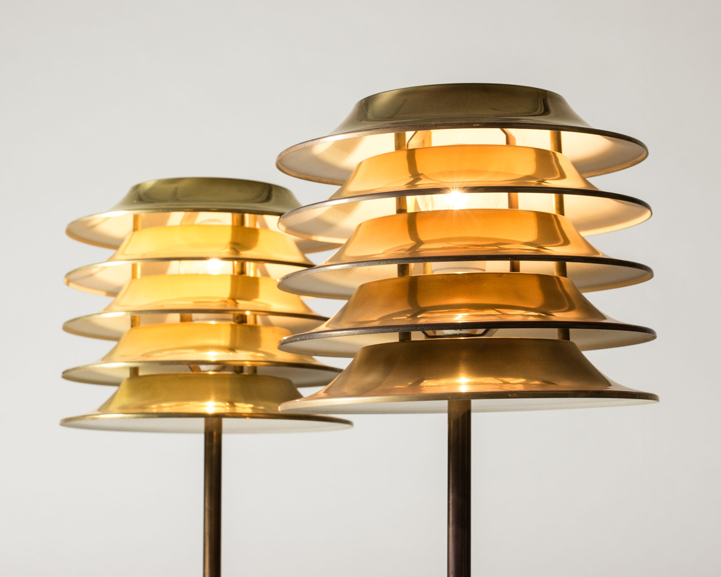 Pair of brass table lamps by Kai Ruokonen, with large lamella lamp shades. Emanate beautiful, warm light when lit.