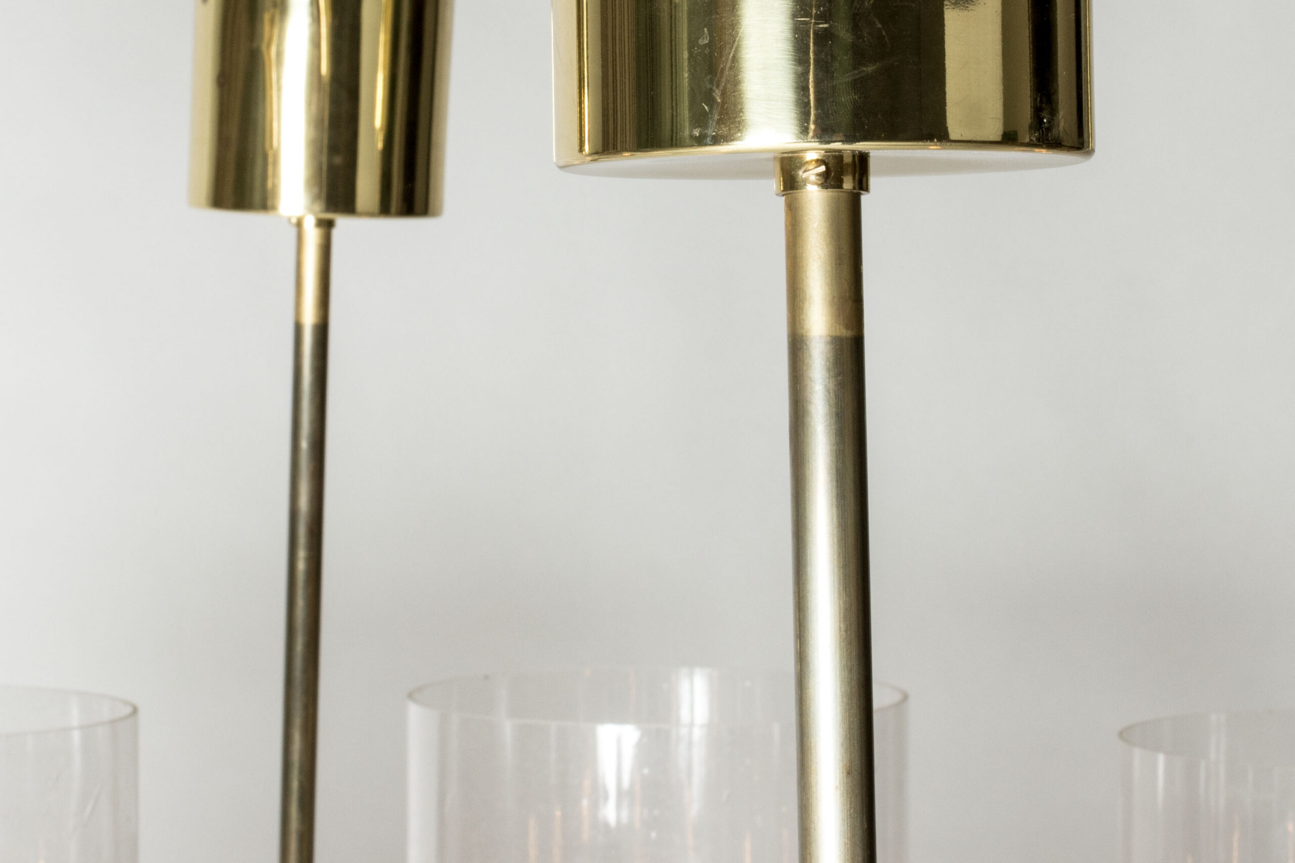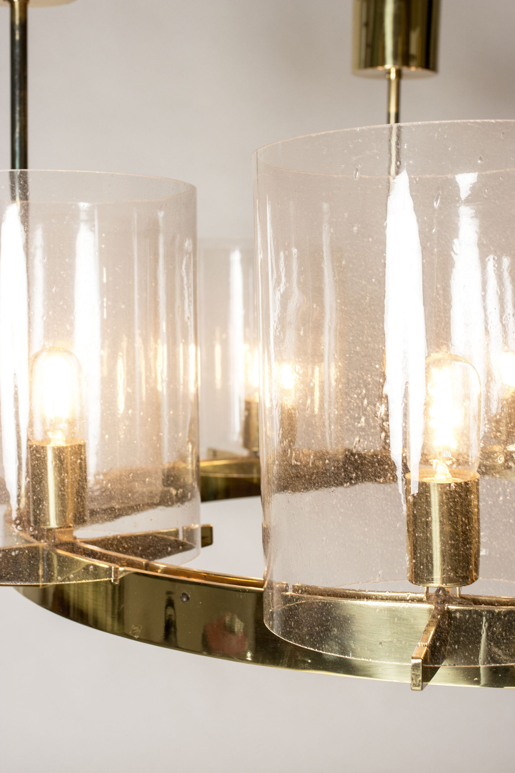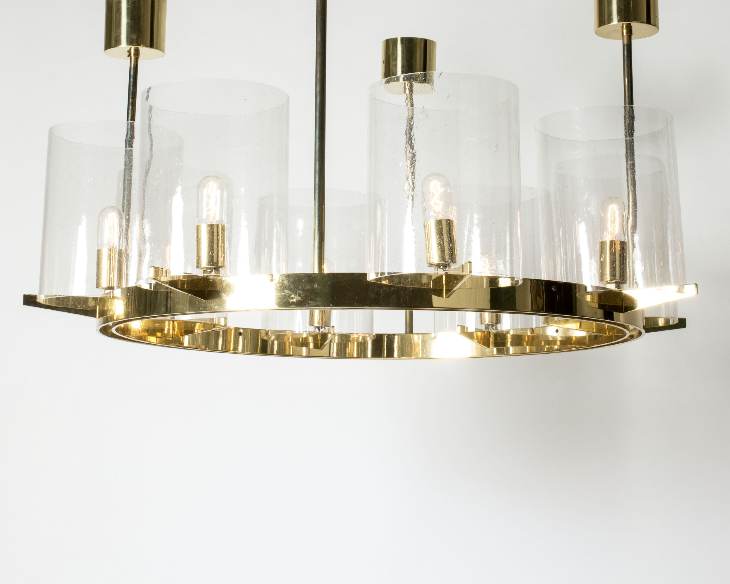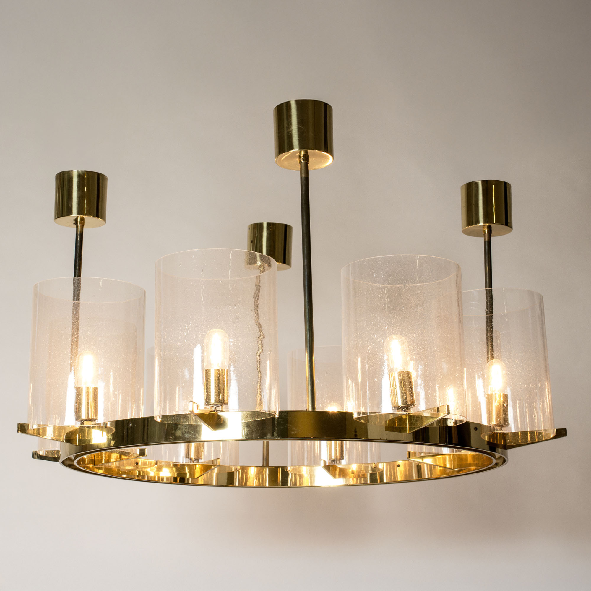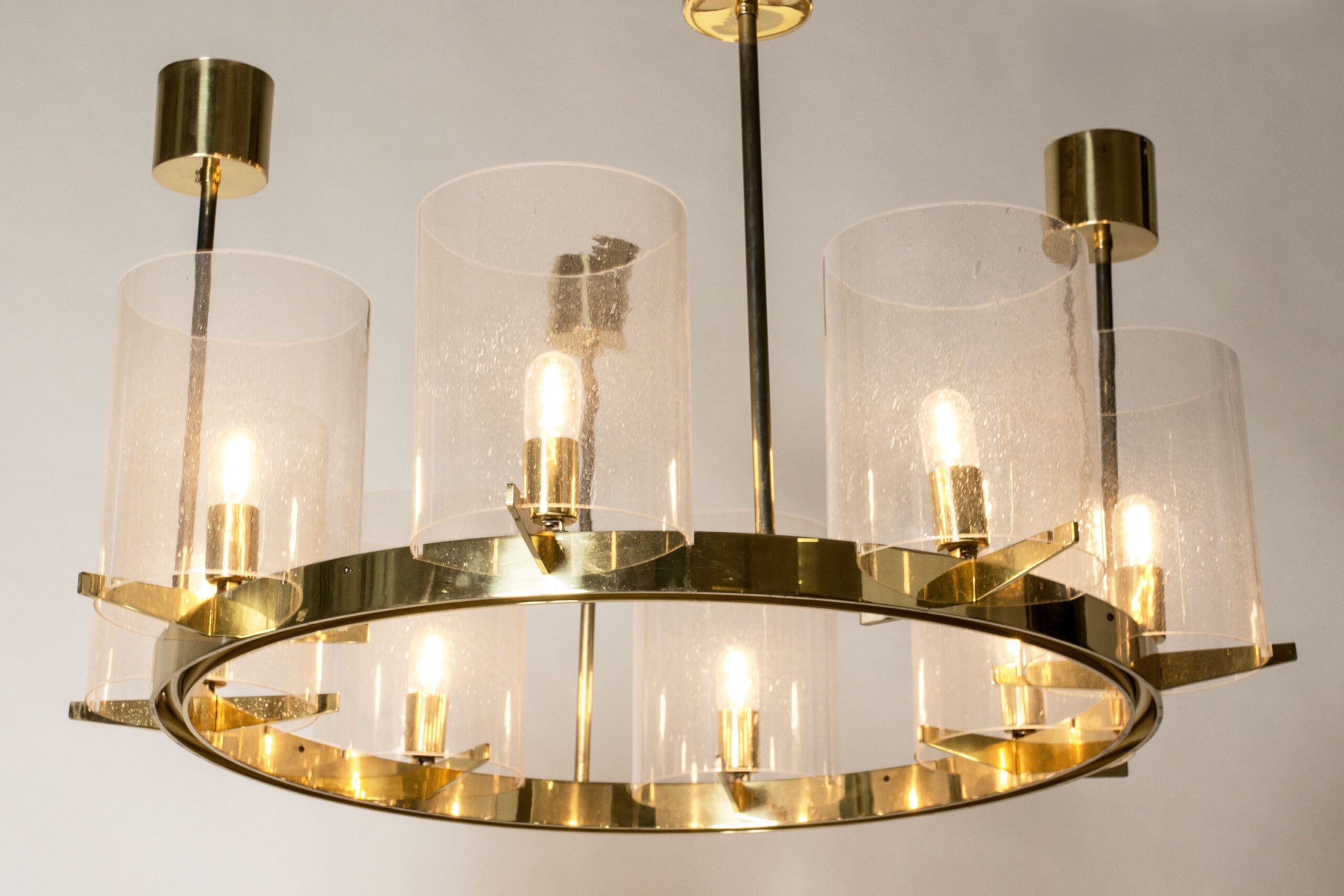 Striking, oversized chandelier by Hans-Agne Jakobsson, made from brass with eight, large cylinder shaped glass shades. Bubbles in the glass giving a watery expression. Cool, brutalist design.