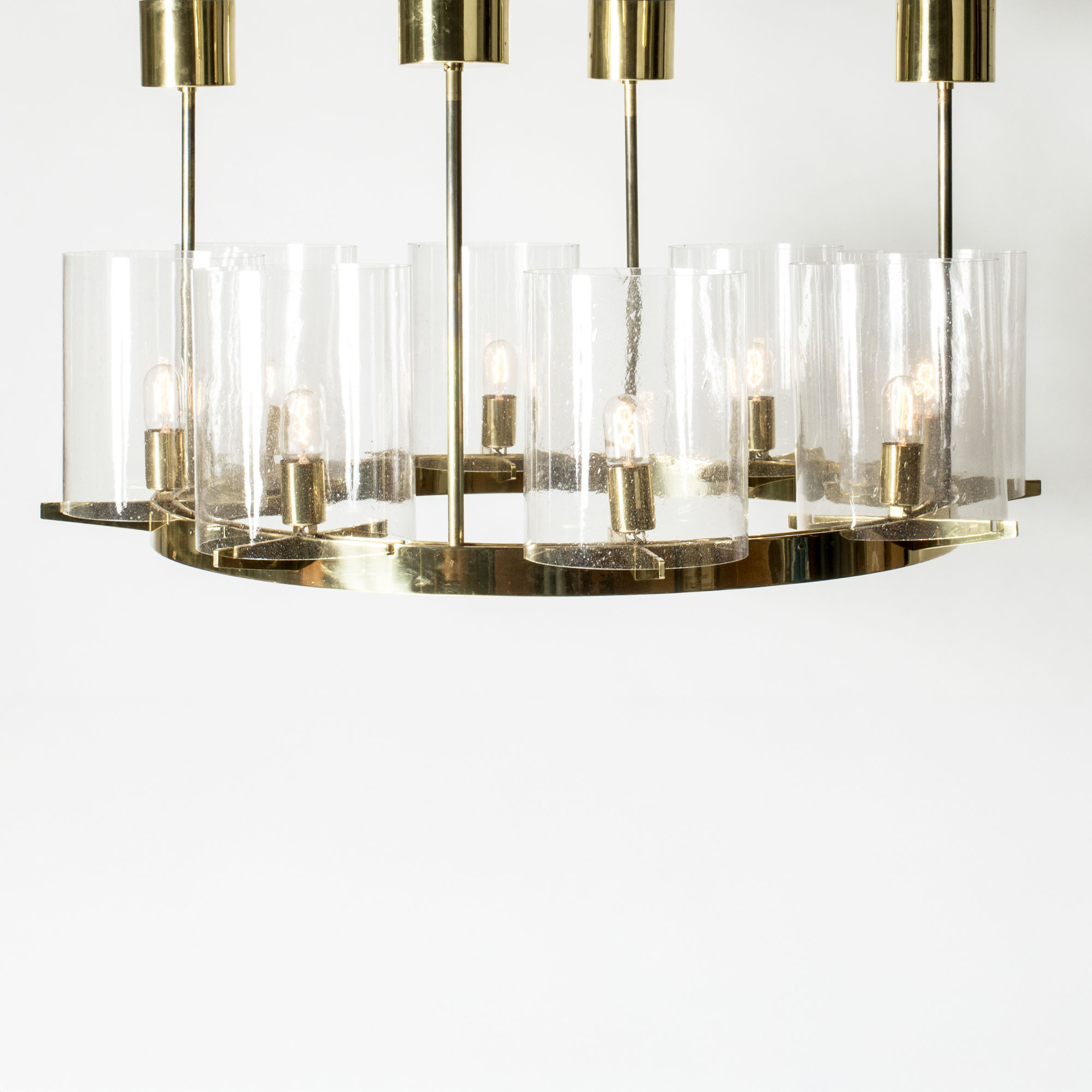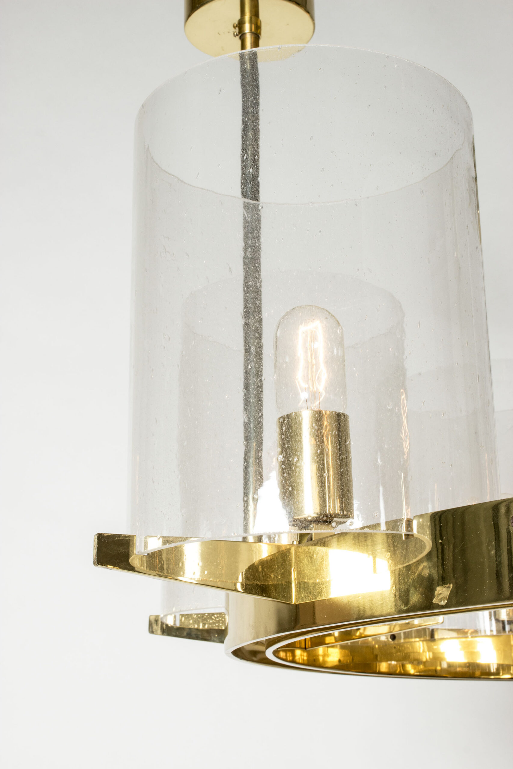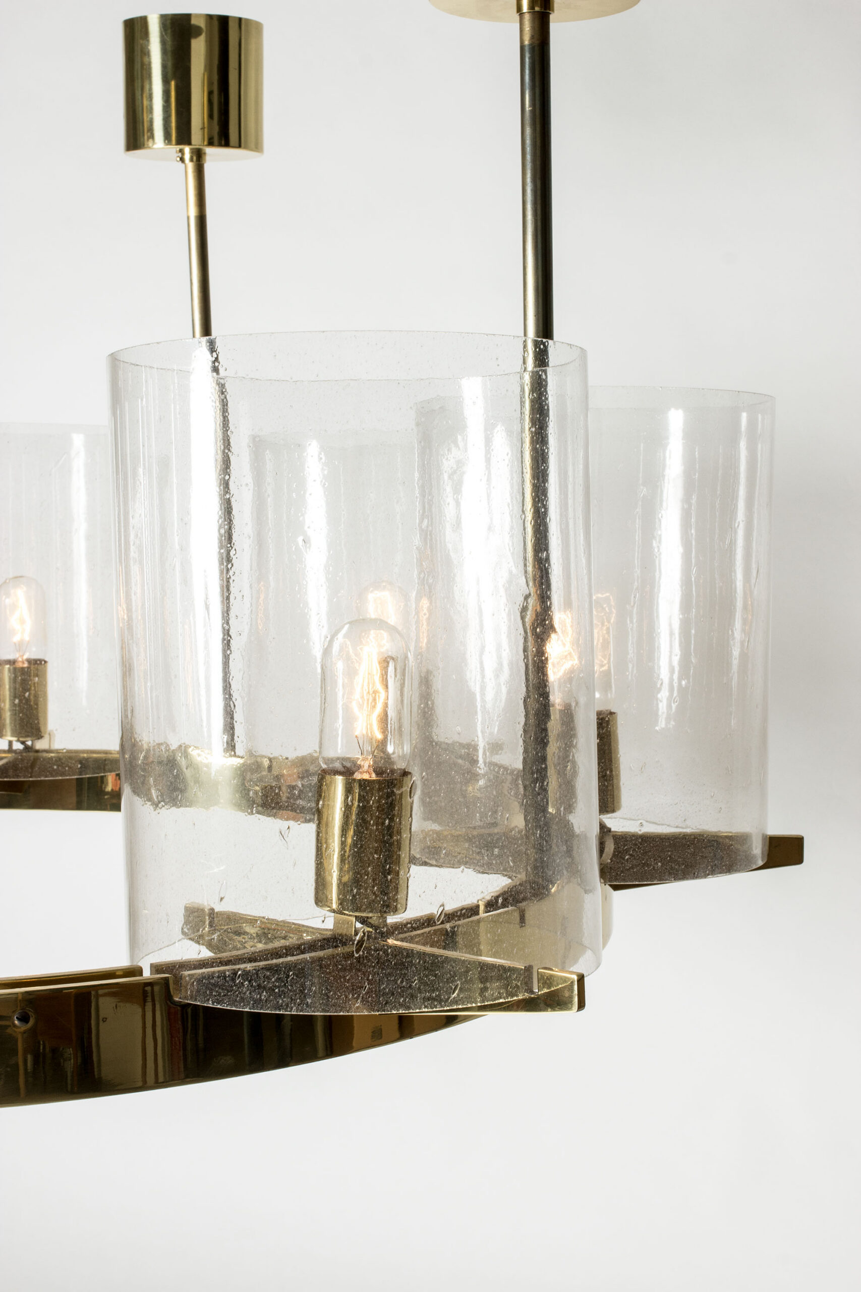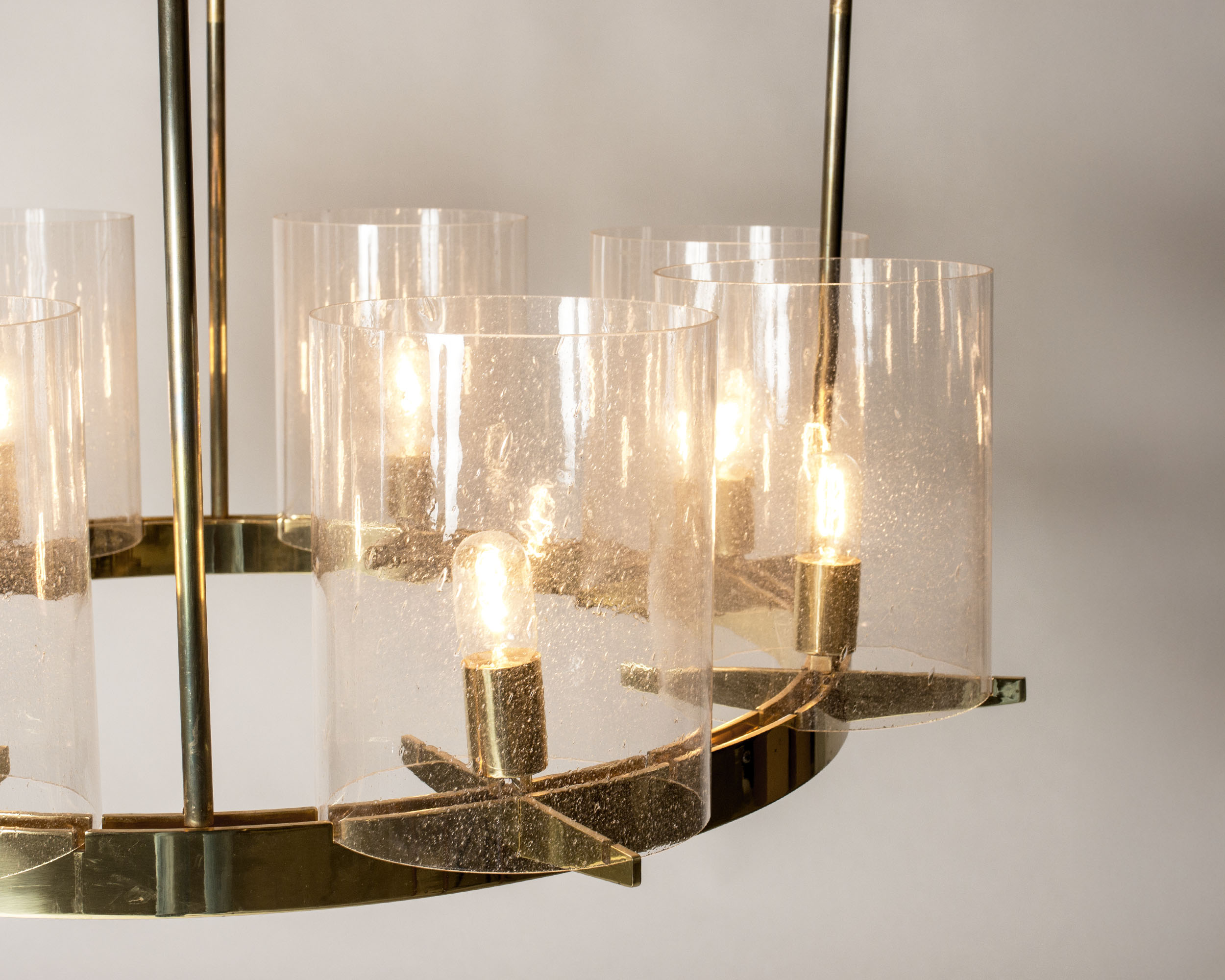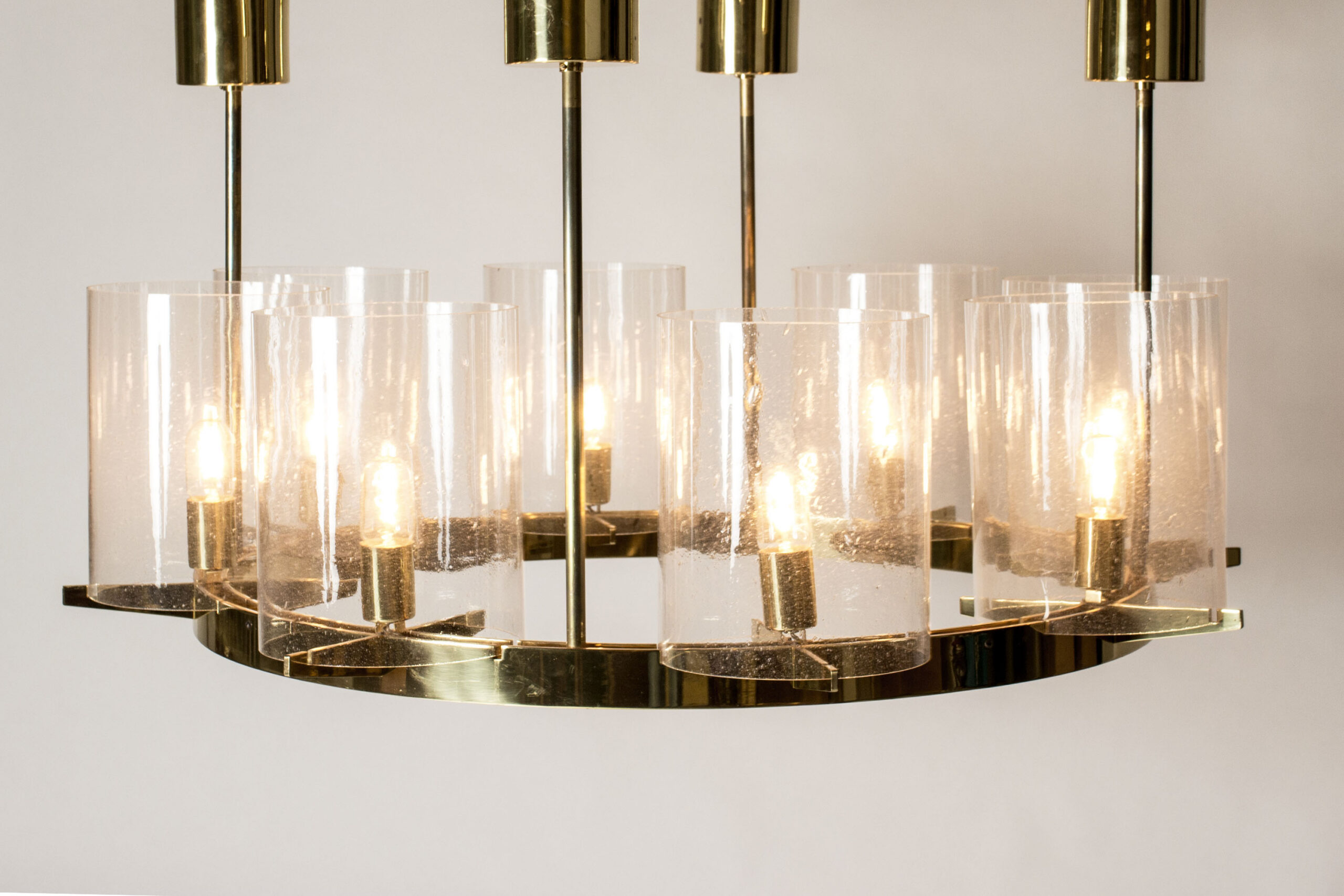 Striking, oversized chandelier by Hans-Agne Jakobsson, made from brass with eight, large cylinder shaped glass shades. Bubbles in the glass giving a watery expression. Cool, brutalist design.