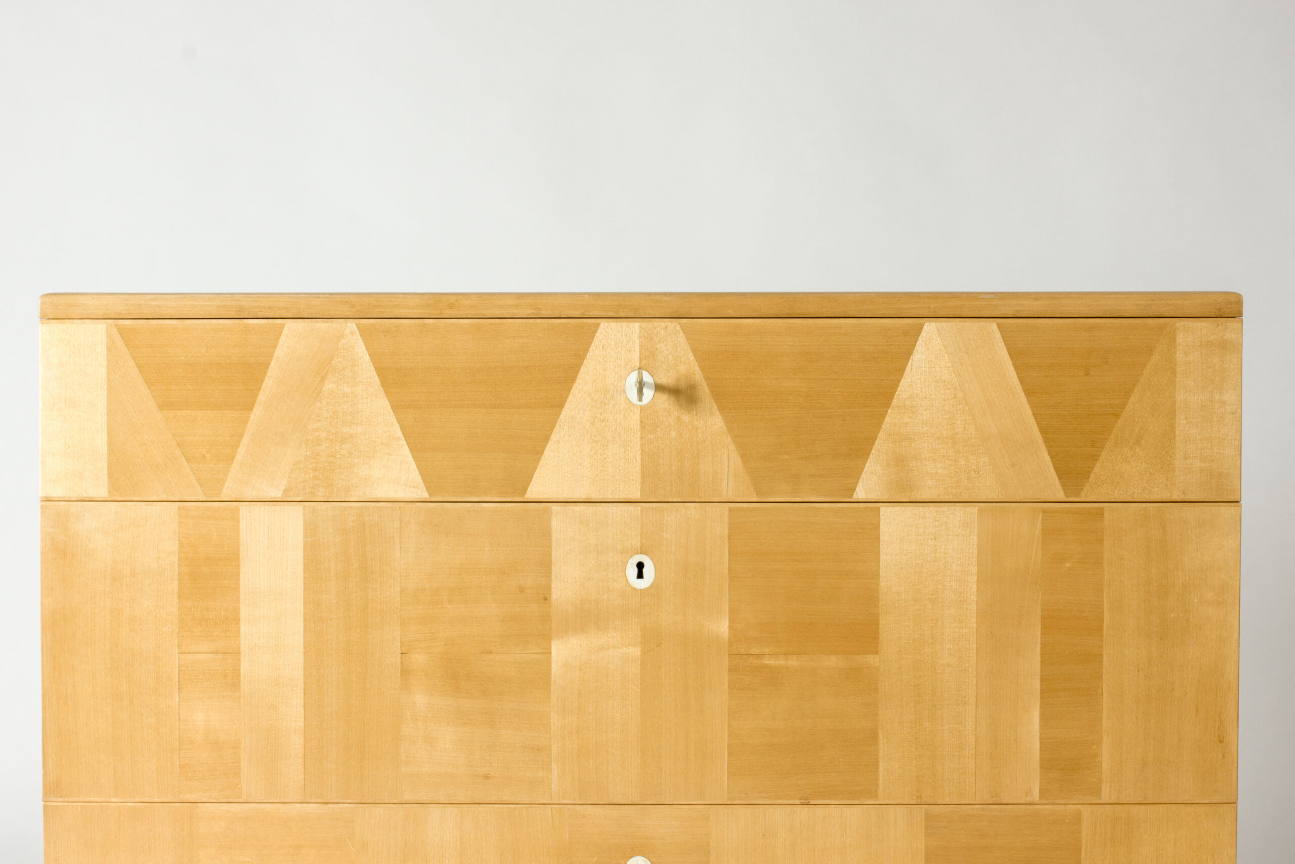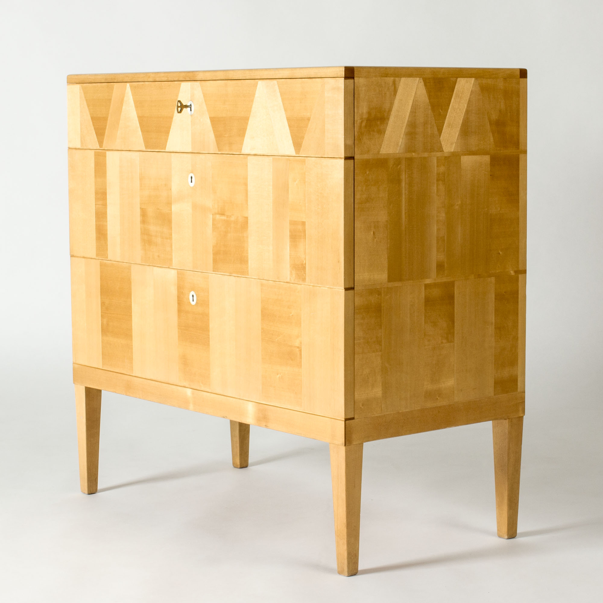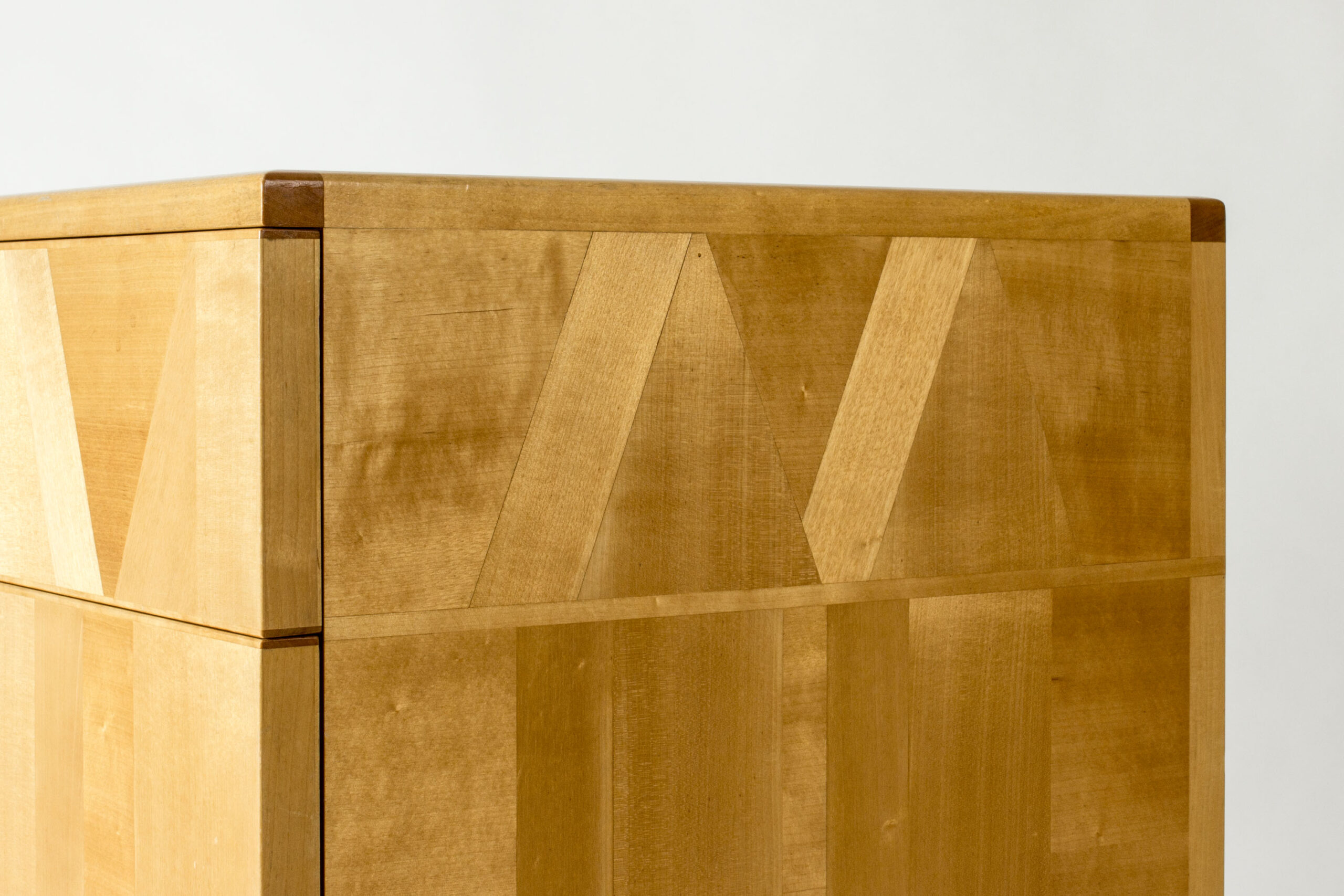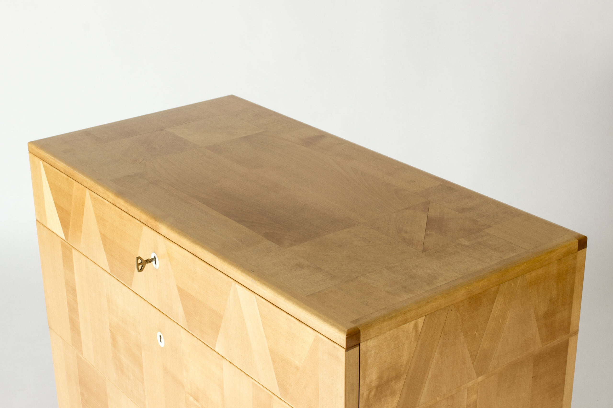 Lovely chest of drawers by Carl Malmsten, made from birch with clean lines. Veneer laid in a striking graphic pattern.