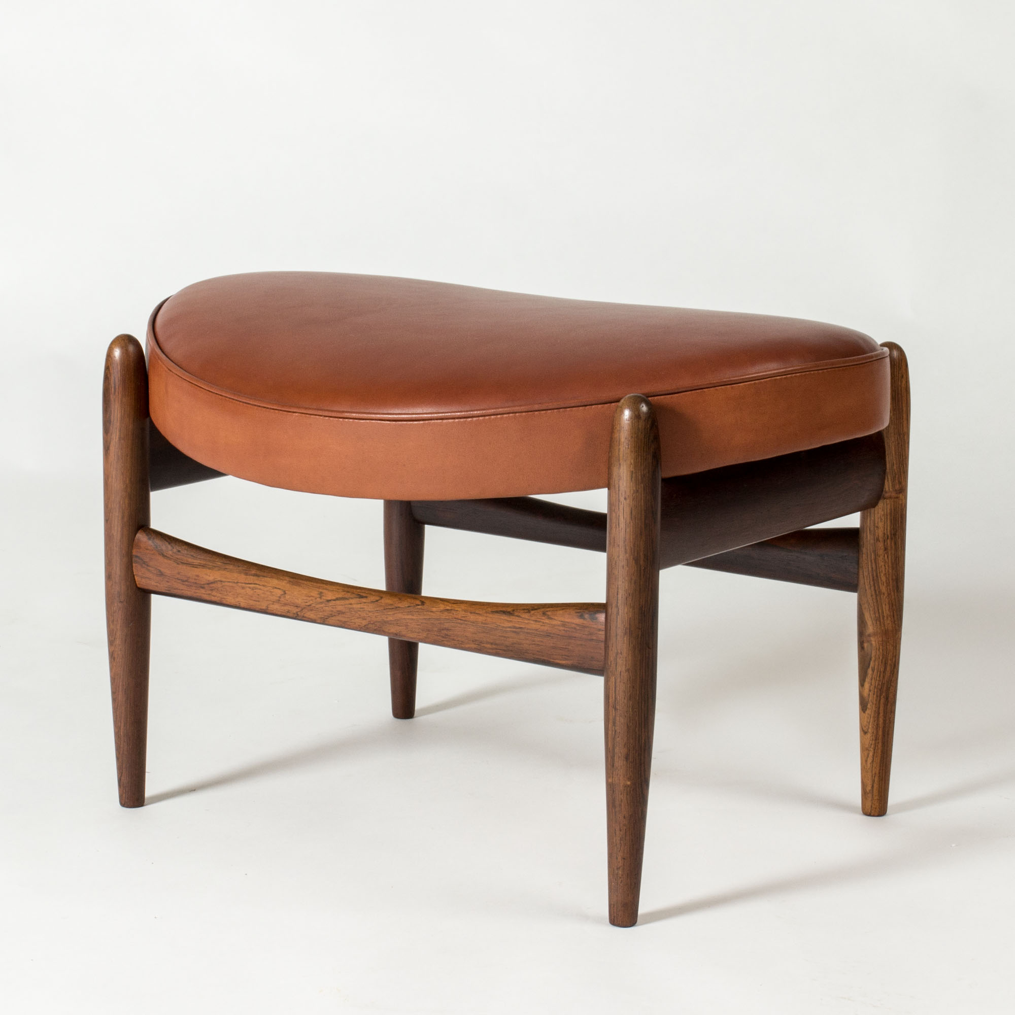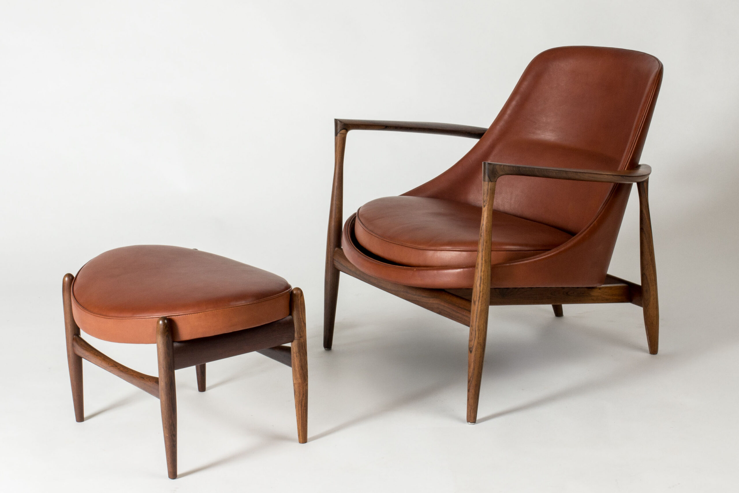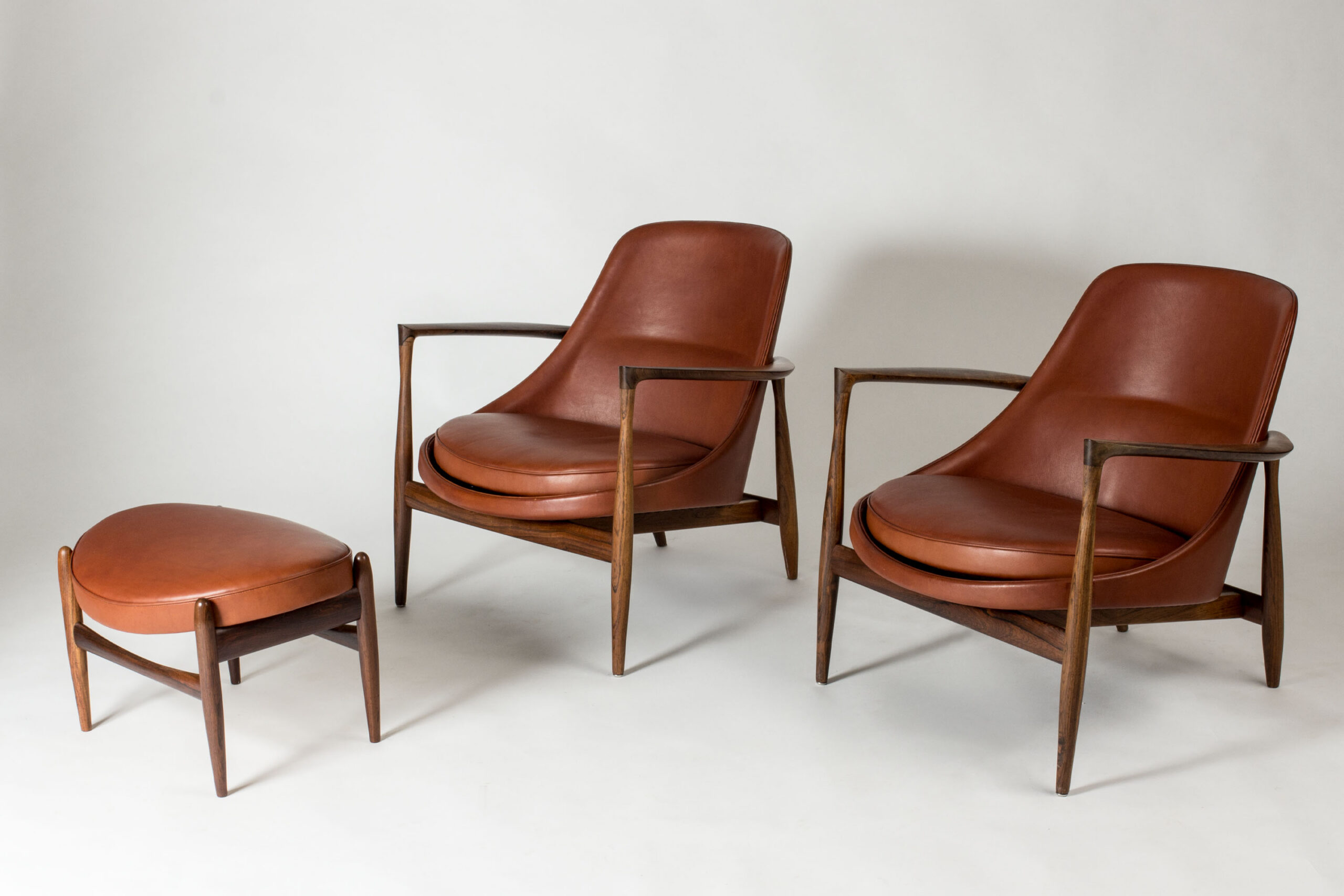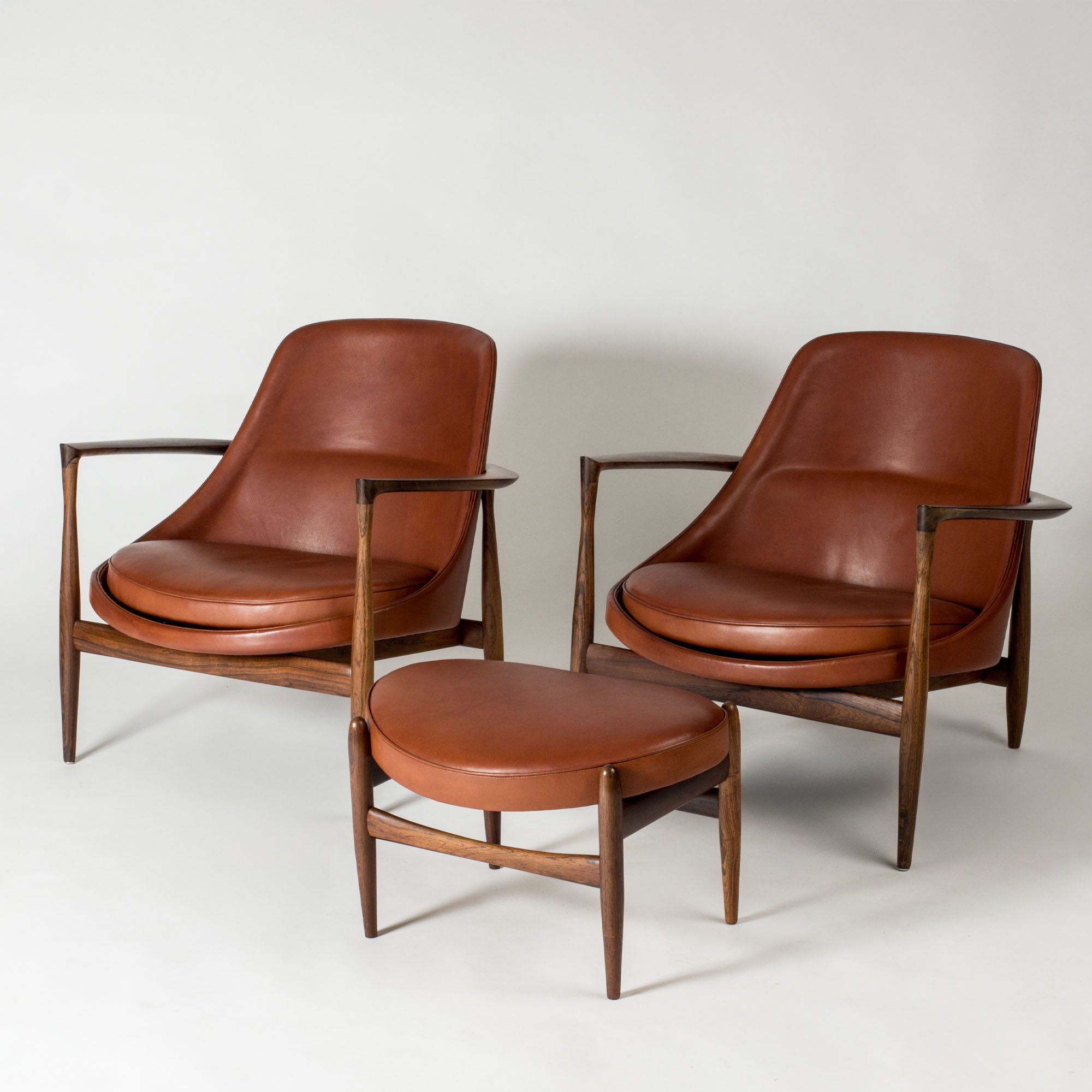 Pair of beautiful “Elizabth” lounge chairs and footstool by Ib Kofod Larsen, made with rosewood frames and beautiful, smooth cognac colored leather. Iconic design with great silhouettes and materials, made with vegetable-tanned leather.