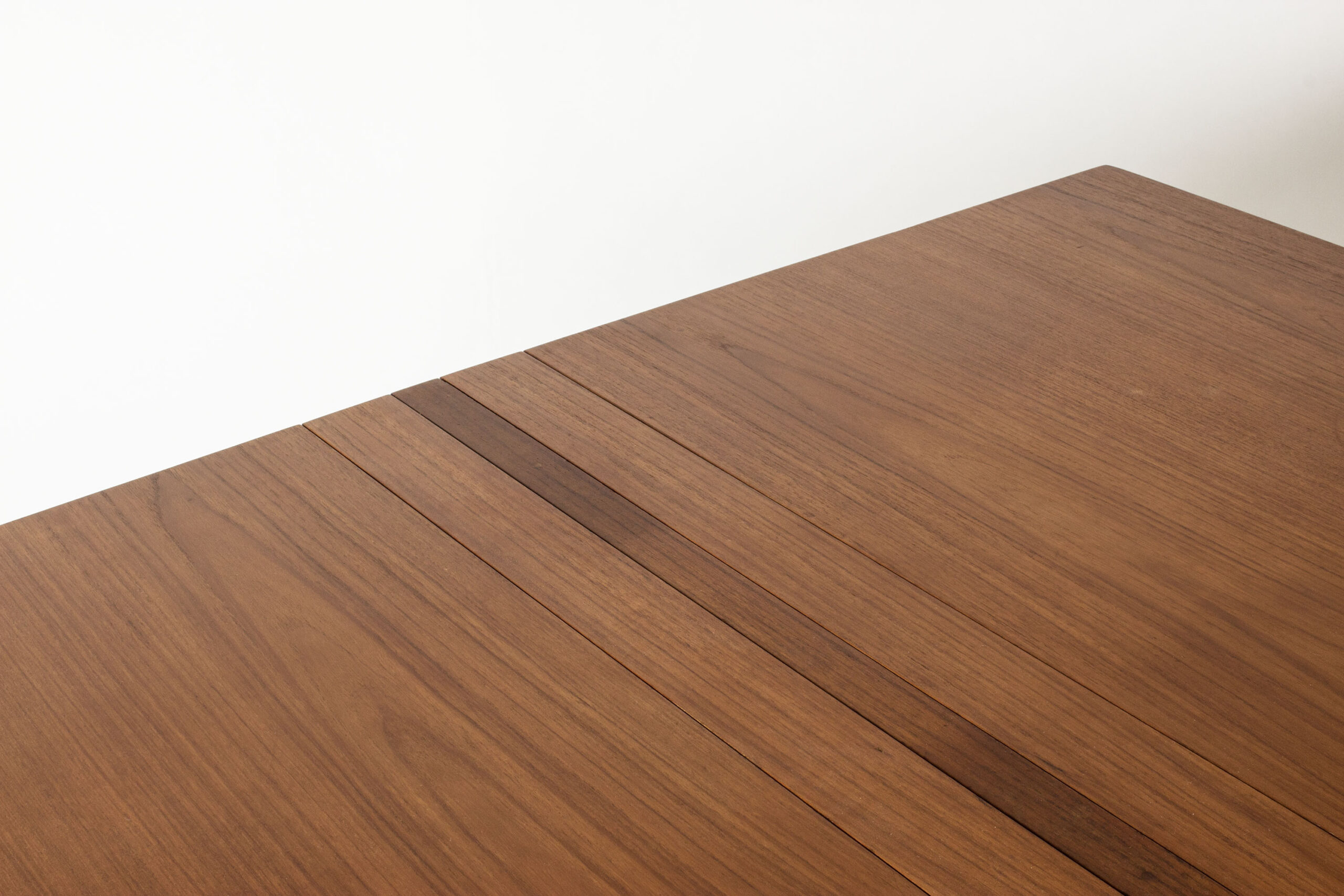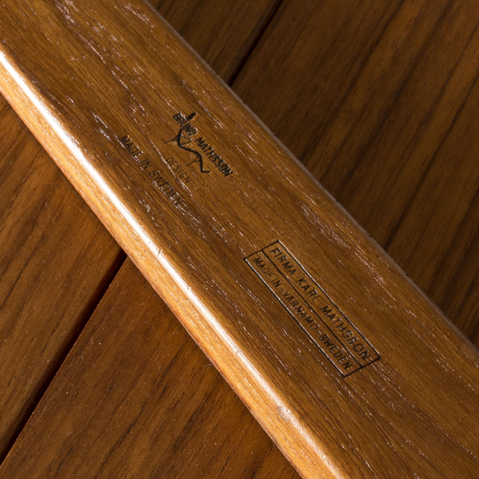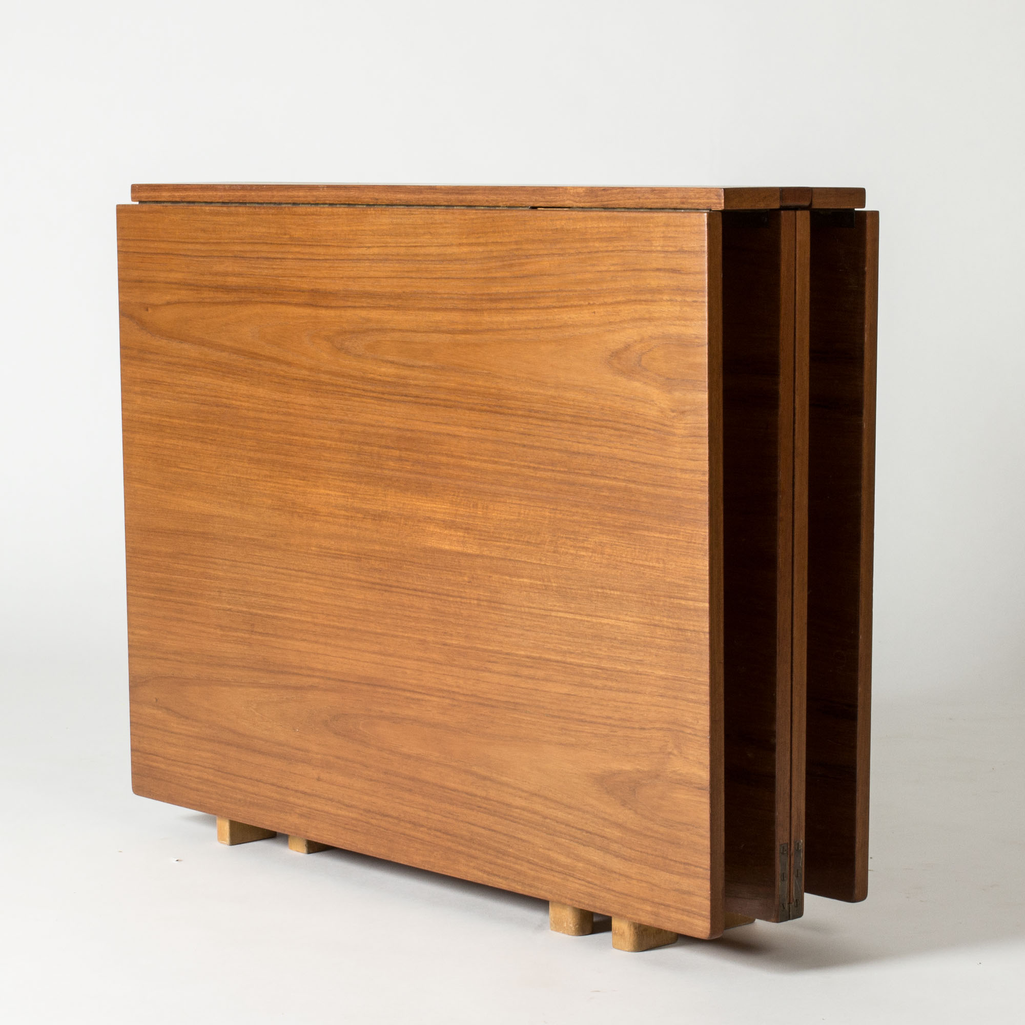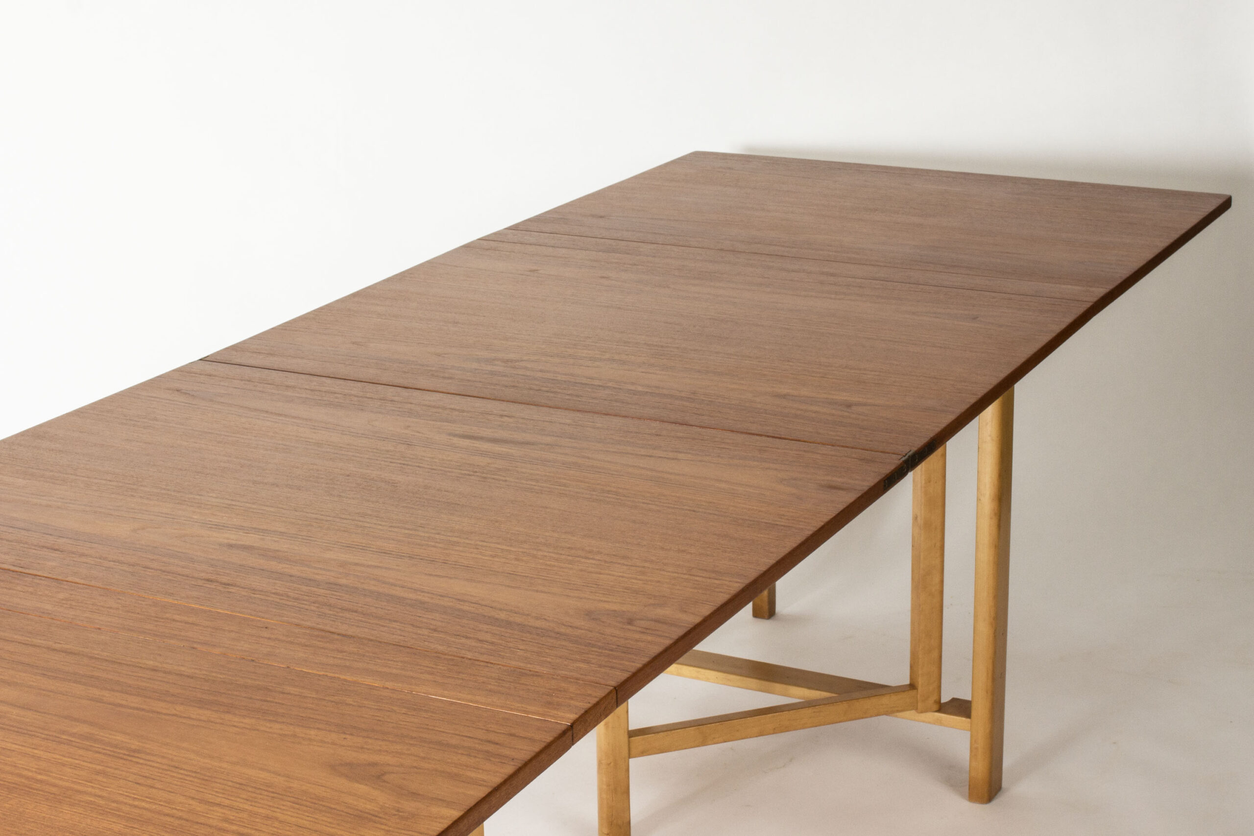 “Maria” dining table by Bruno Mathsson, made with a teak table top and beech legs. Ingenious, versatile design classic that can be adjusted to different lengths. Can be transformed from a table for two or a family of four table into a dining table that seats ten people comfortably. When completely folded it is easy to store.