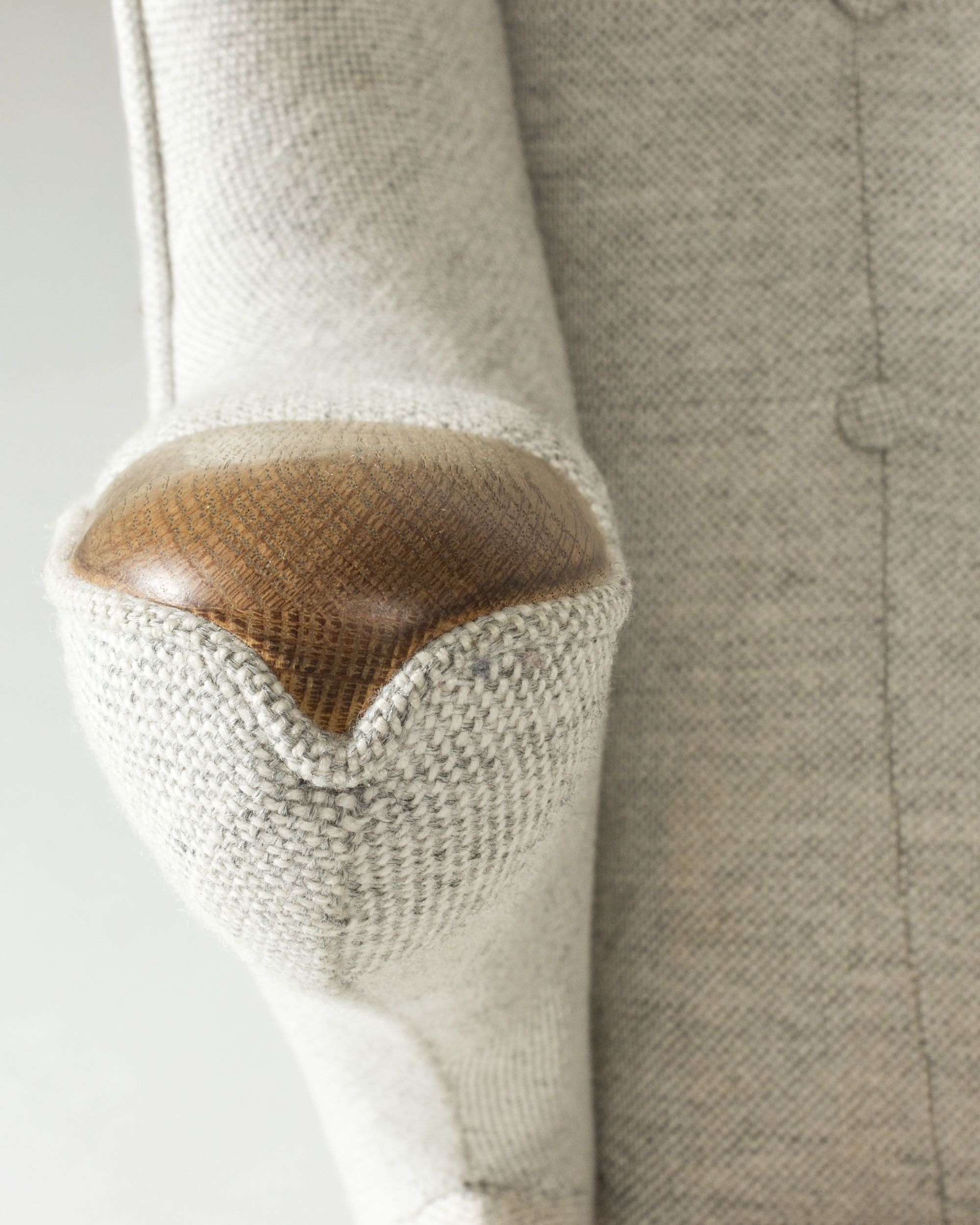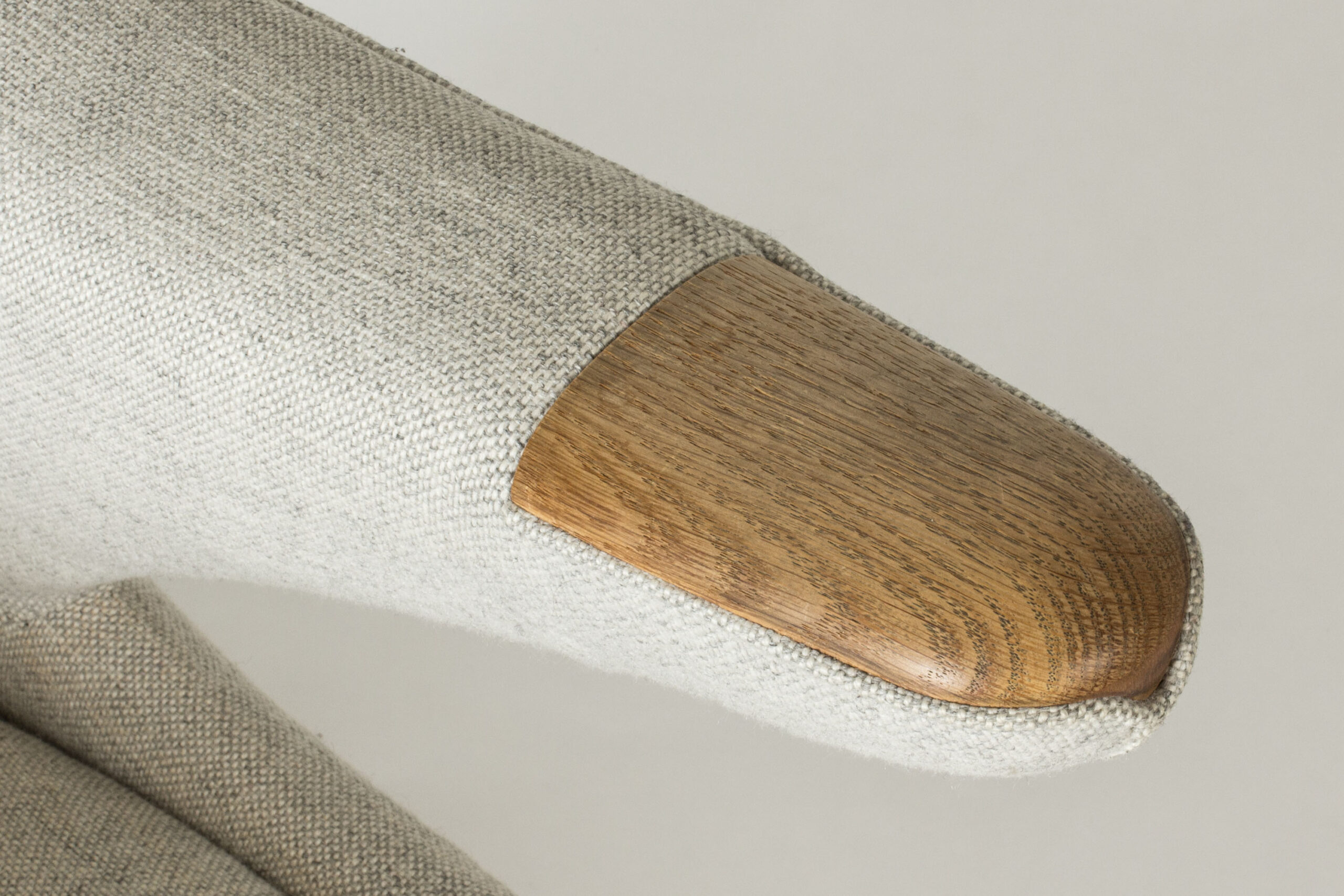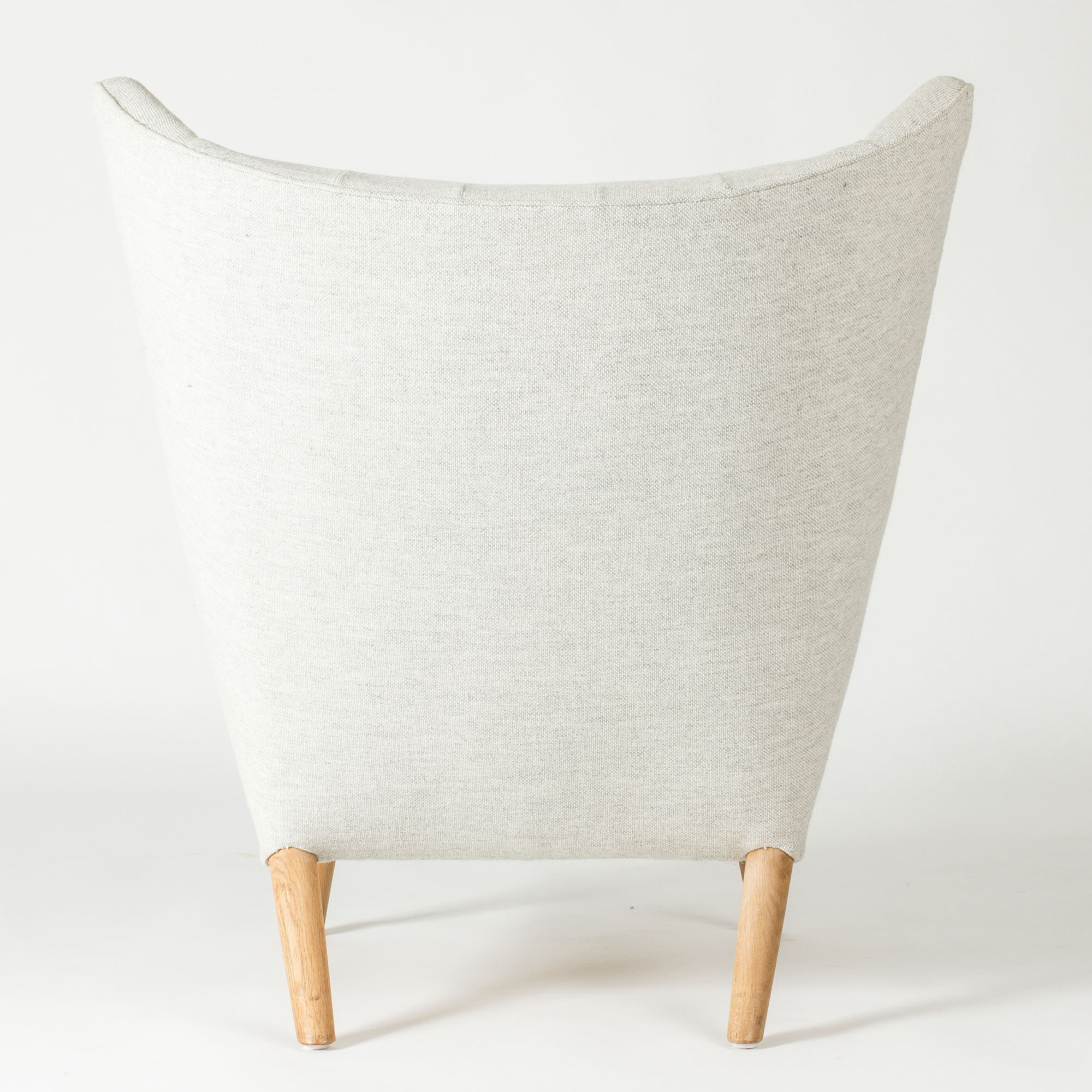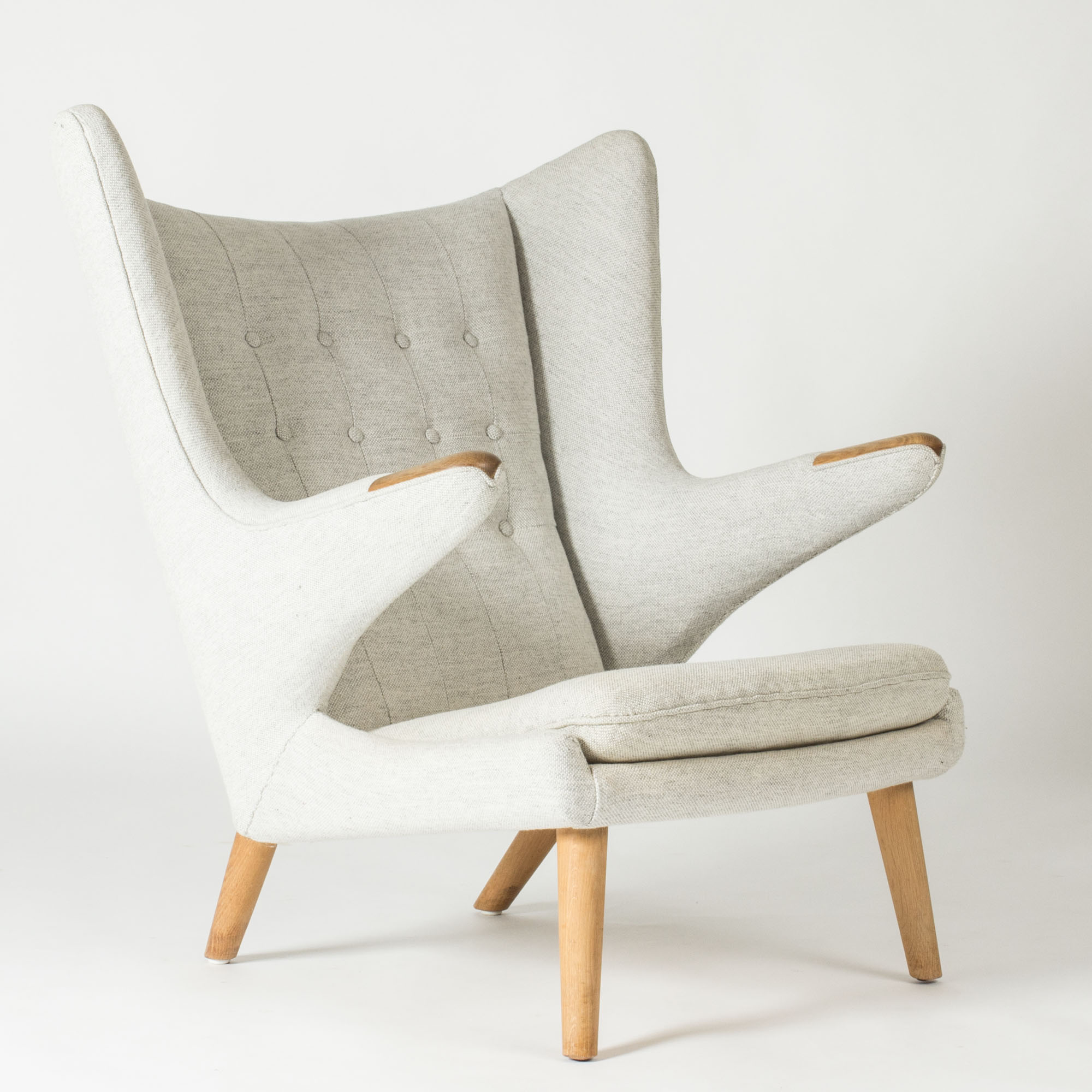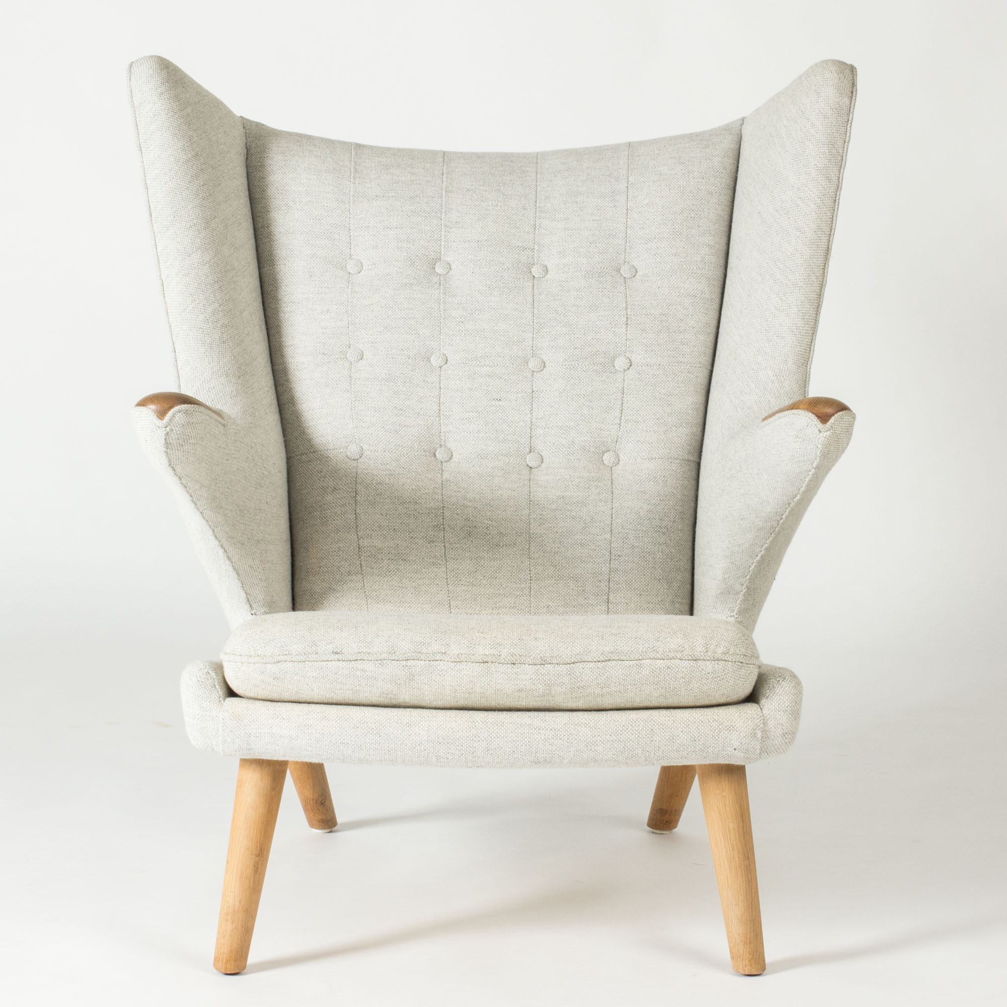 Iconic “Papa Bear” lounge chair by Hans J. Wegner, in a wide, comfortable design upholstered in light grey Kvadrat fabric. Handles with oak details at the ends.
