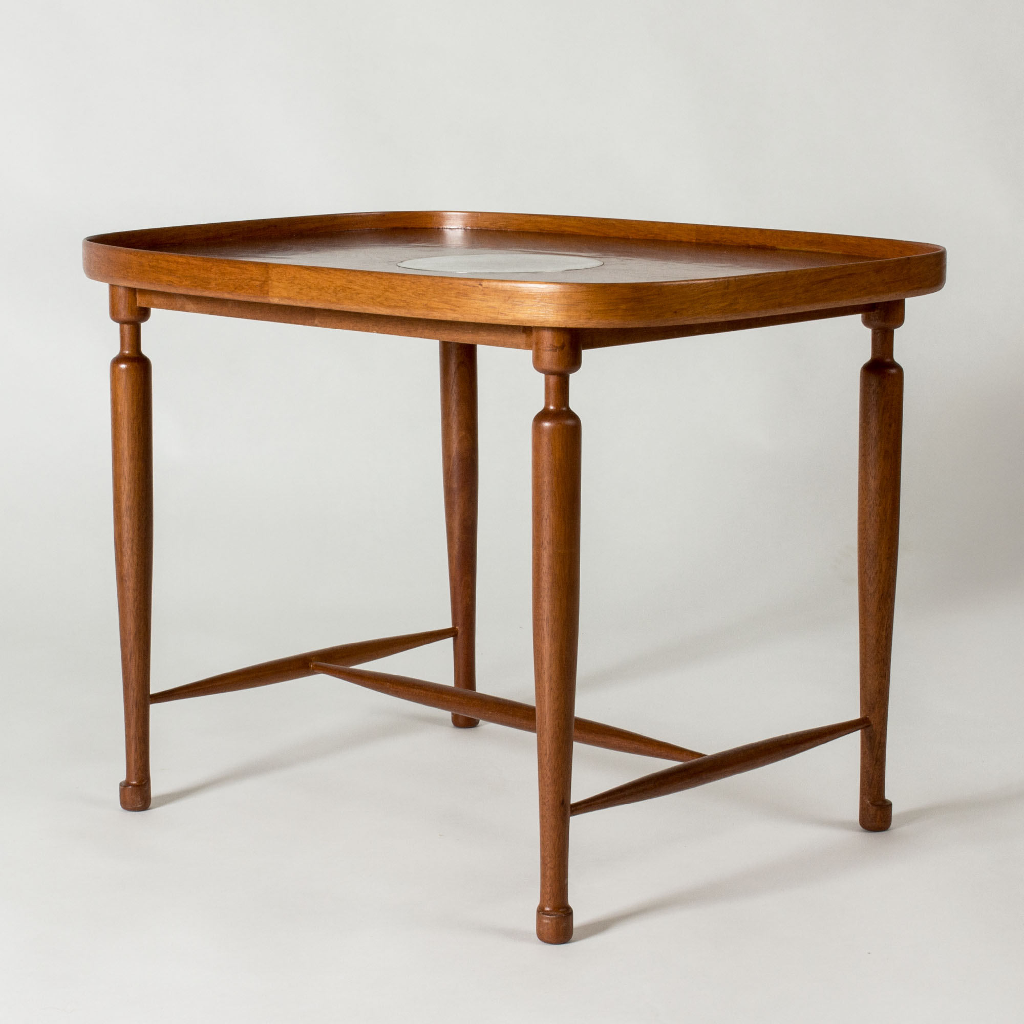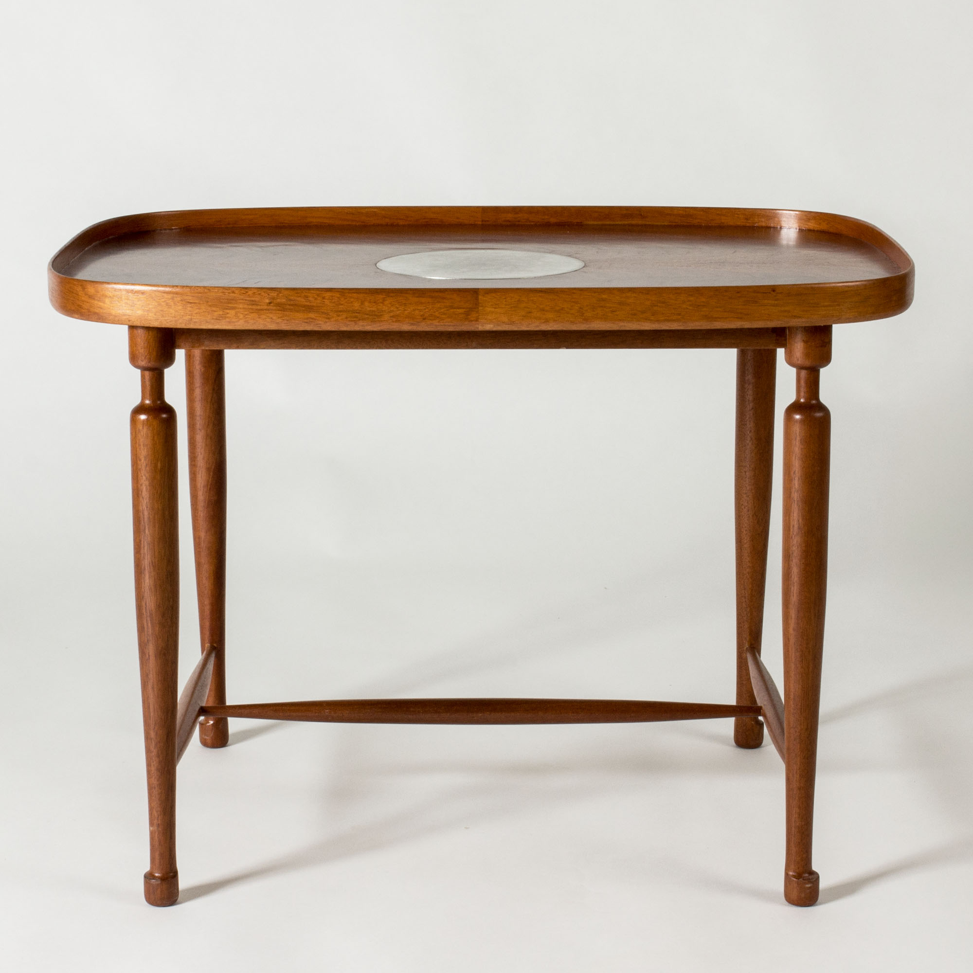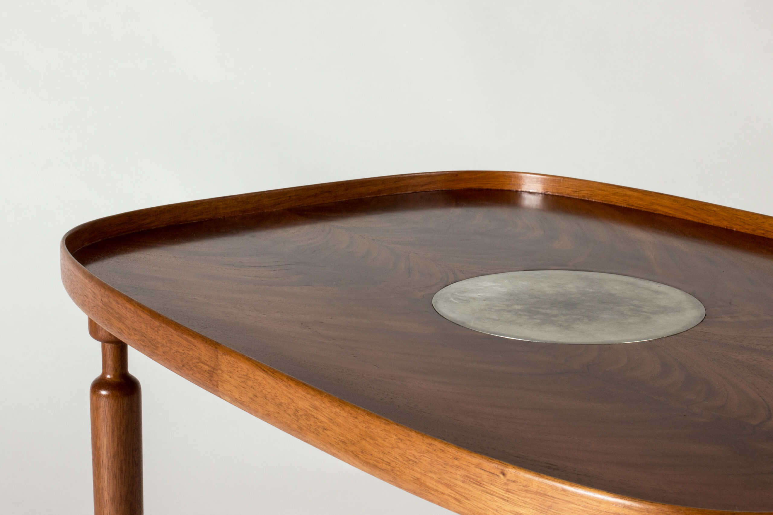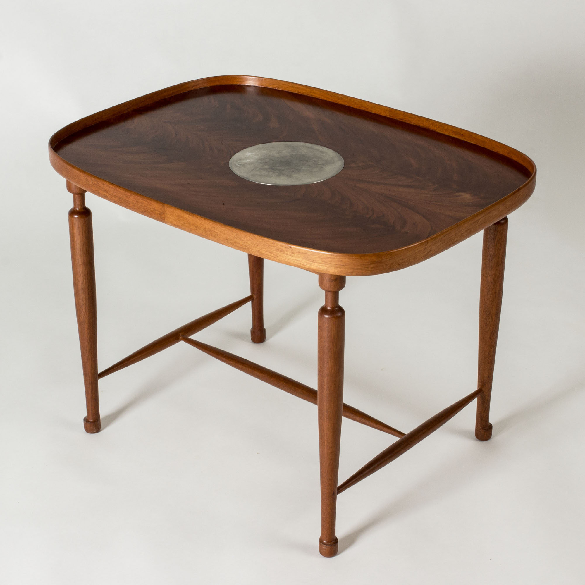 Side table by Josef Frank, model called “The Tea Table”, made from mahogany with an elegant ledge around the rounded corner tabletop. Inlayed pewter sphere in the middle of the table top, slender sculpted legs.
