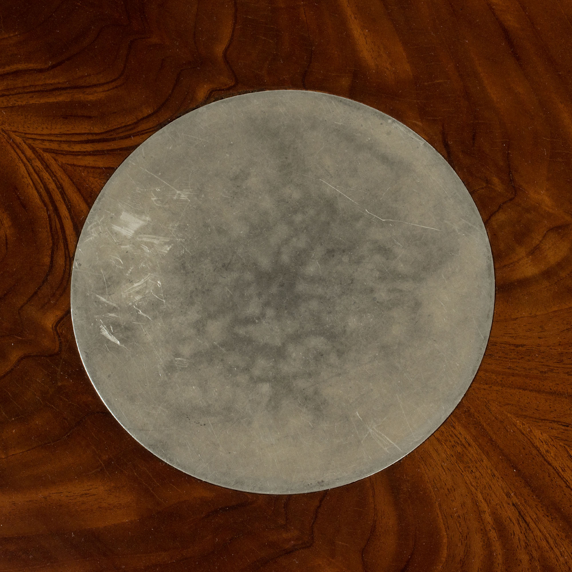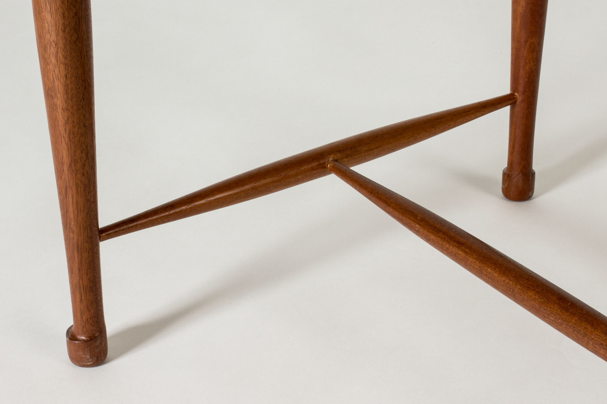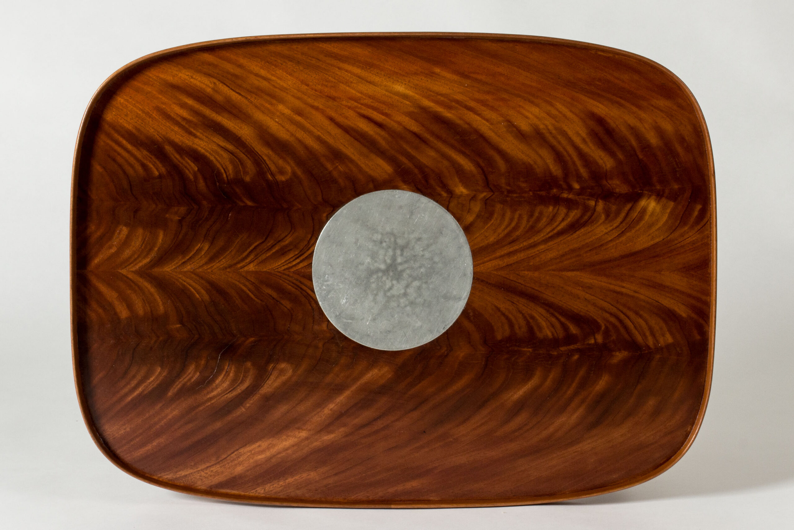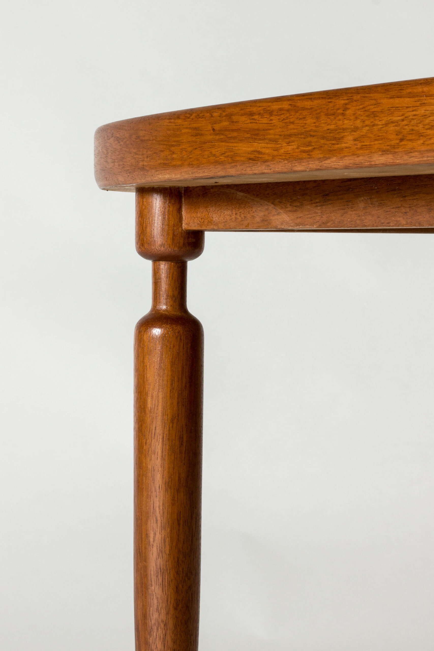 Side table by Josef Frank, model called “The Tea Table”, made from mahogany with an elegant ledge around the rounded corner tabletop. Inlayed pewter sphere in the middle of the table top, slender sculpted legs.