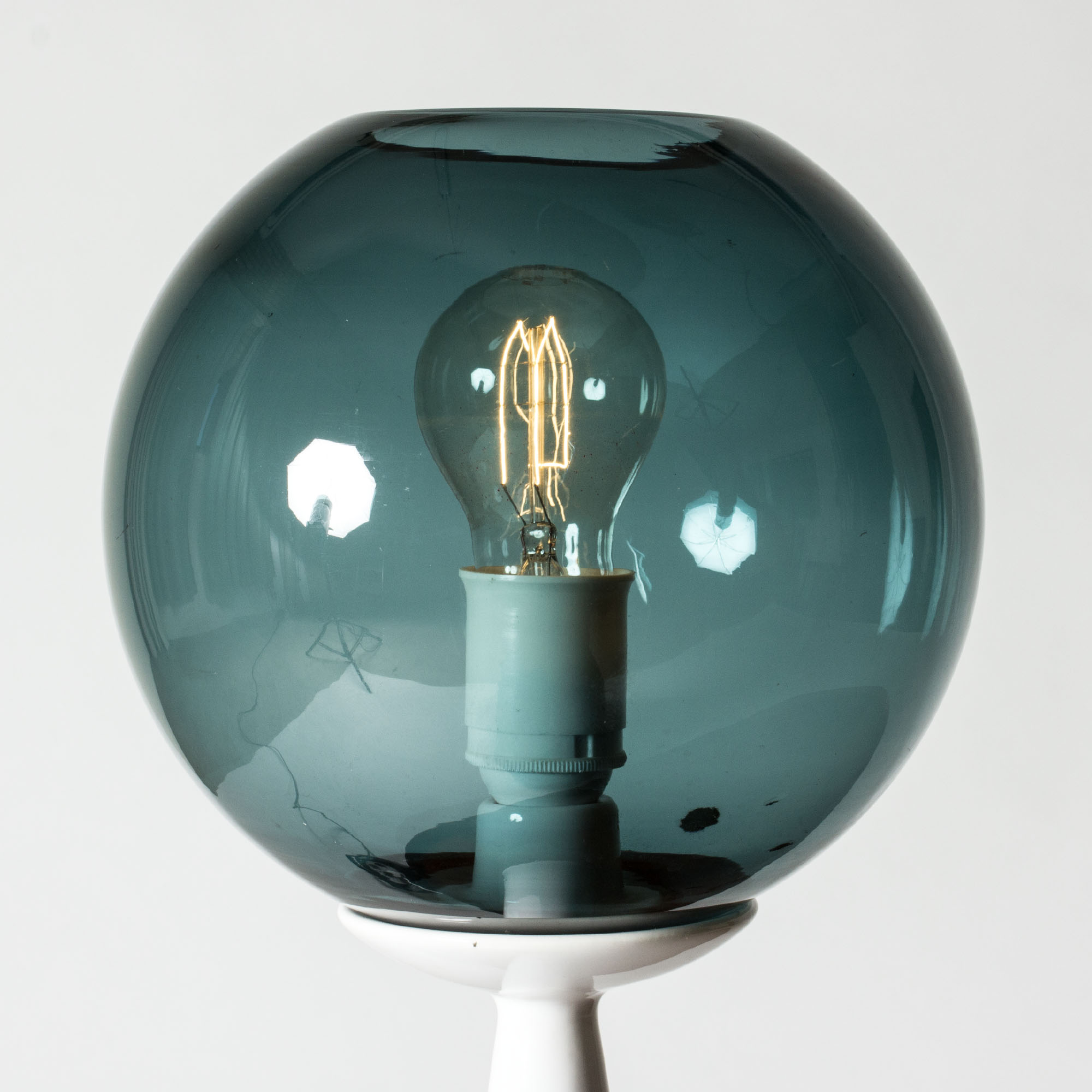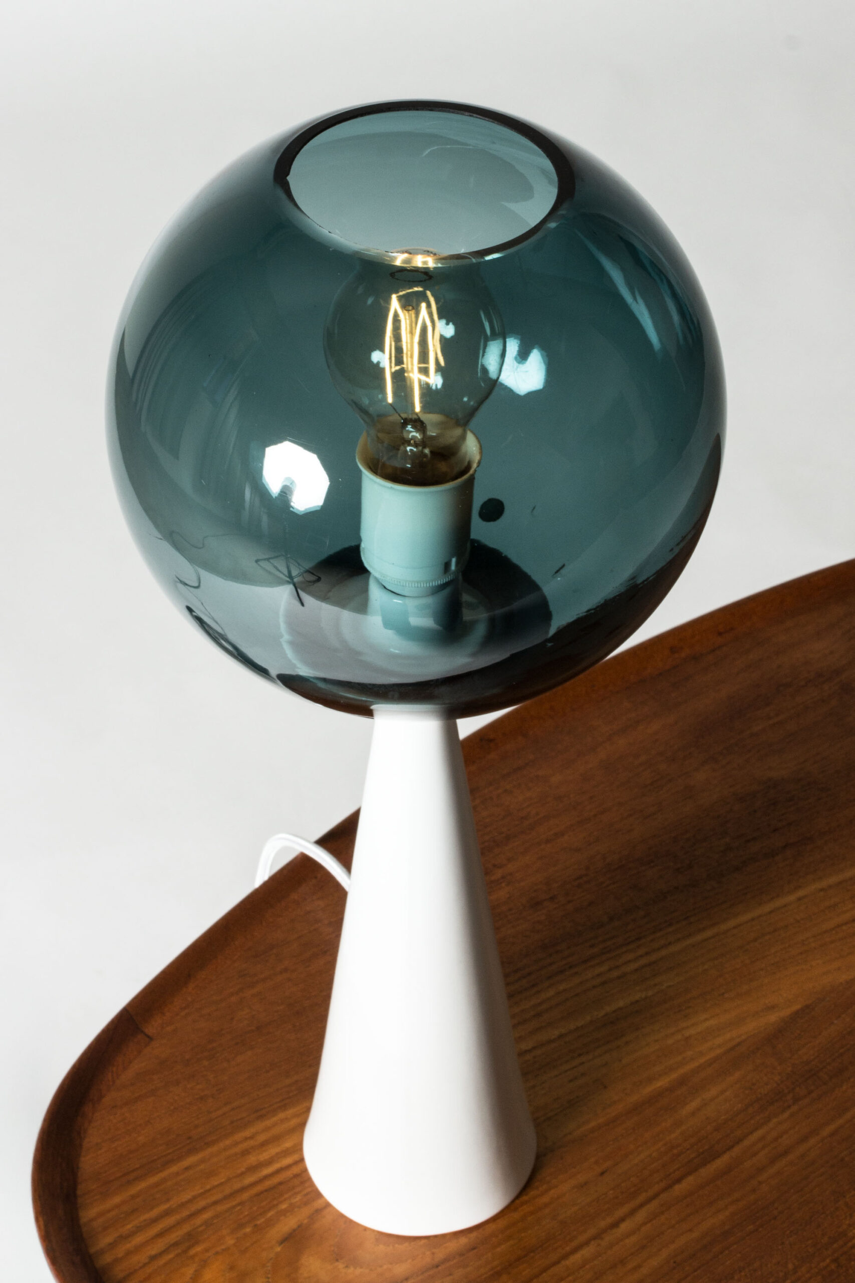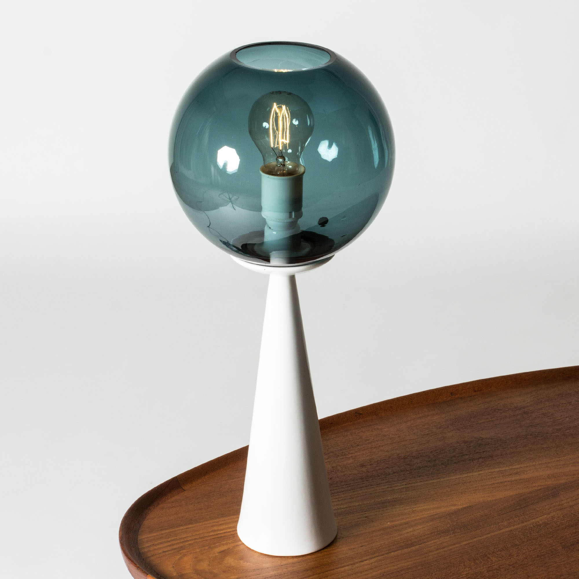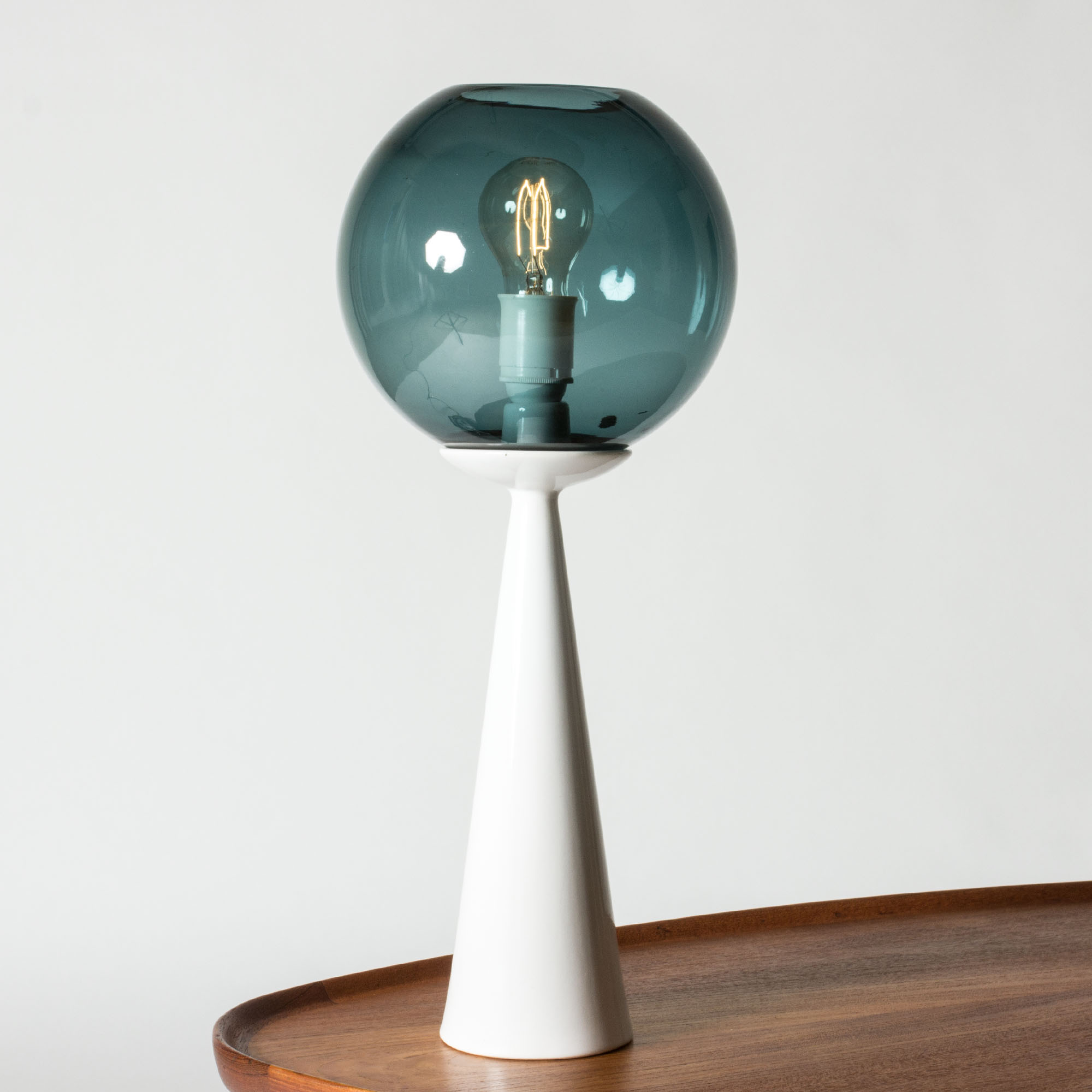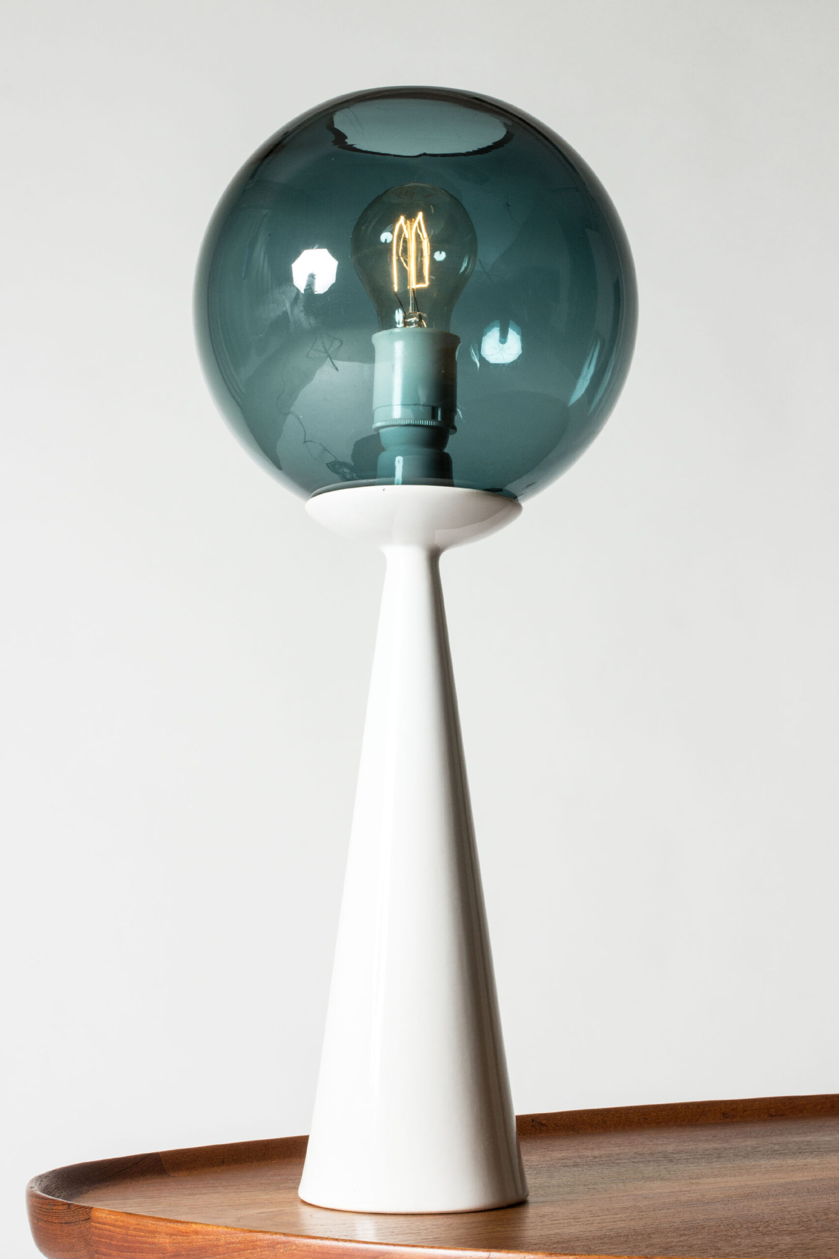 Striking table lamp by Hans-Agne Jakobsson, with a streamlined white ceramic base and round glass shade in a petrol blue nuance.
