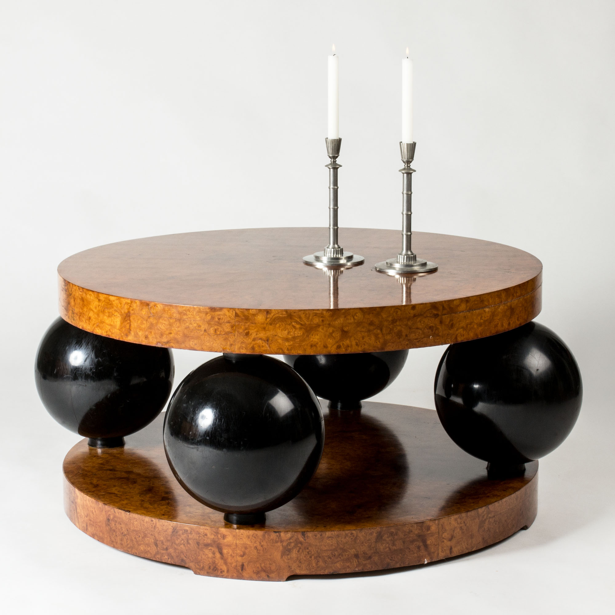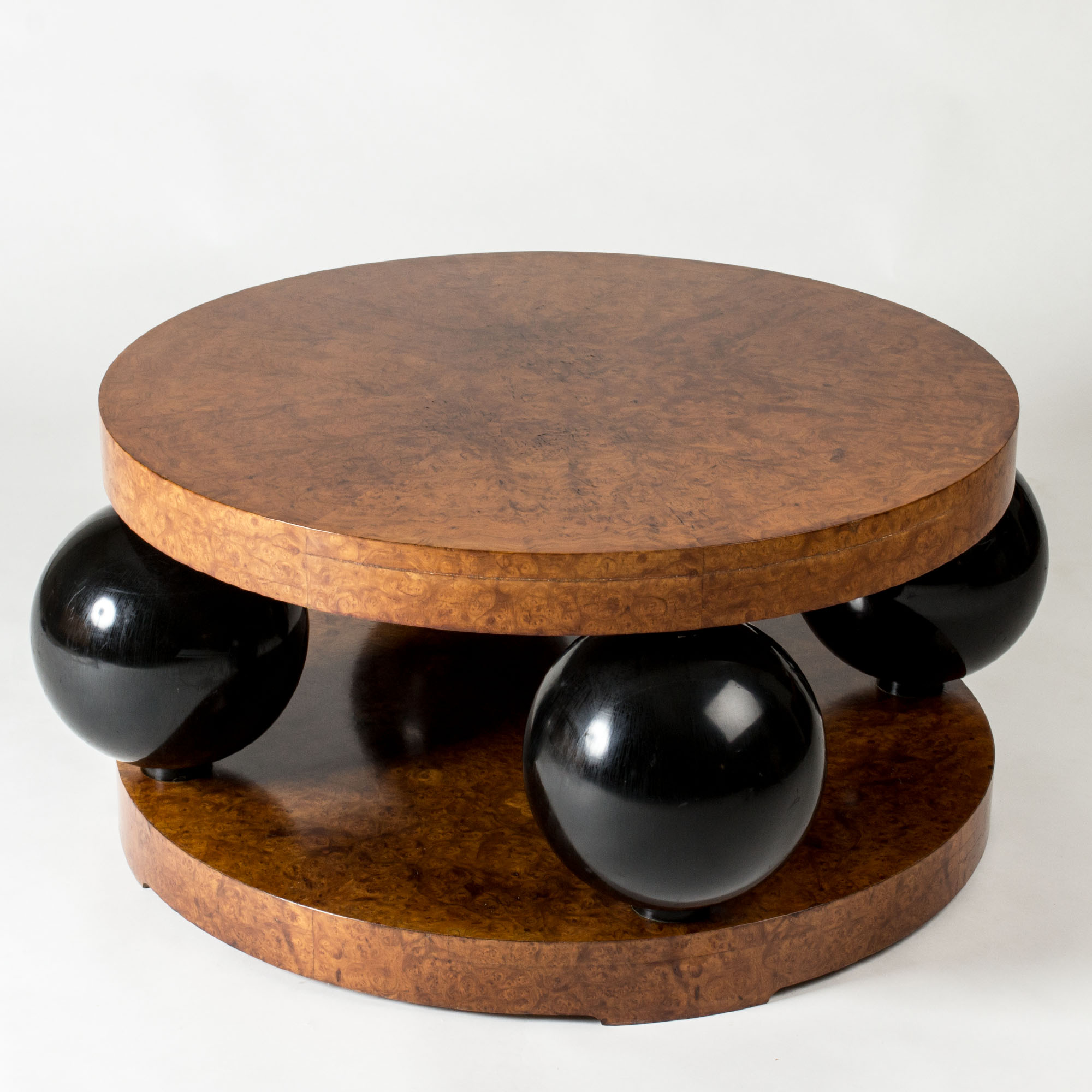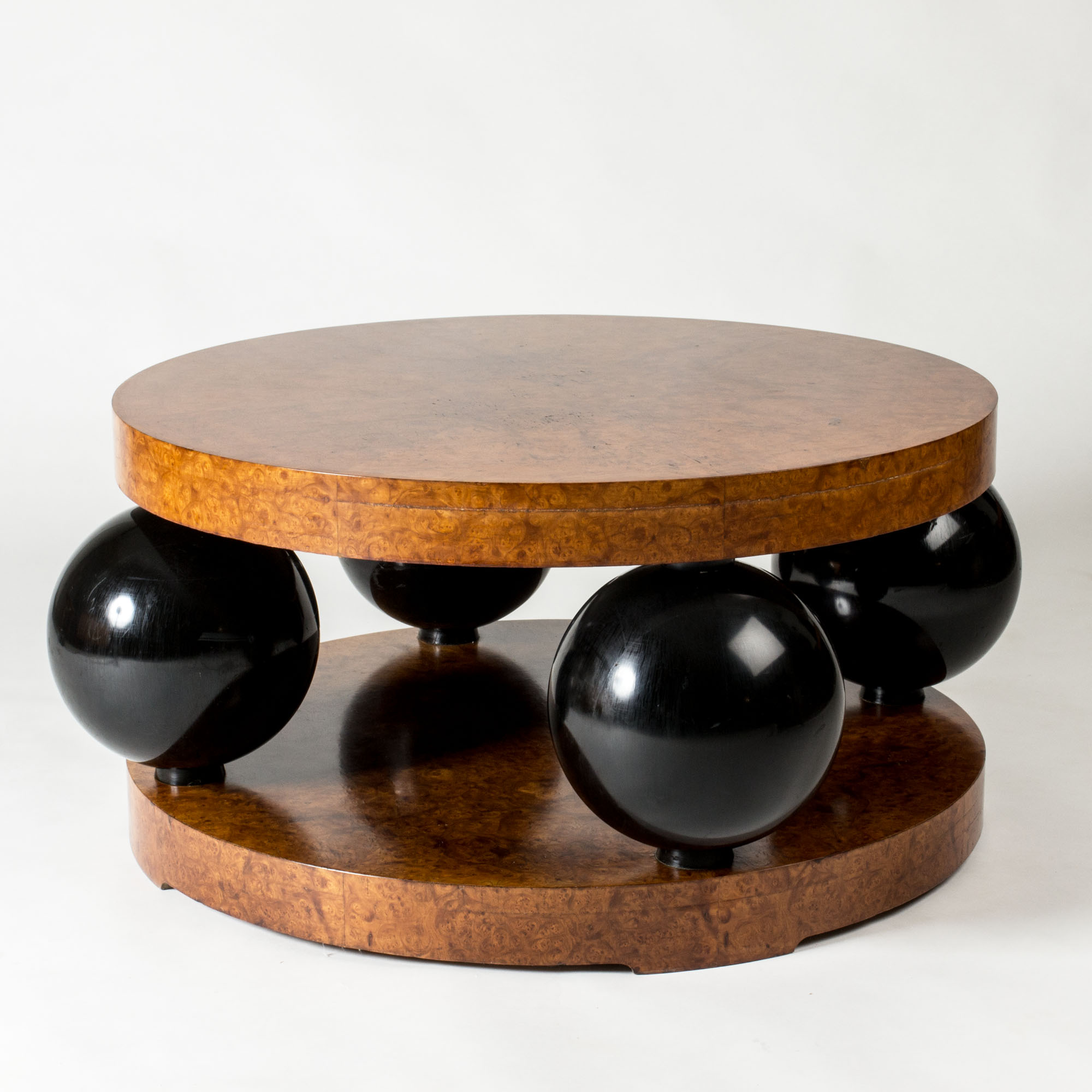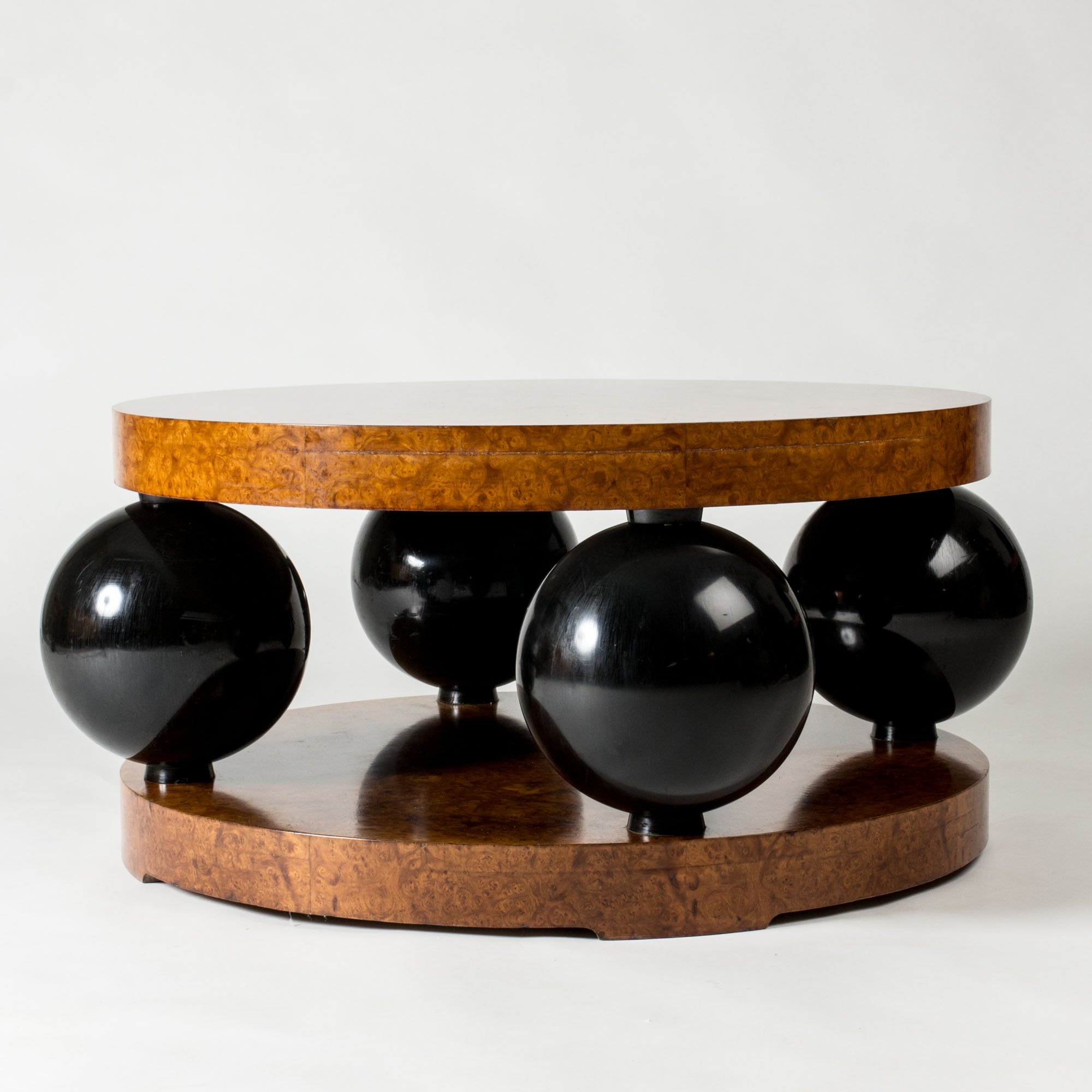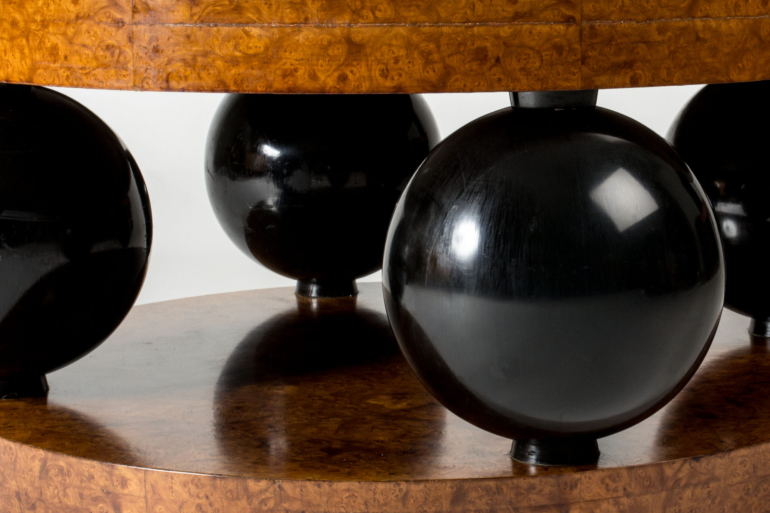Black lacquered wooden globes separate the thick round discs, giving the table a striking silhouette.