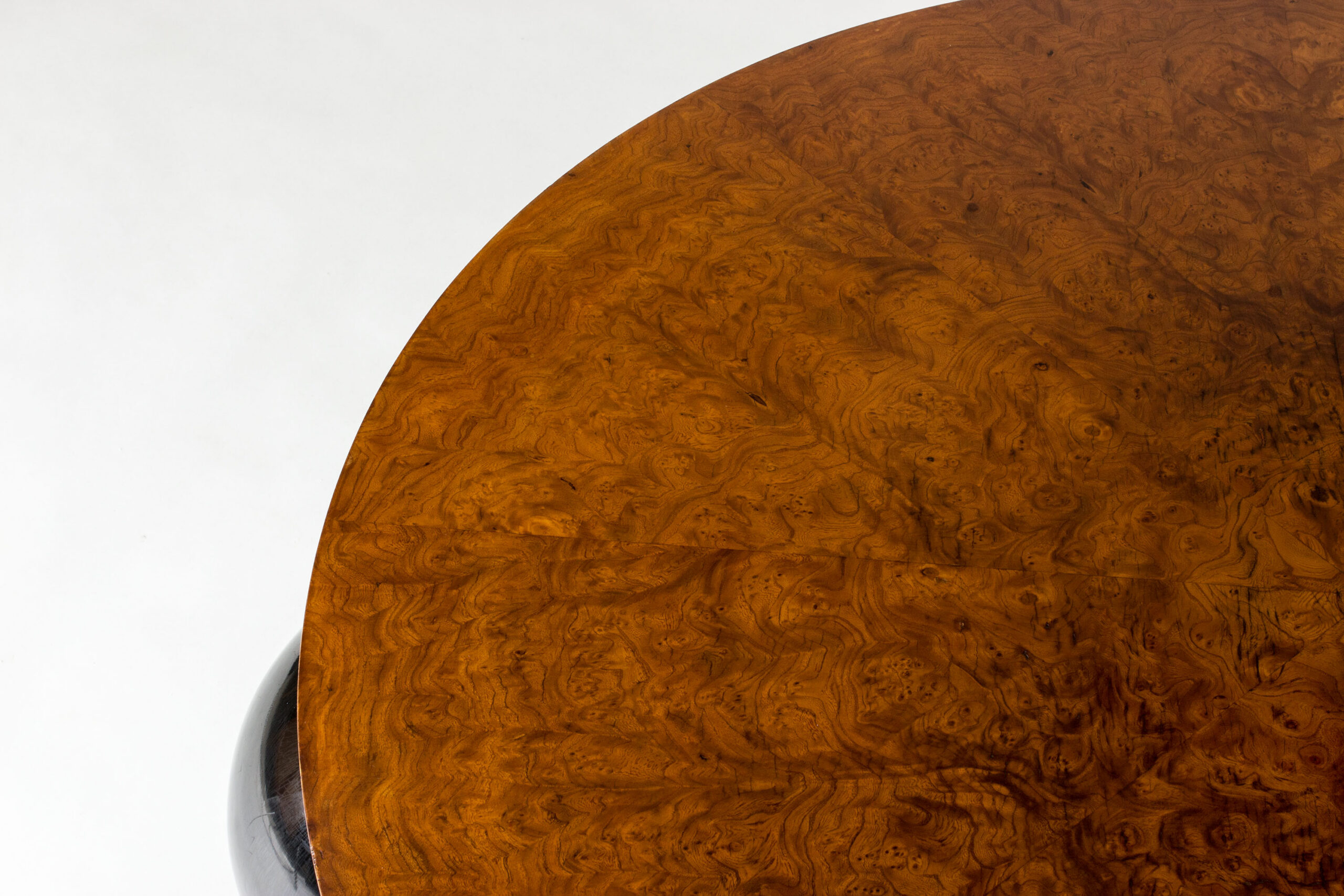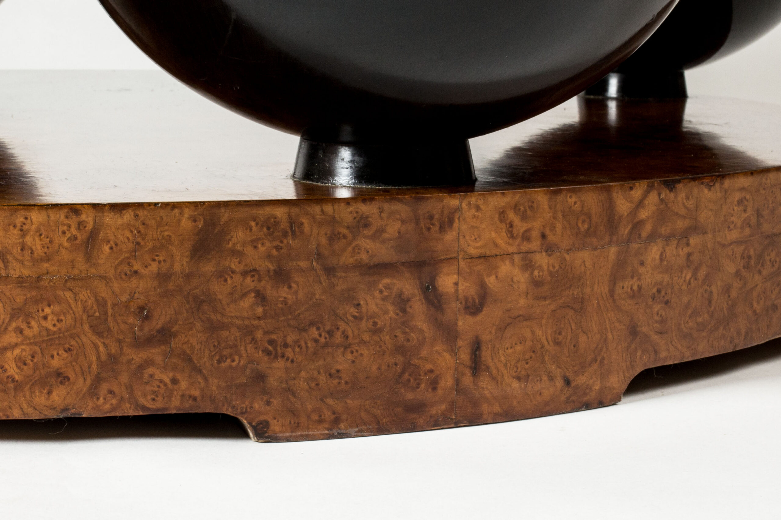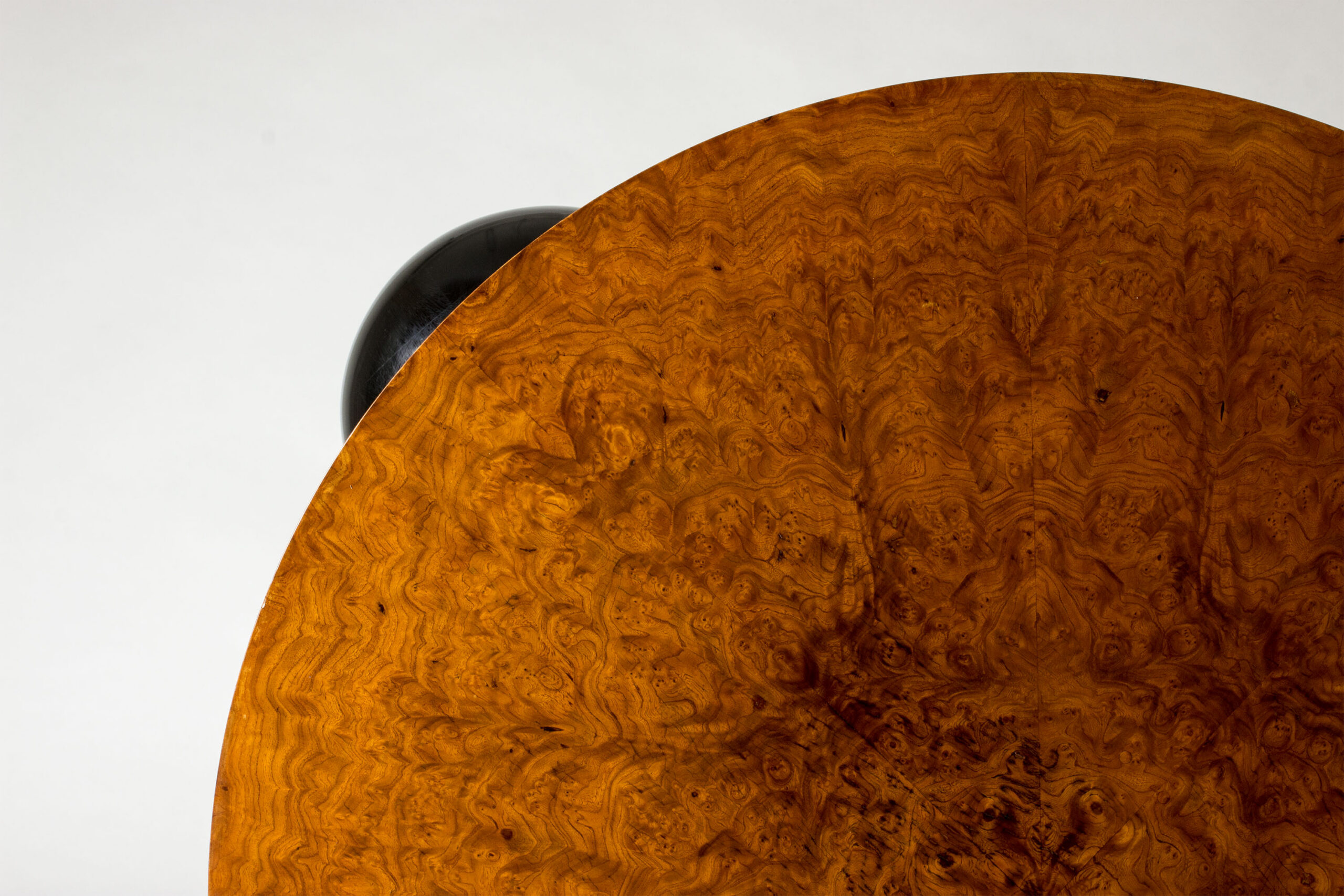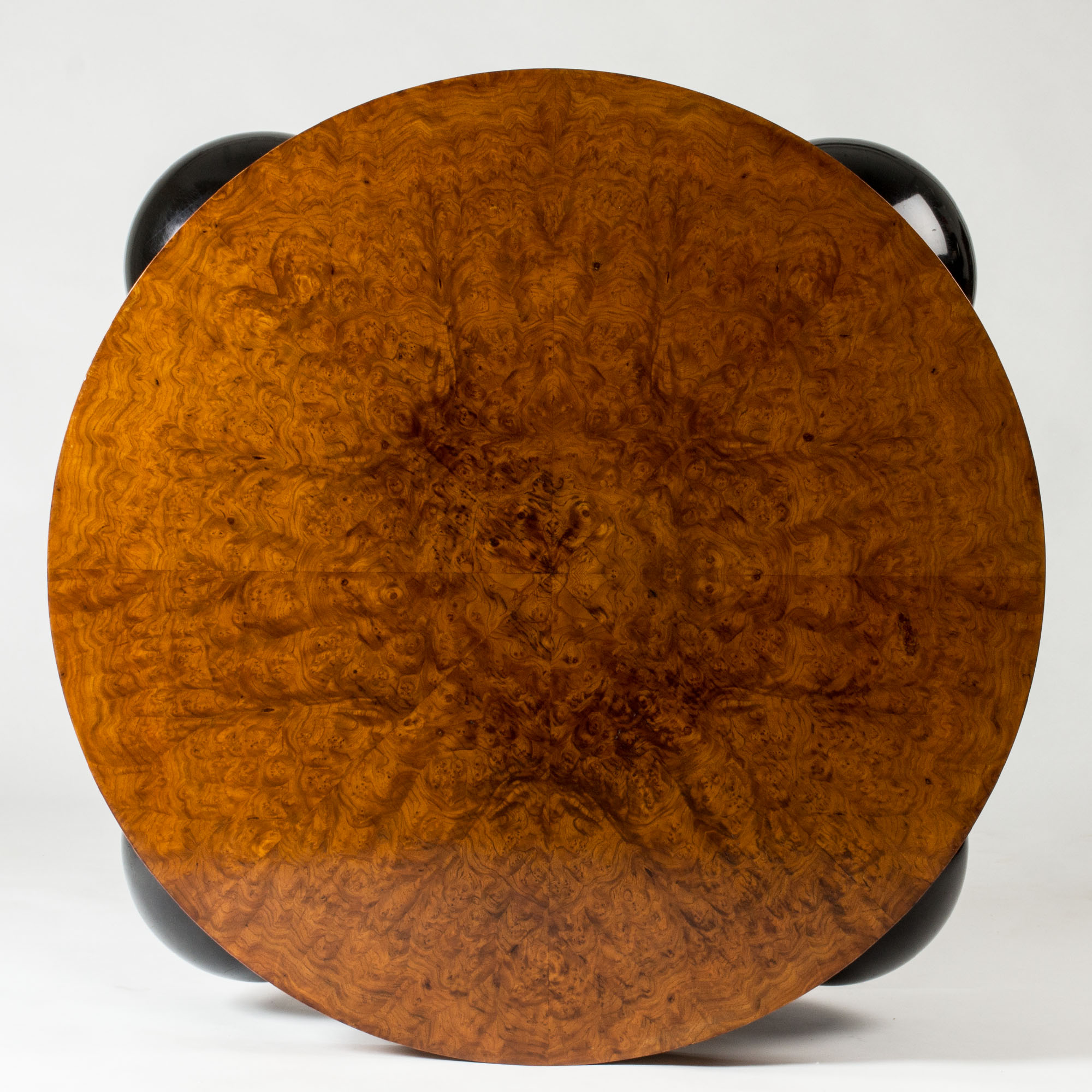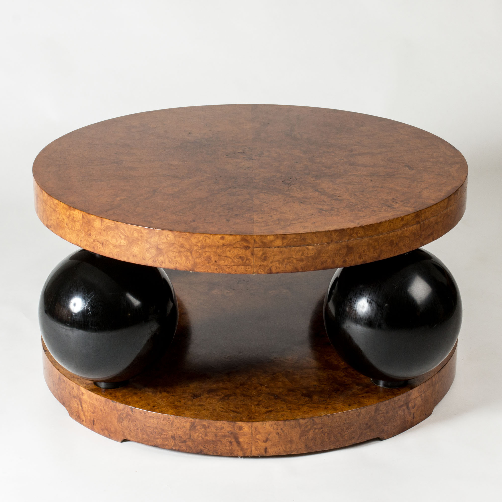 Black lacquered wooden globes separate the thick round discs, giving the table a striking silhouette.