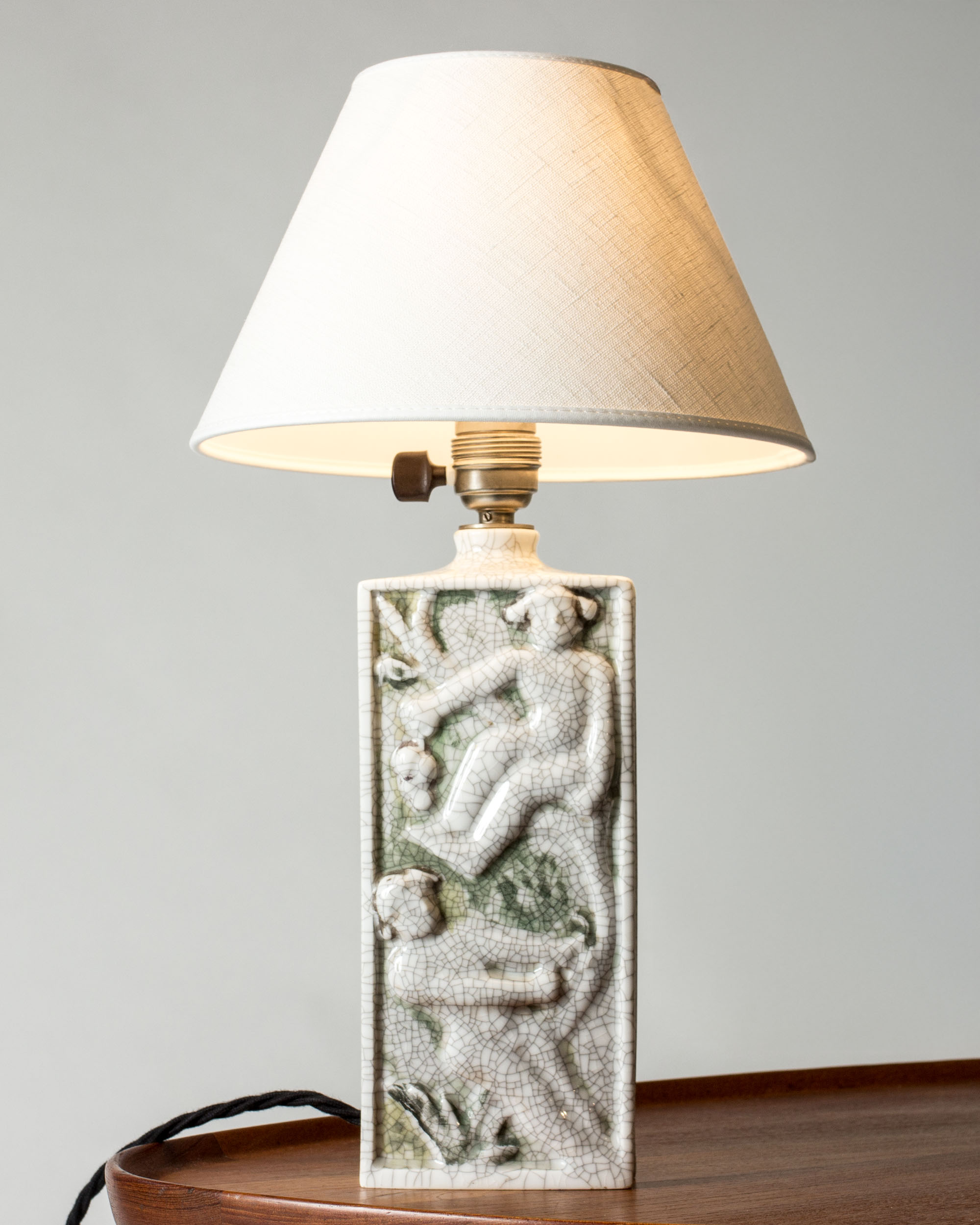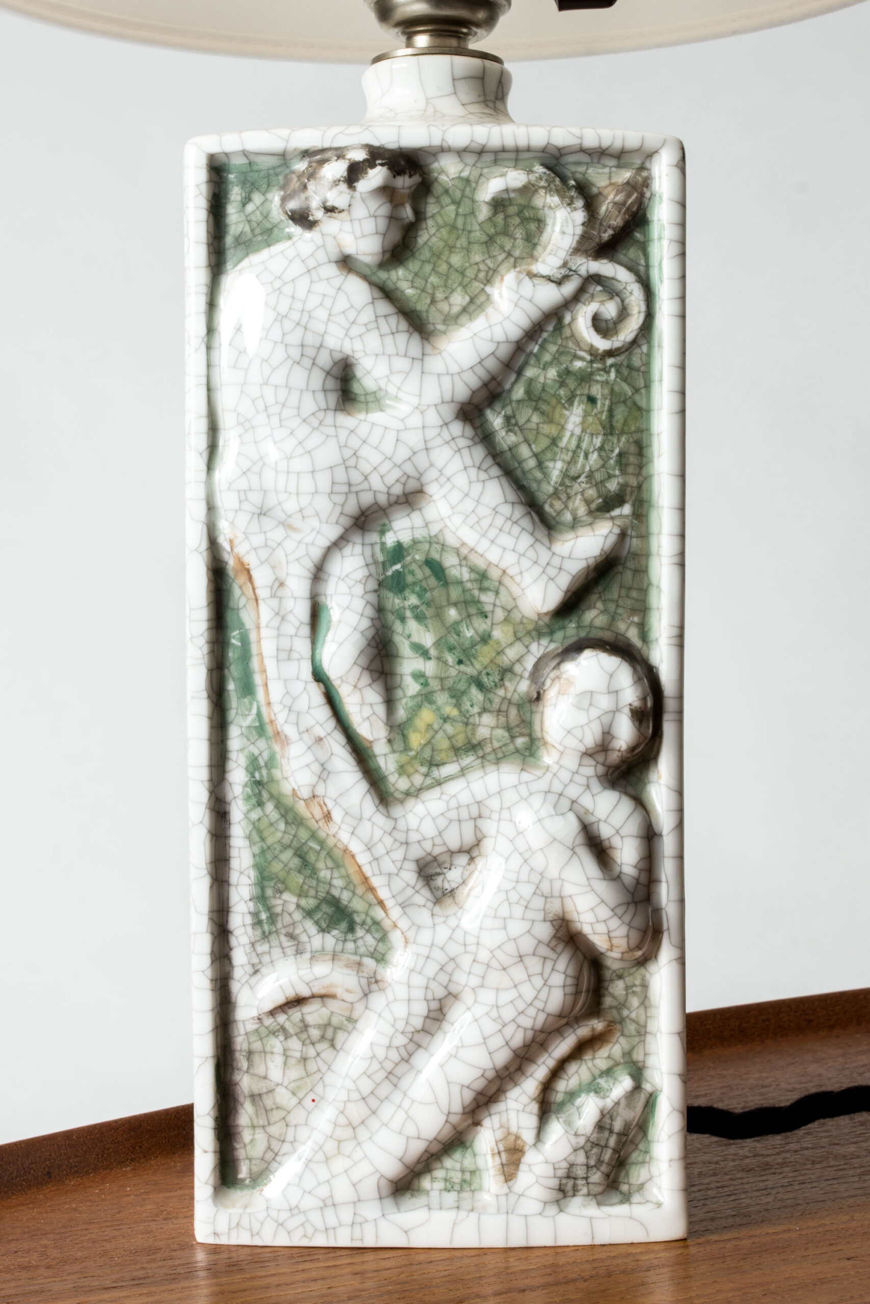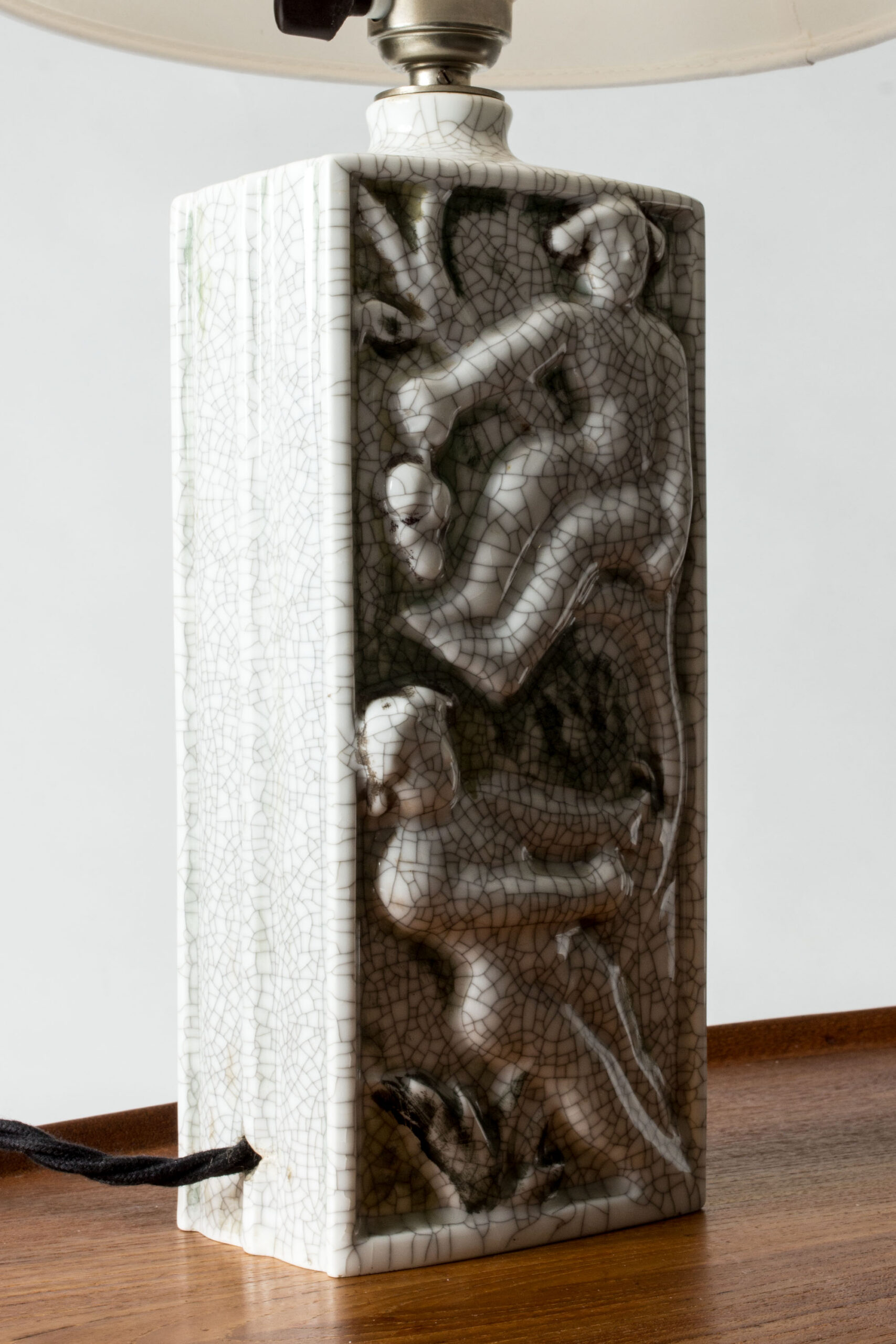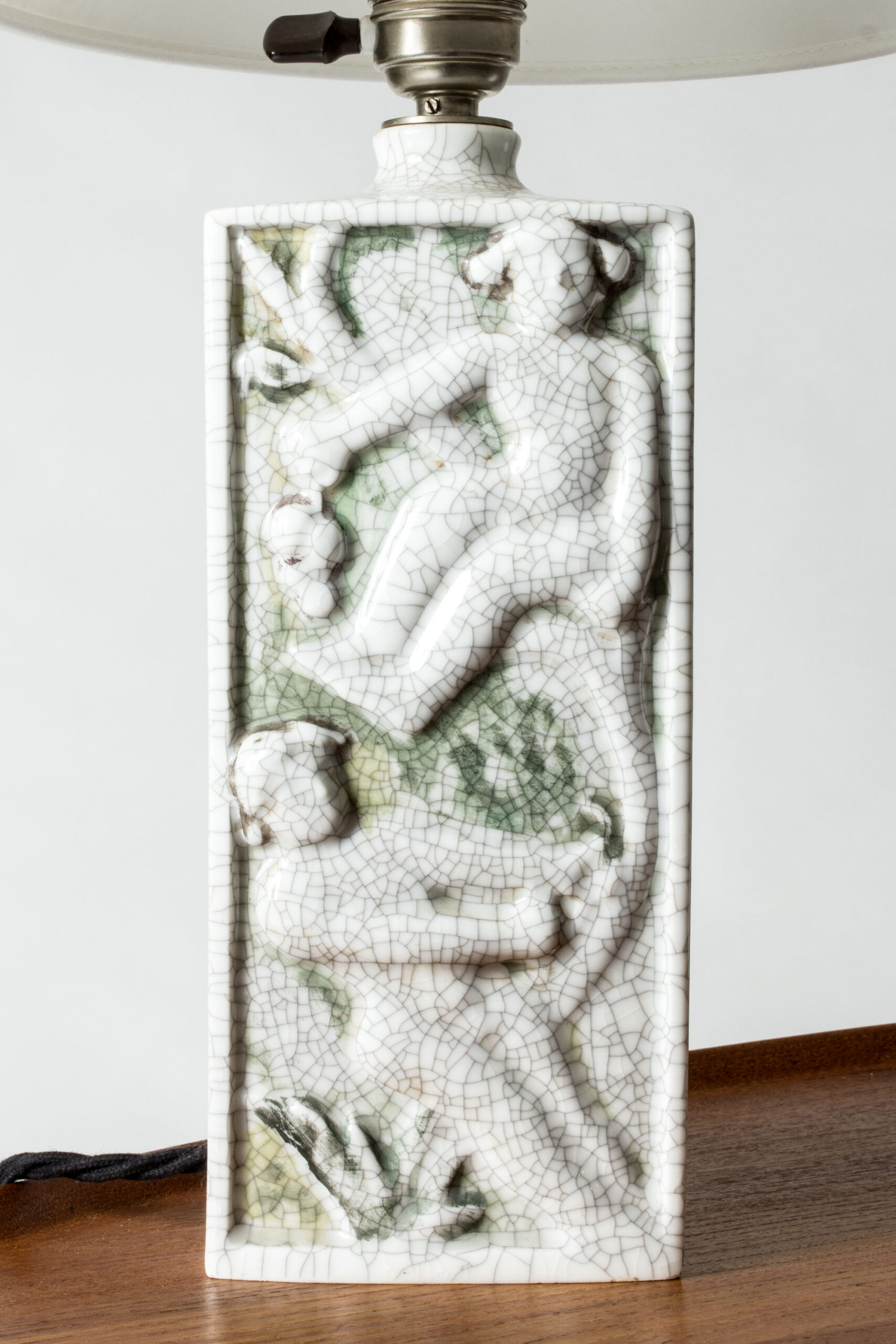 Beautiful table lamp by Tyra Lundgren, made of porcelain in a rectangular form. Decorated with tree climbing female figures in relief, diluted colors and crackled glaze. Unmarked.