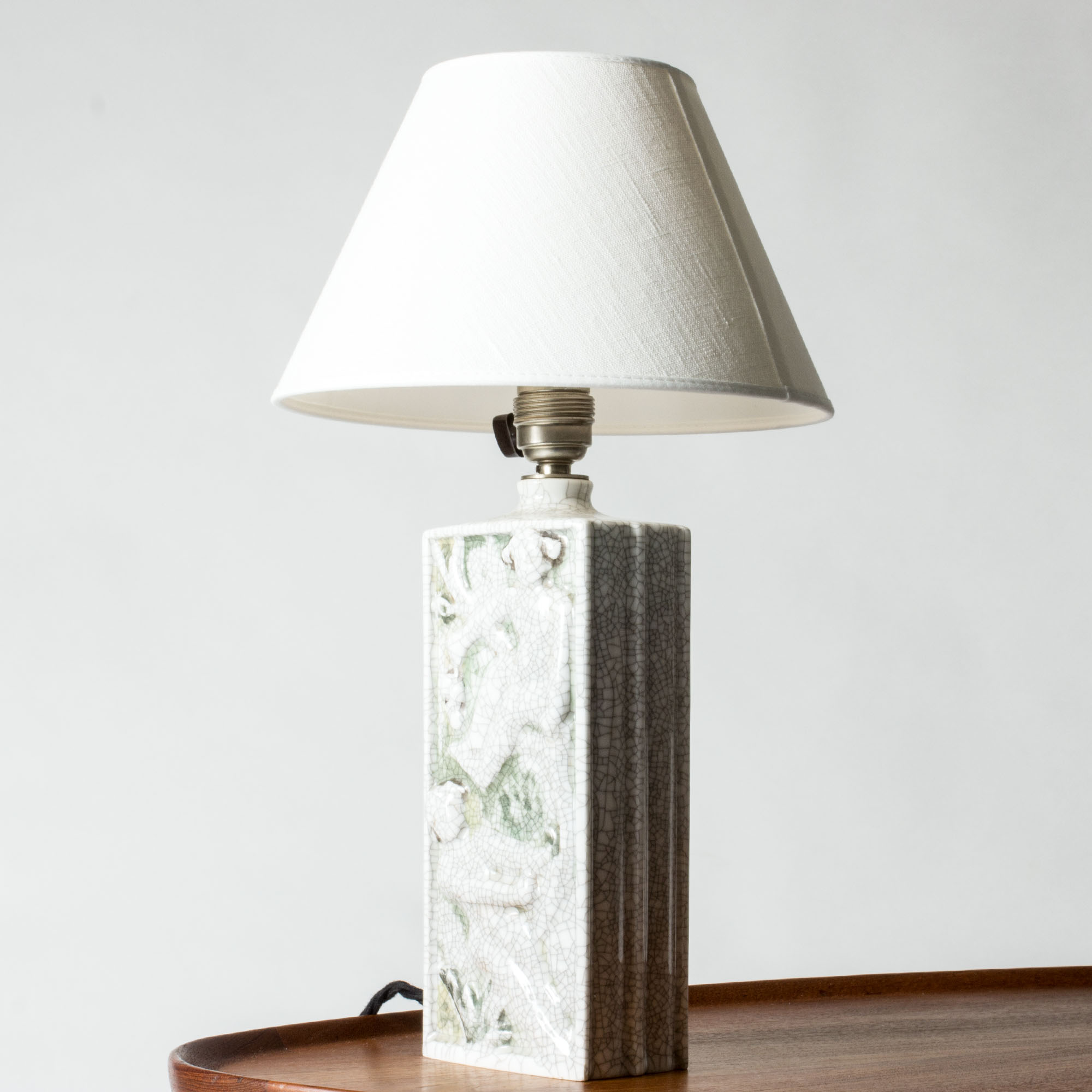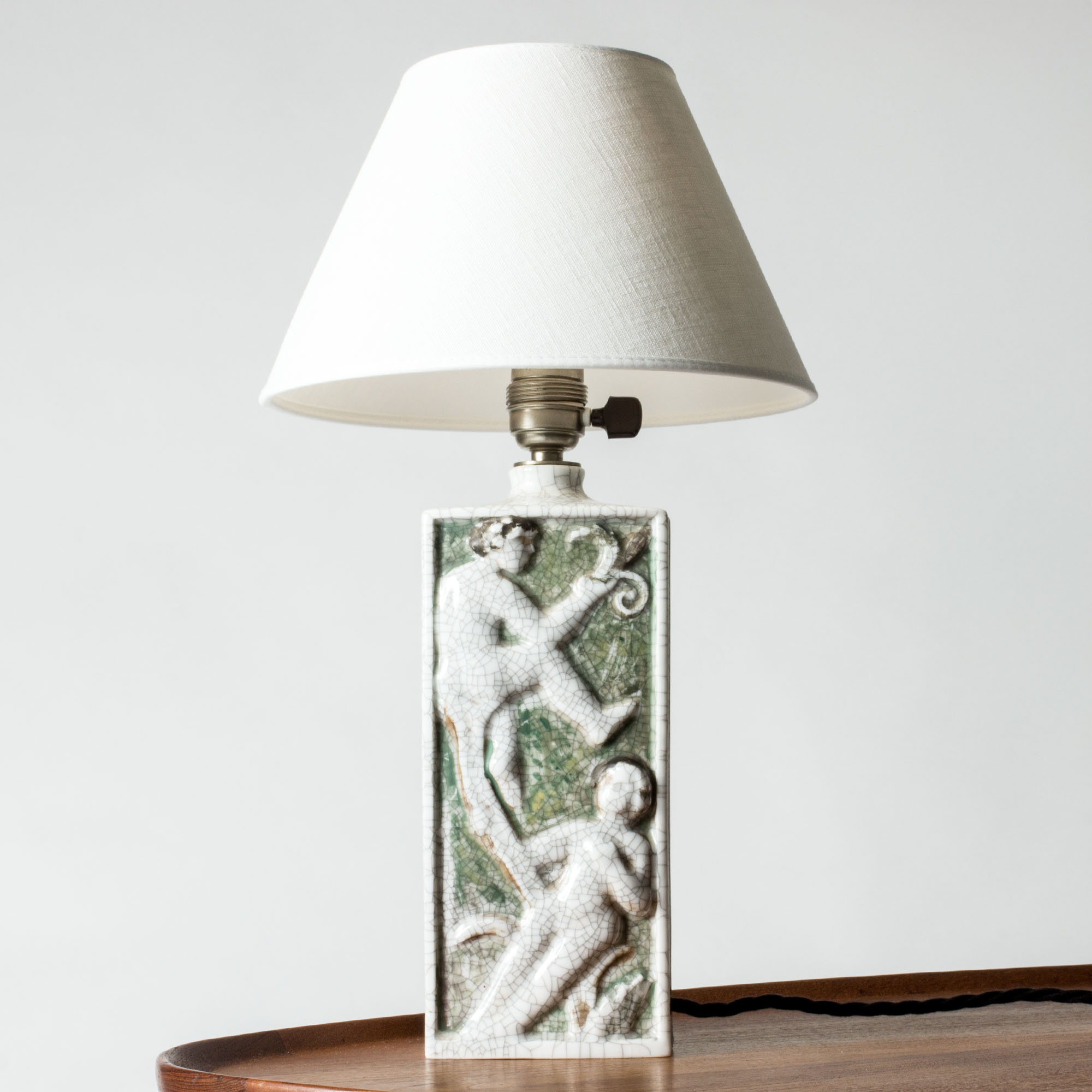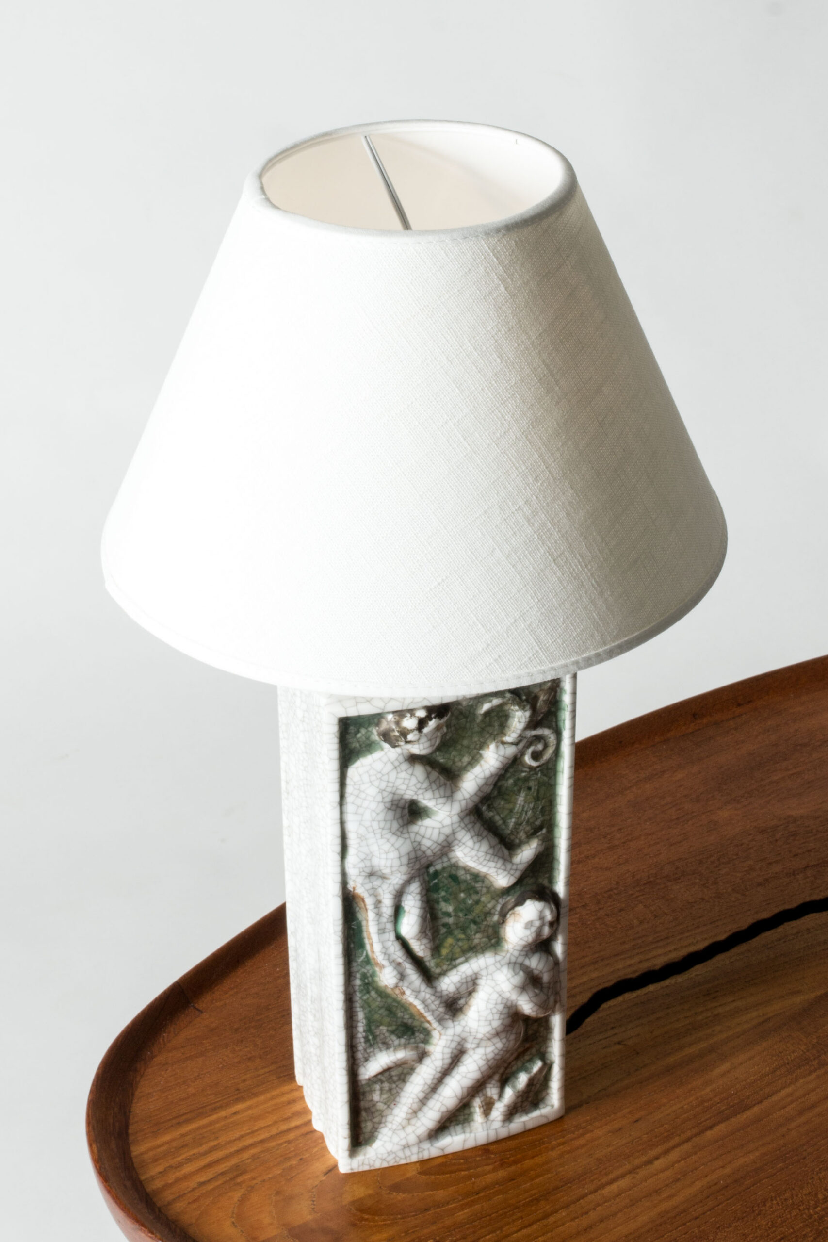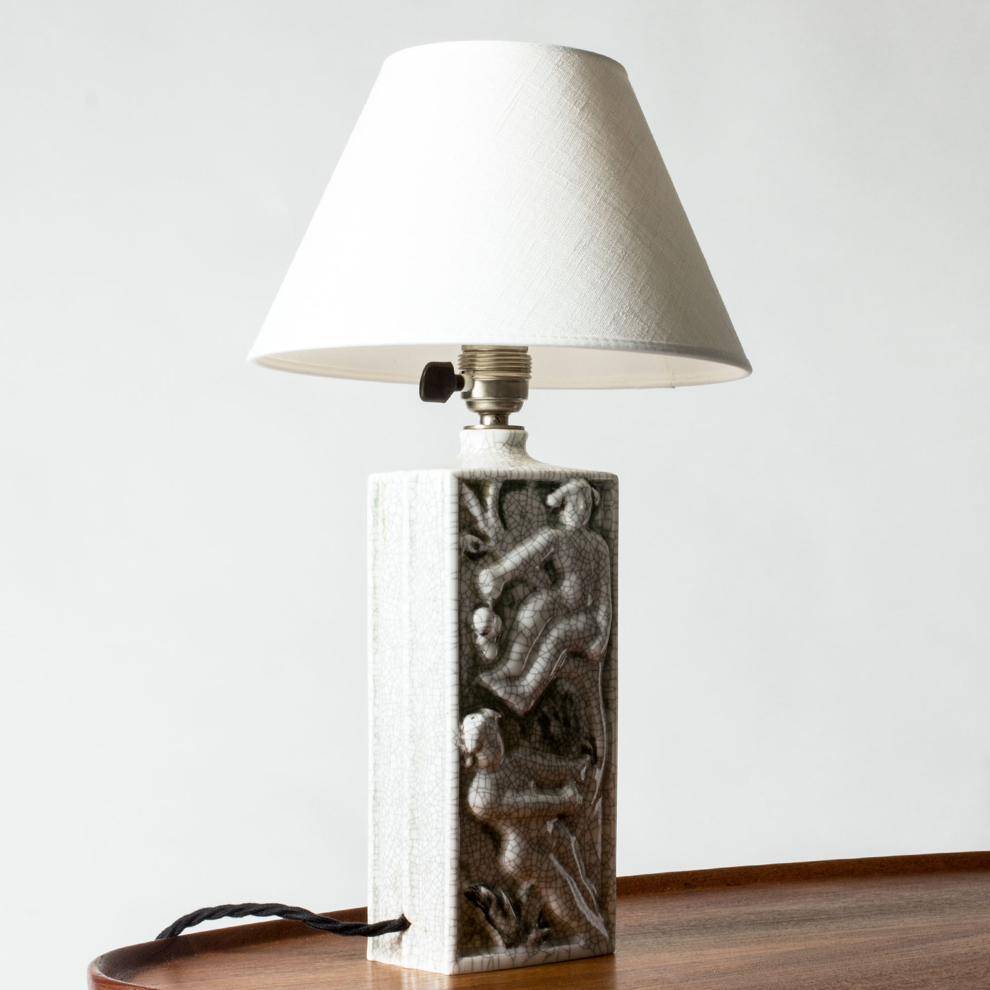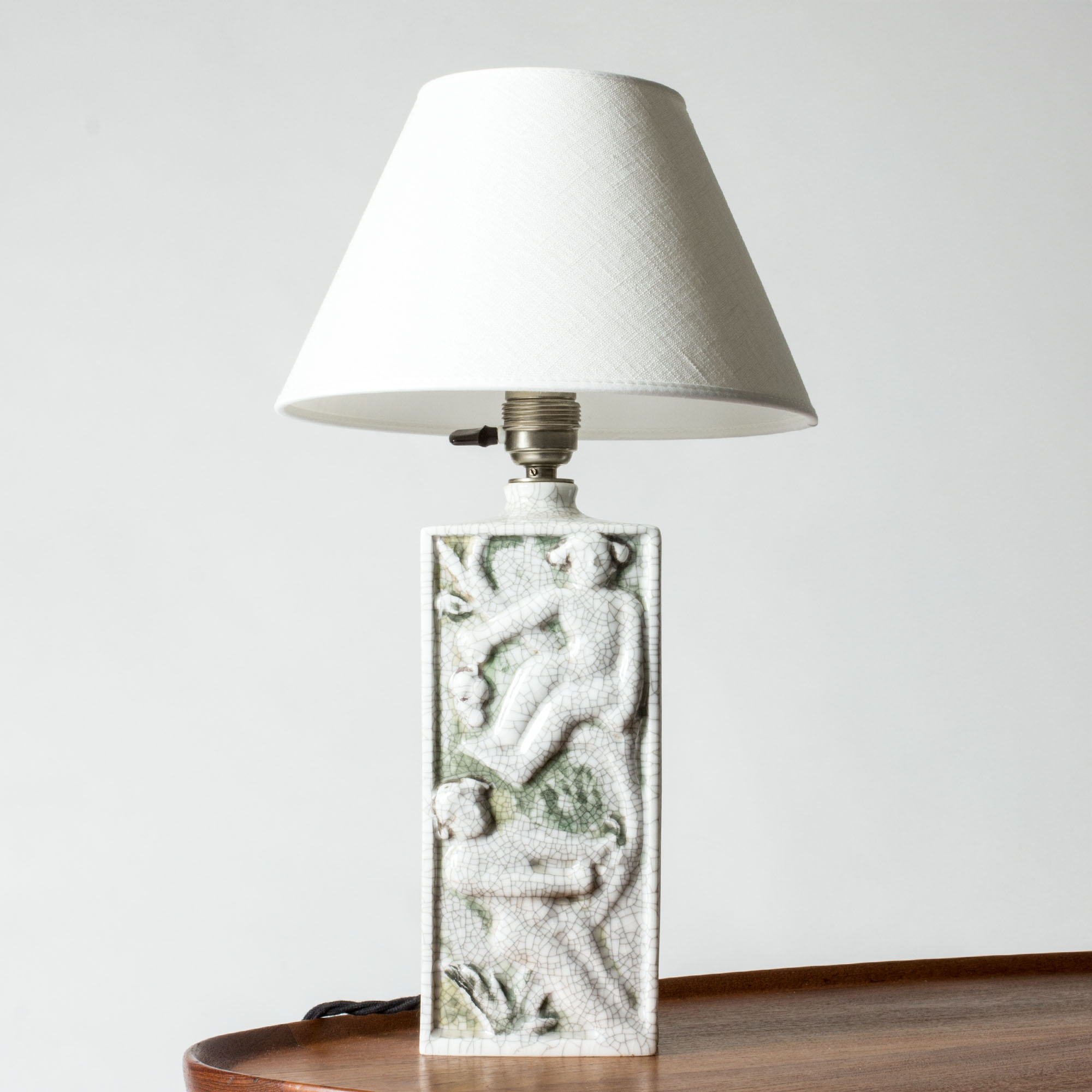 Beautiful table lamp by Tyra Lundgren, made of porcelain in a rectangular form. Decorated with tree climbing female figures in relief, diluted colors and crackled glaze. Unmarked.