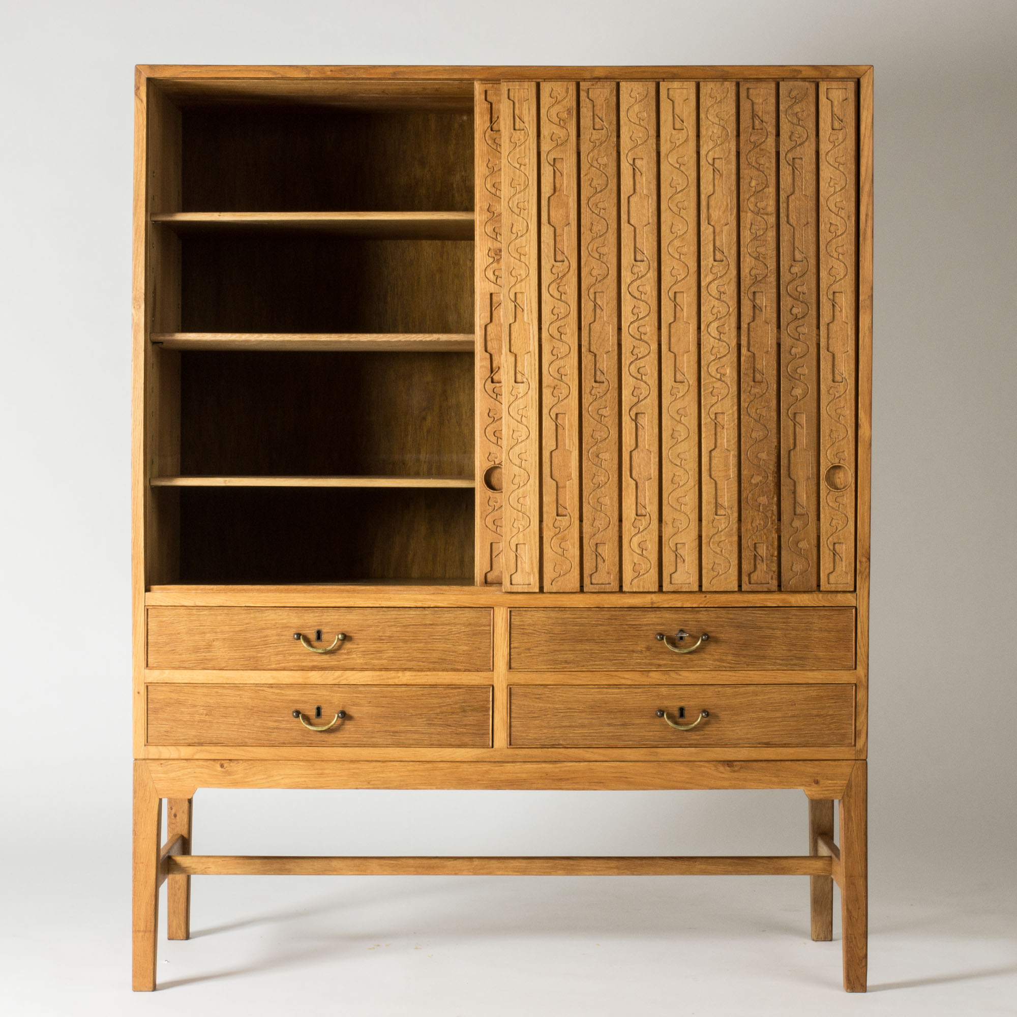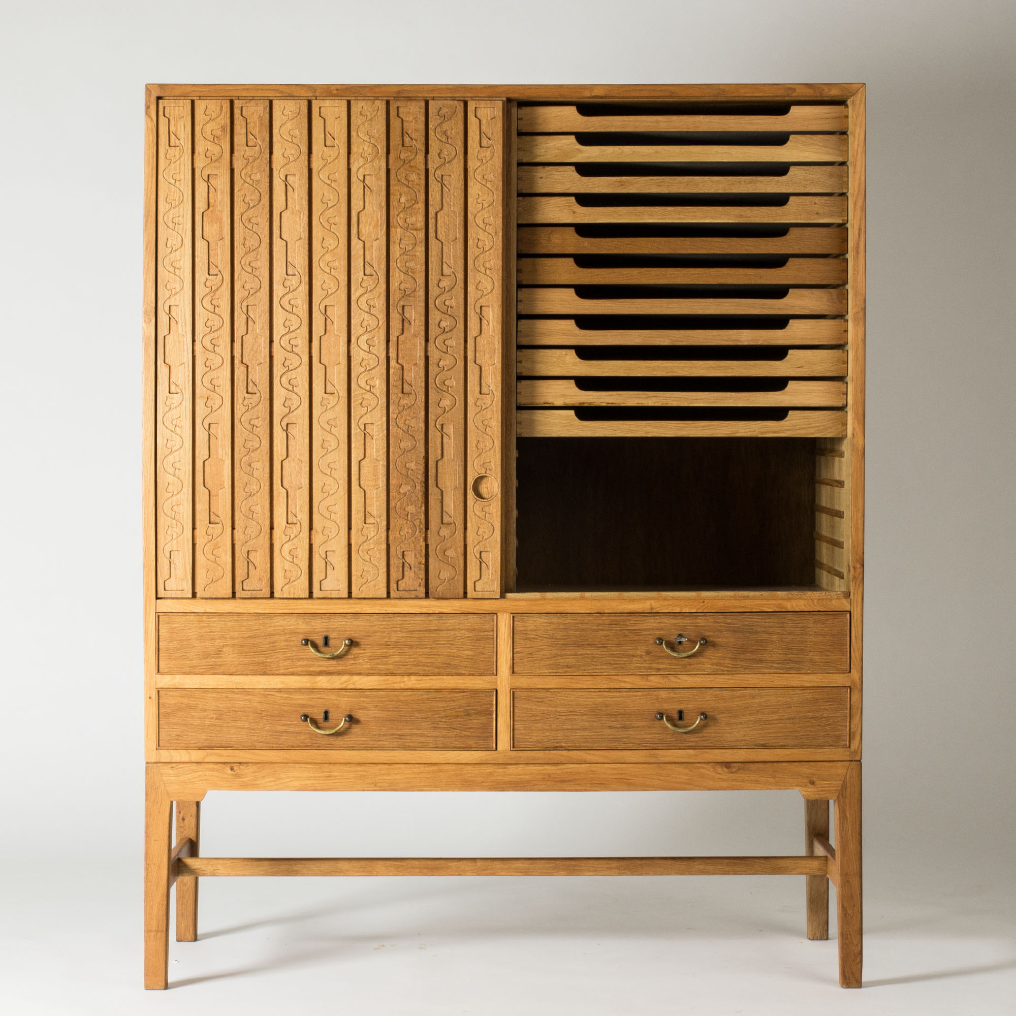 Amazing cabinet by Hans J. Wegner, made from oak and featuring doors with an elaborate pattern of embossed acorns and graphic forms. Round inset handles. Shelves and drawers offer abundant storage.
