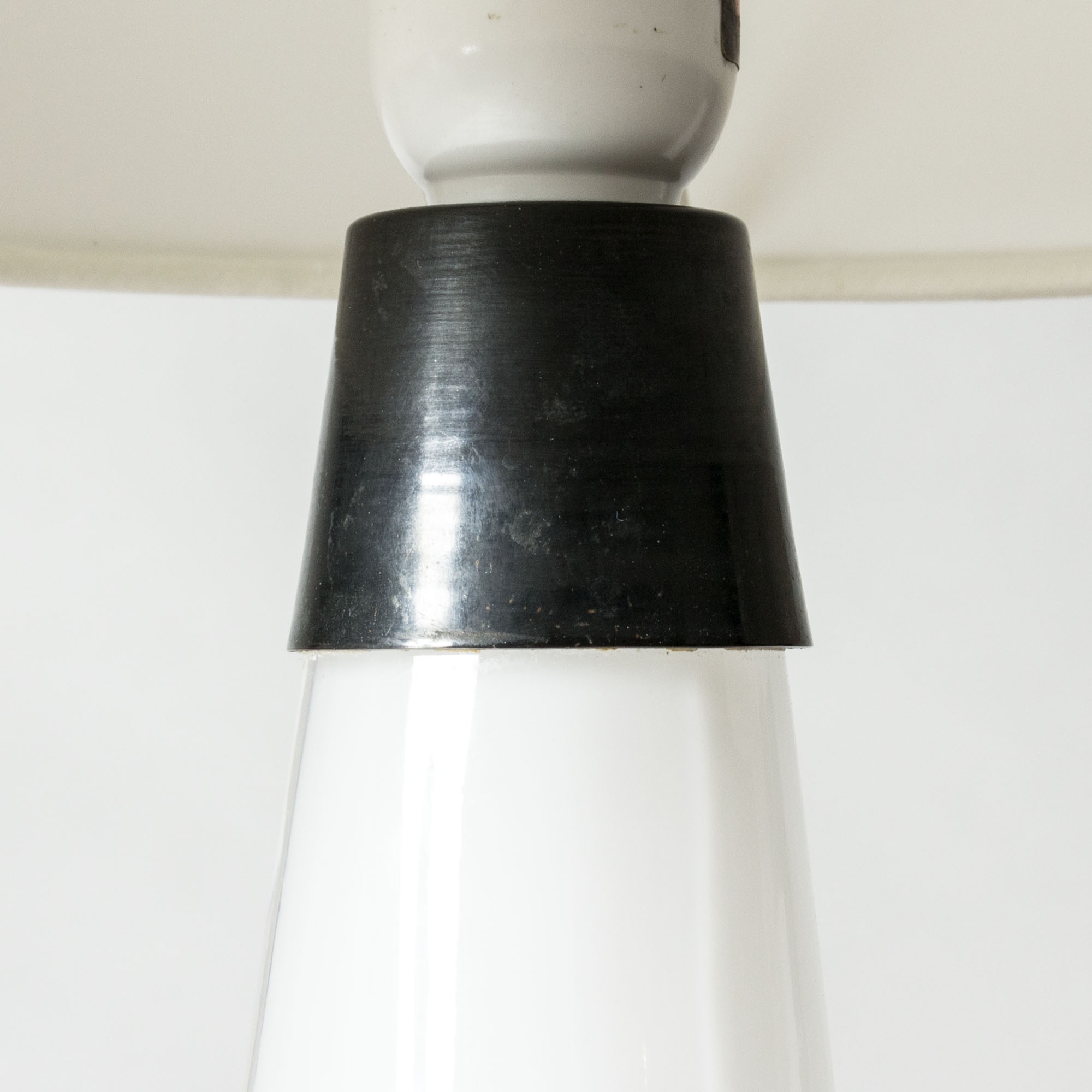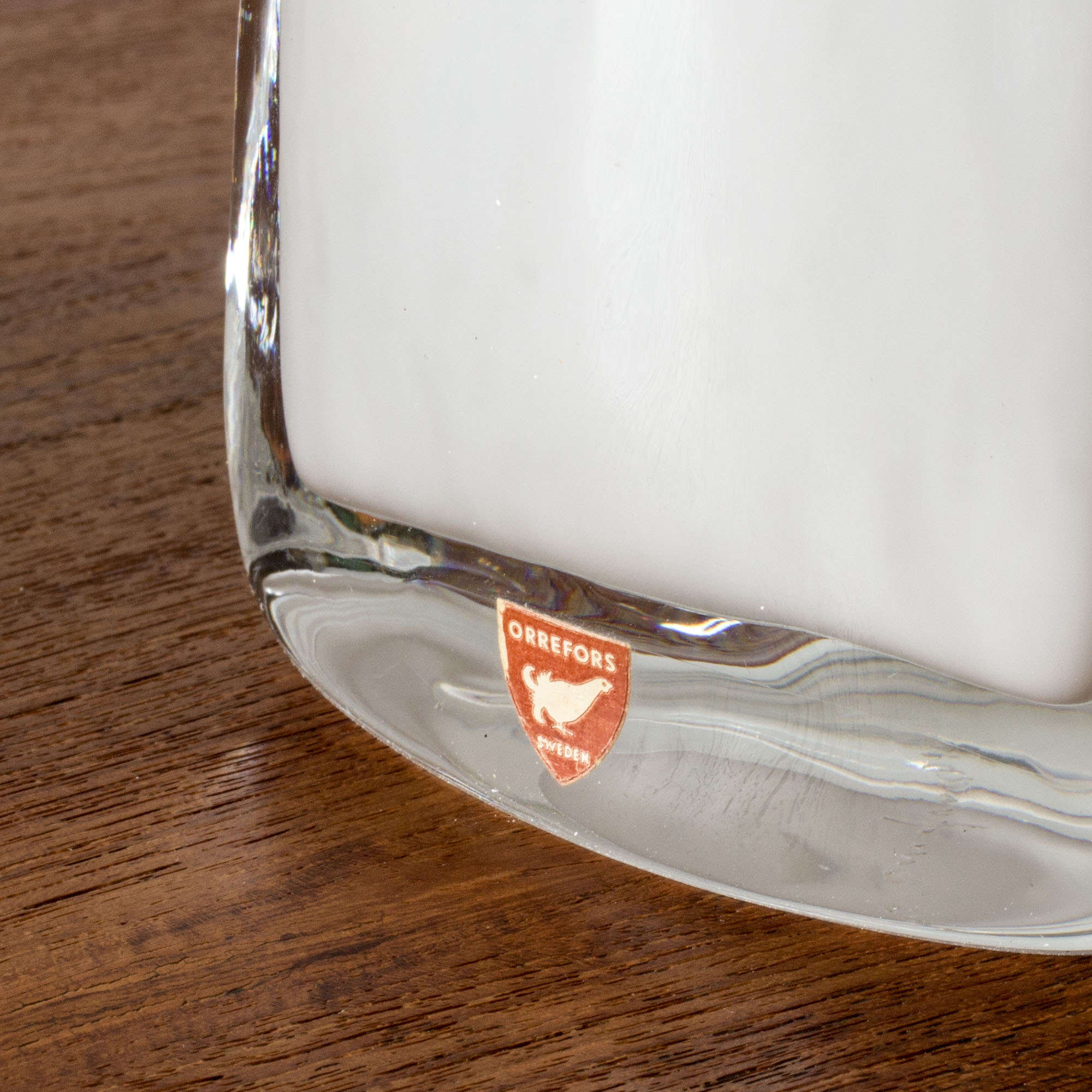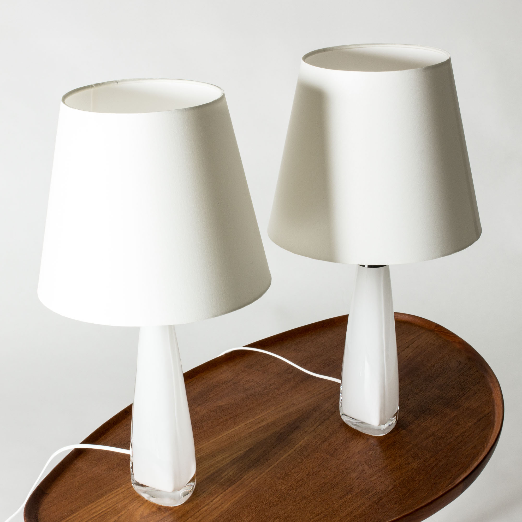 Pair of white glass table lamps by Carl Fagerlund for Orrefors. Heavy glass bases with a bulging triangle form and metal detail at the top. Very elegant design.