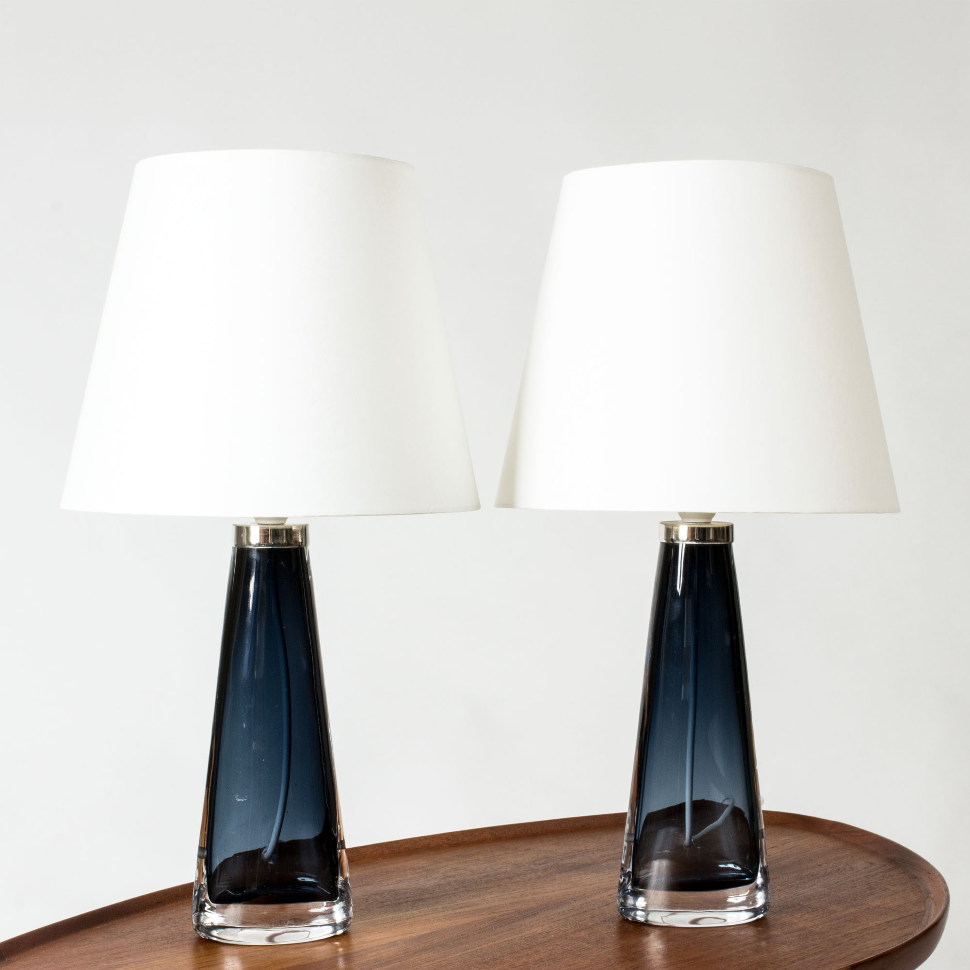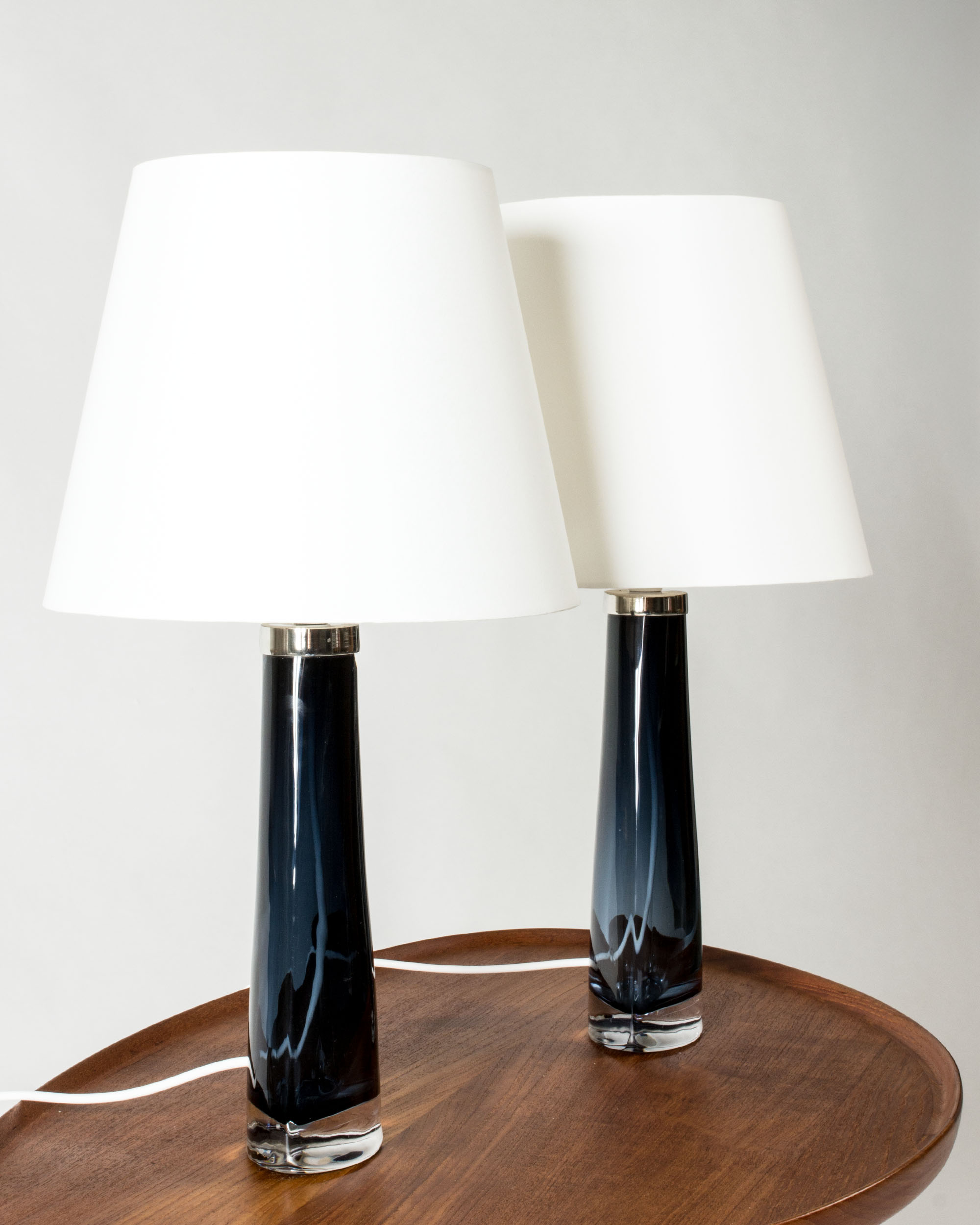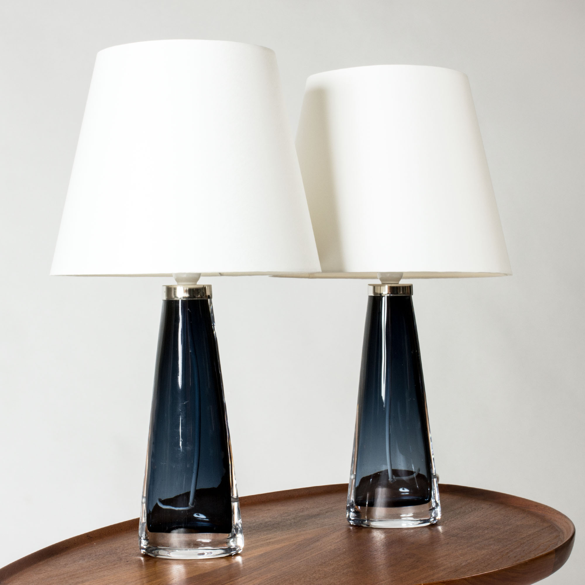 Pair of crystal glass table lamps by Carl Fagerlund, made from dark blue colored glass in a tapering conical shape, almond shaped at the base. Beautiful translucent color, elegant design.
