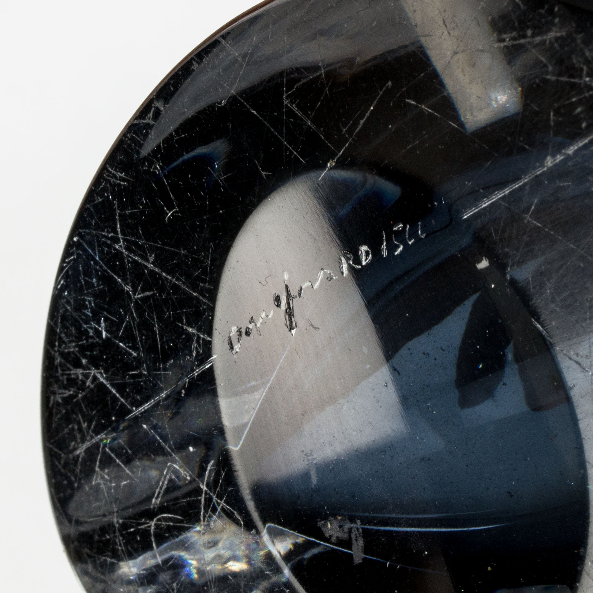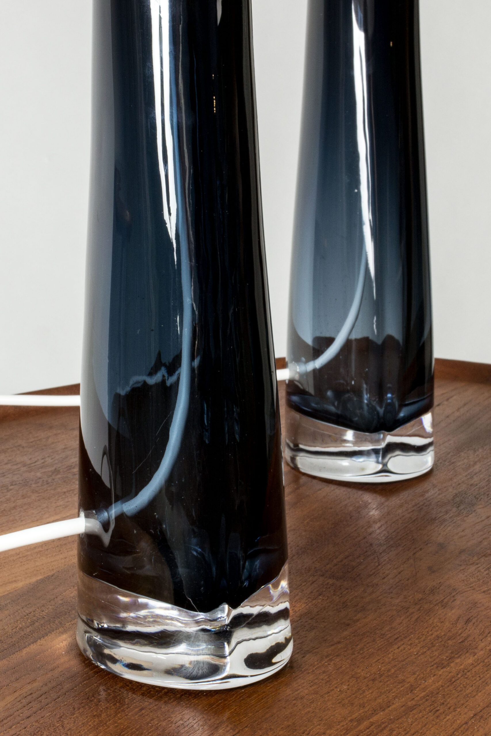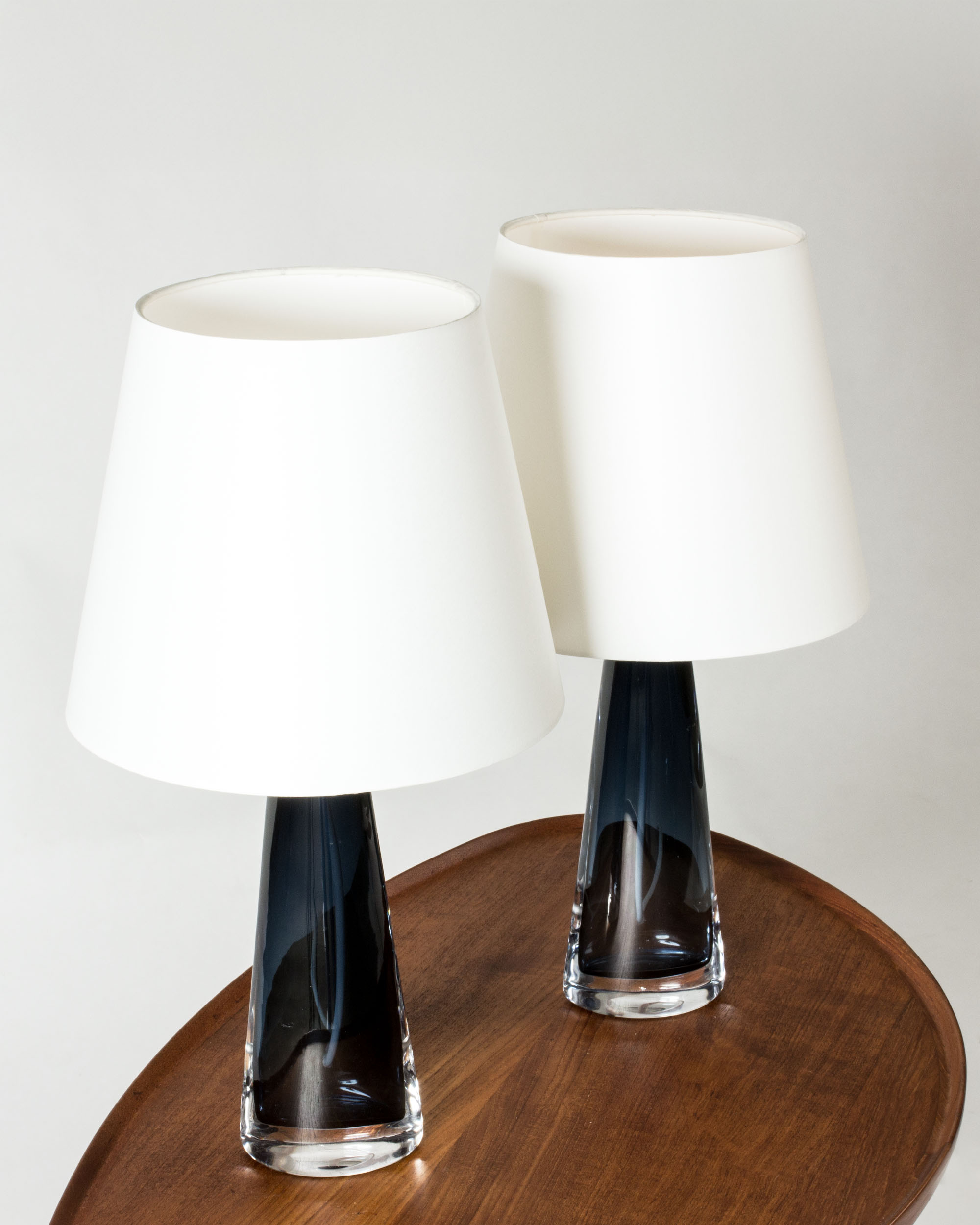 Pair of crystal glass table lamps by Carl Fagerlund, made from dark blue colored glass in a tapering conical shape, almond shaped at the base. Beautiful translucent color, elegant design.