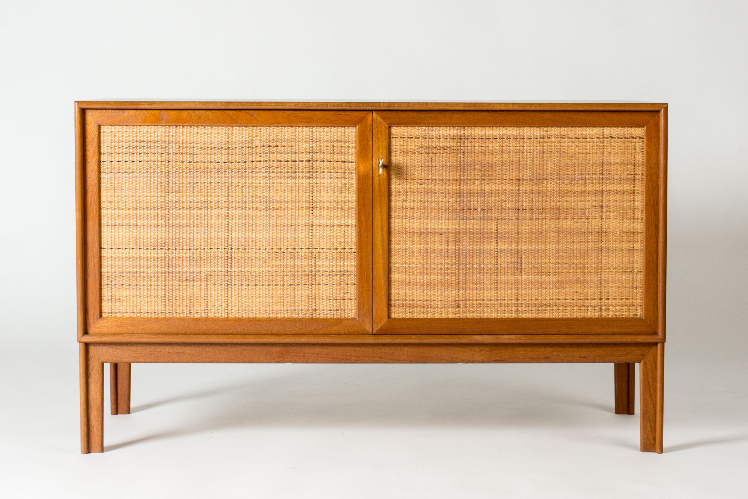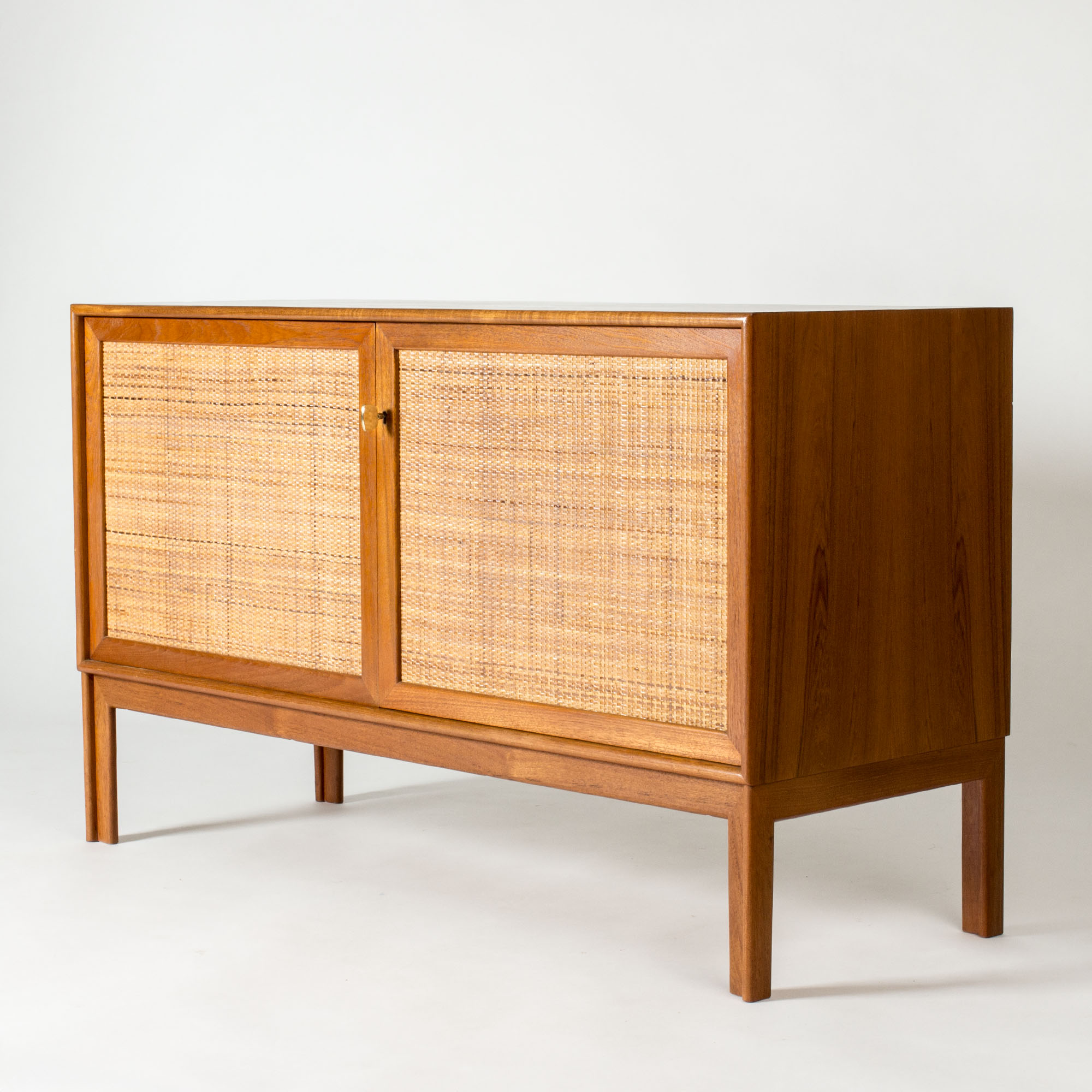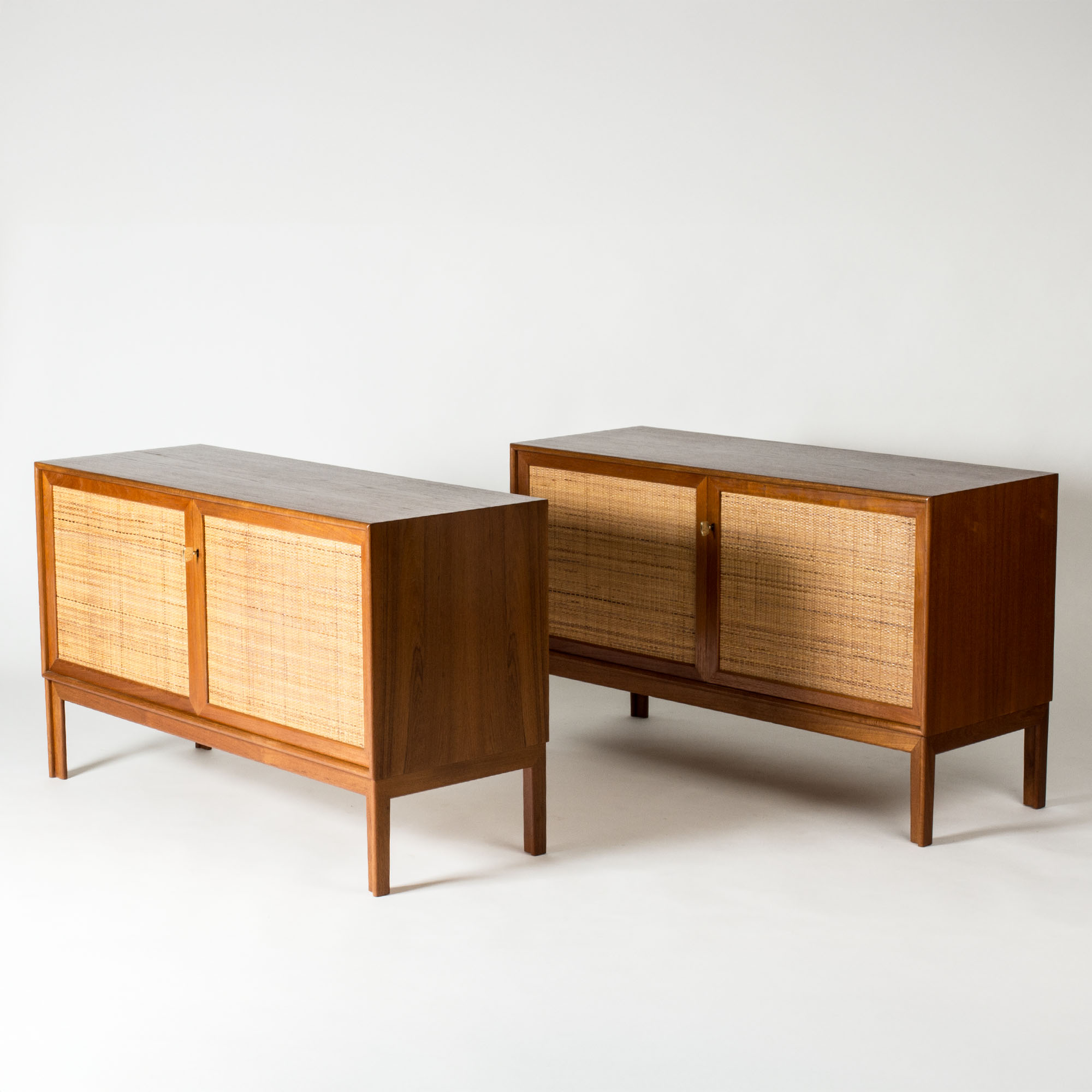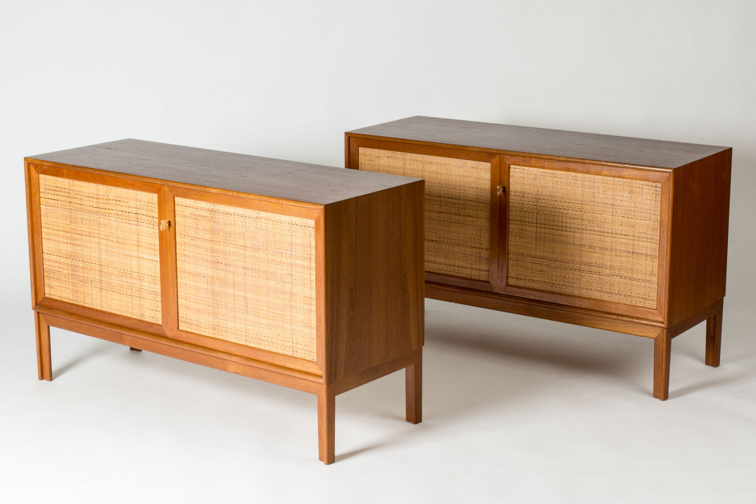 Pair of teak sideboards with beautiful rattan fronts, designed by Alf Svensson. Shelves, and in one drawers, inside each sideboard separated by a wall in the center. Cool, large brass keys and nicely sculpted legs. Beautiful combination of materials.