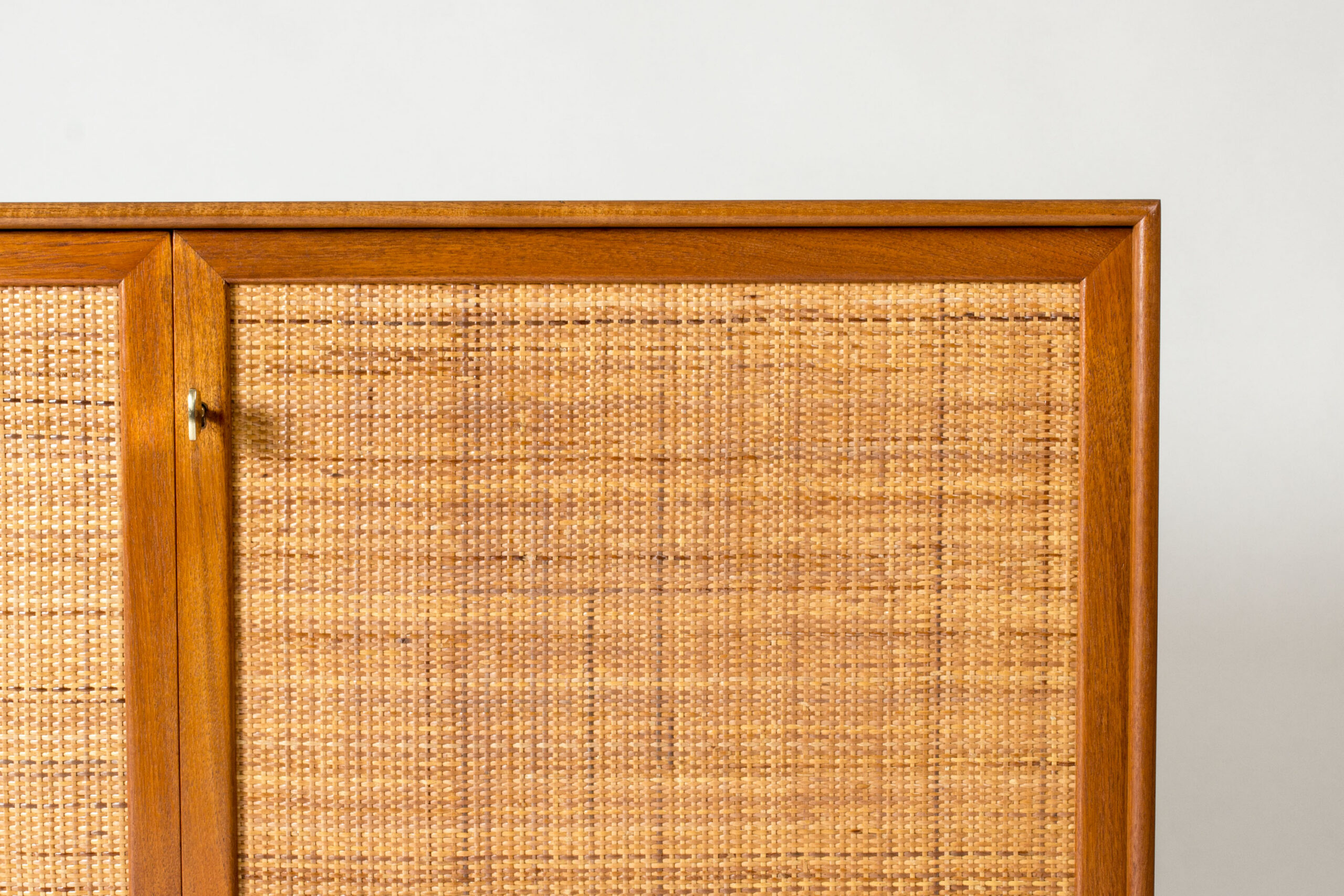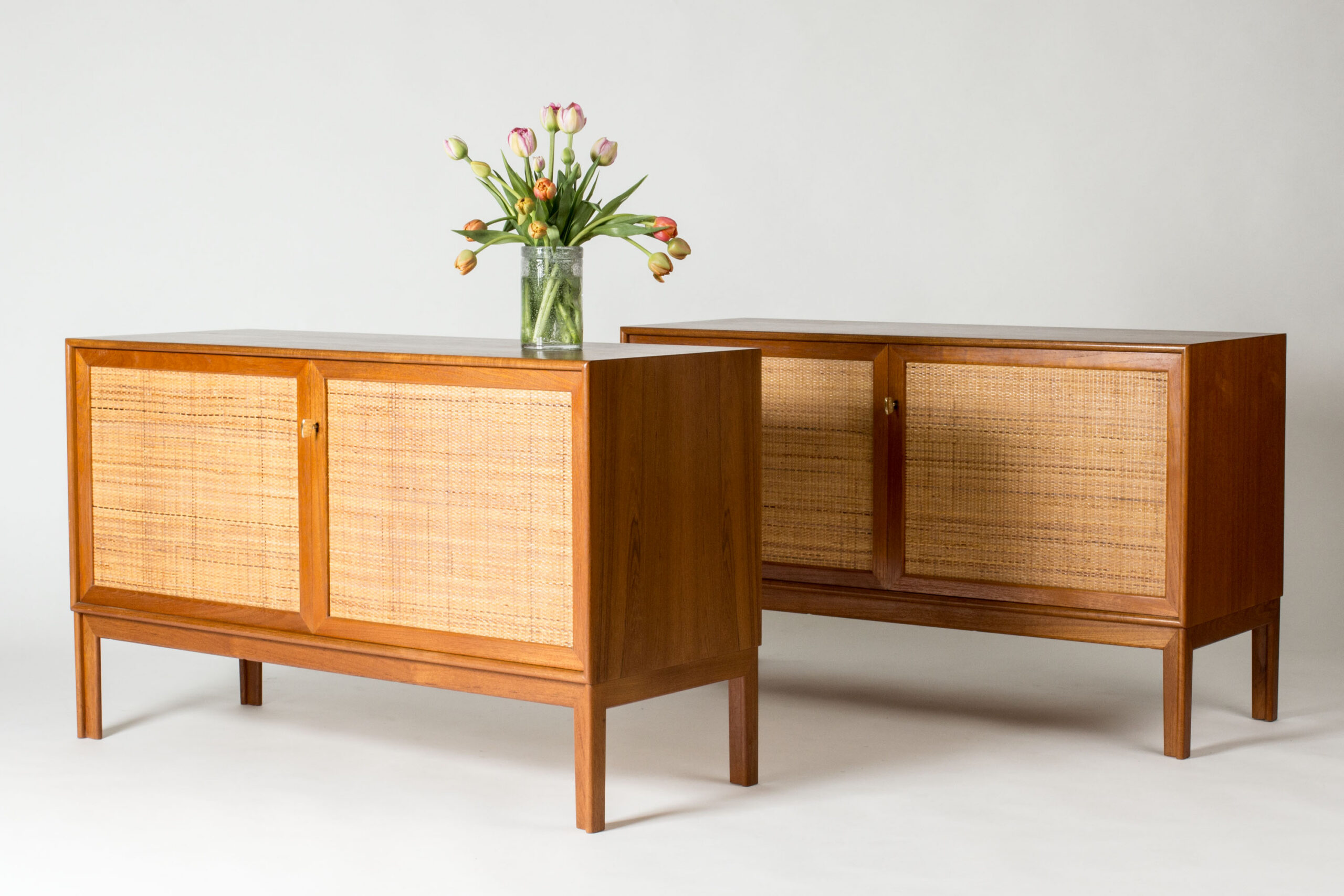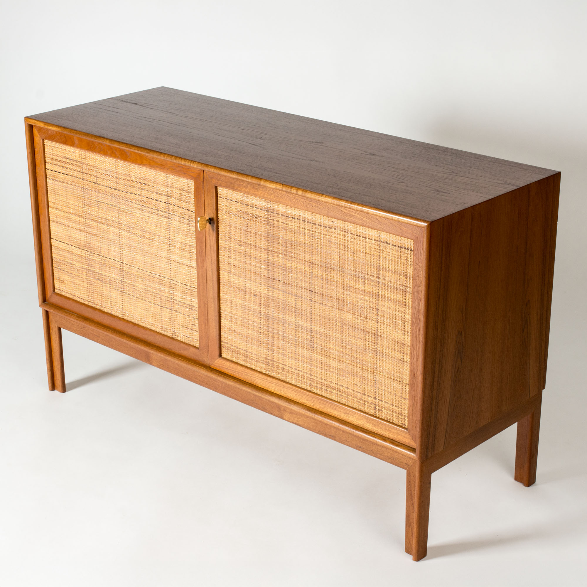 Pair of teak sideboards with beautiful rattan fronts, designed by Alf Svensson. Shelves, and in one drawers, inside each sideboard separated by a wall in the center. Cool, large brass keys and nicely sculpted legs. Beautiful combination of materials.