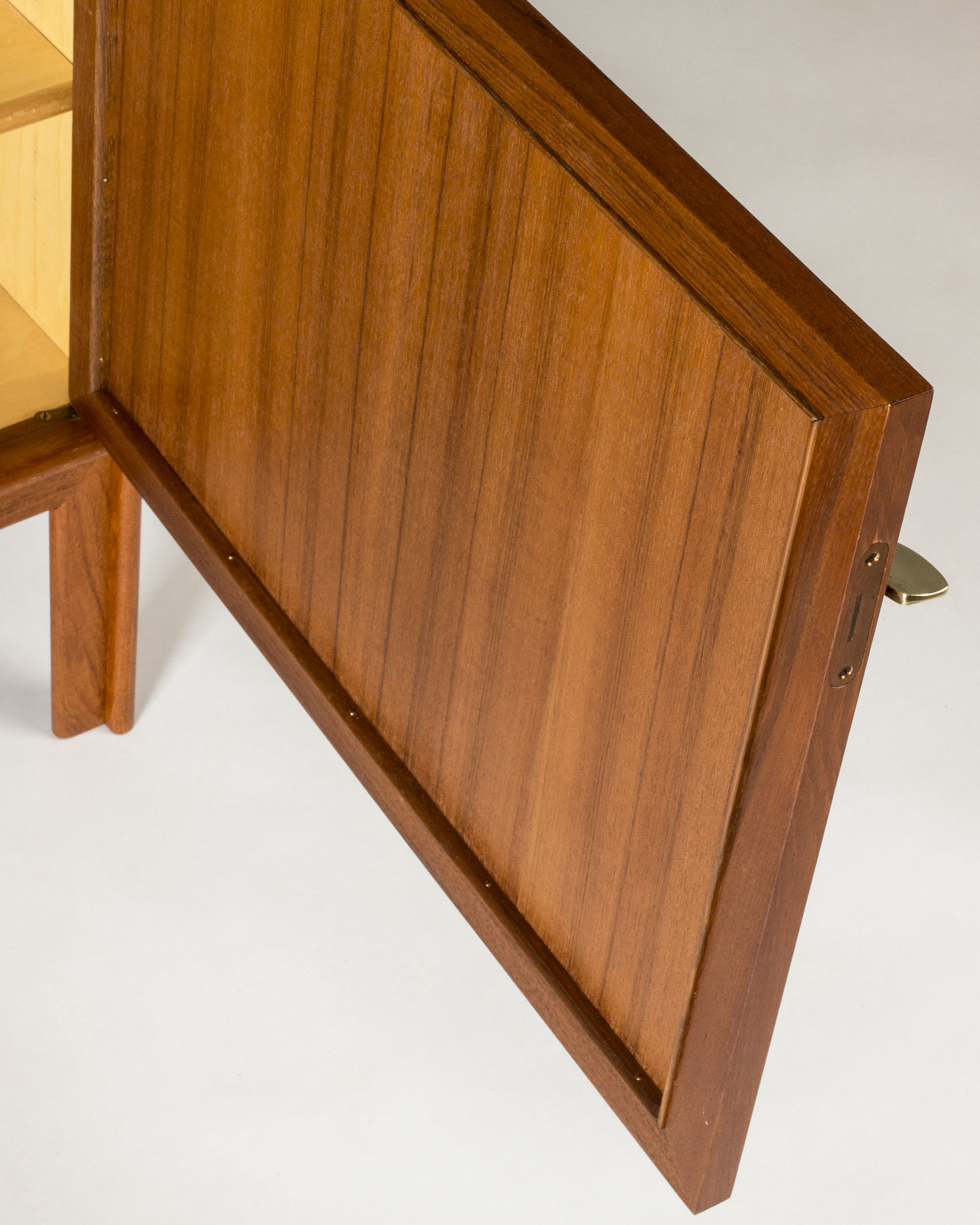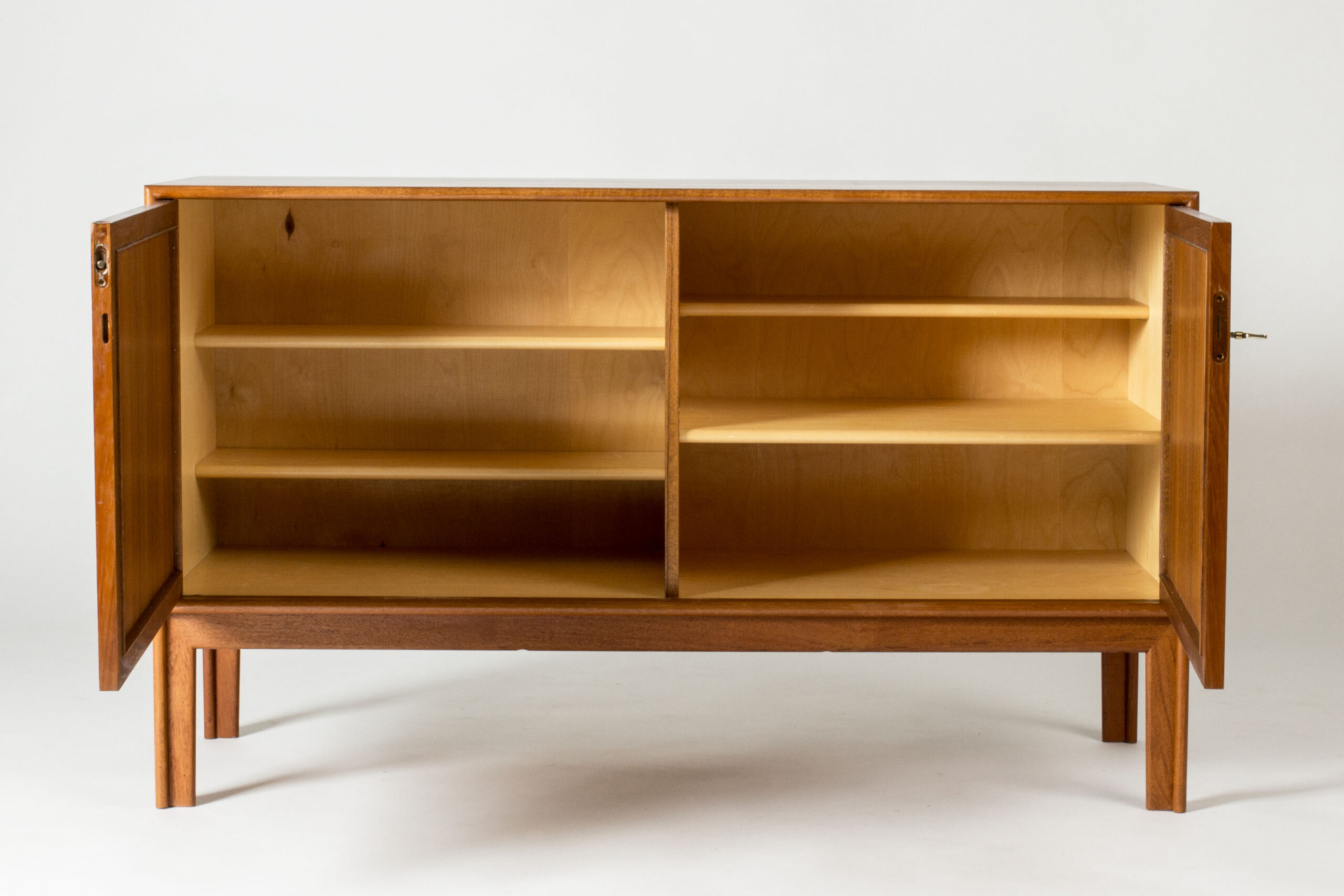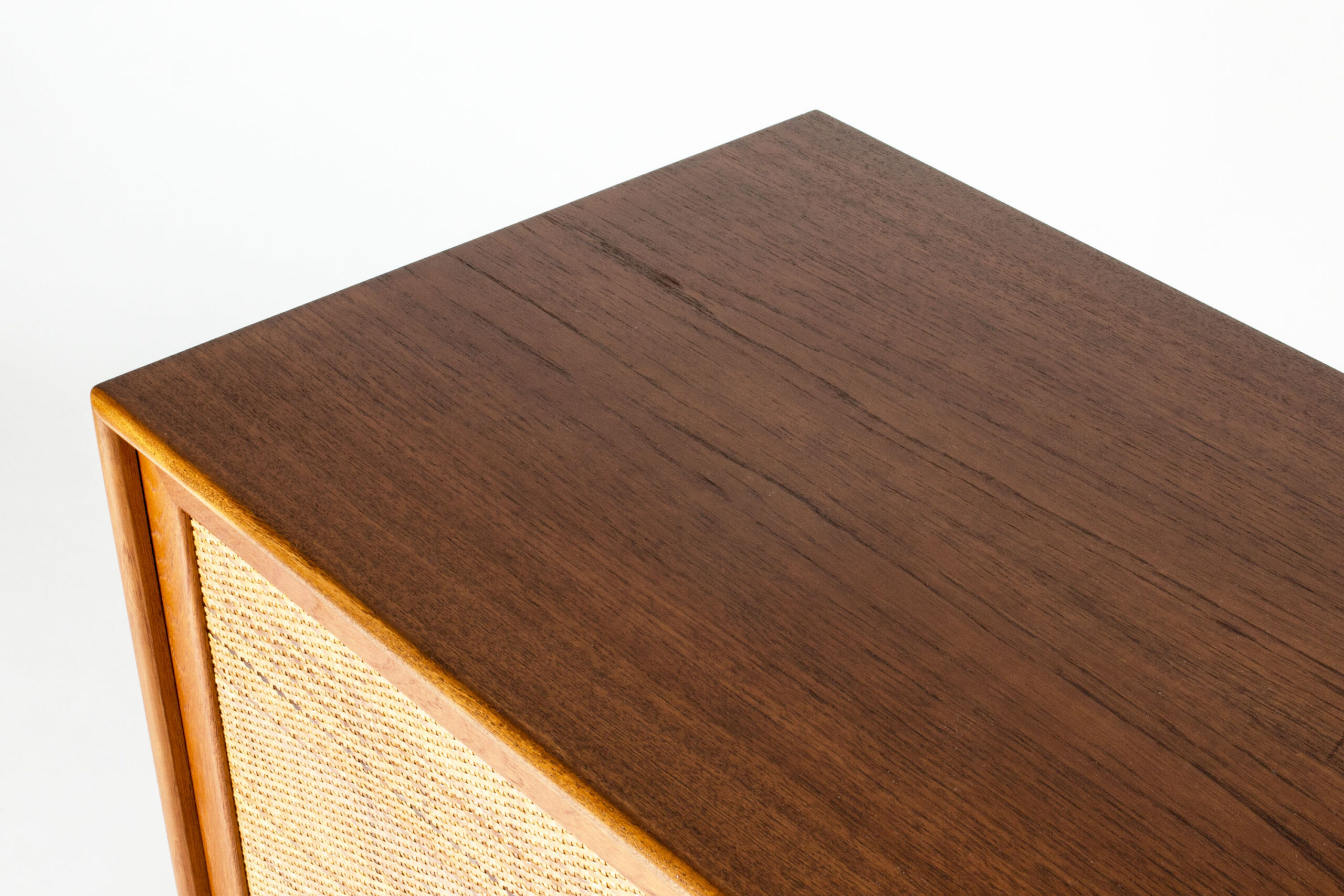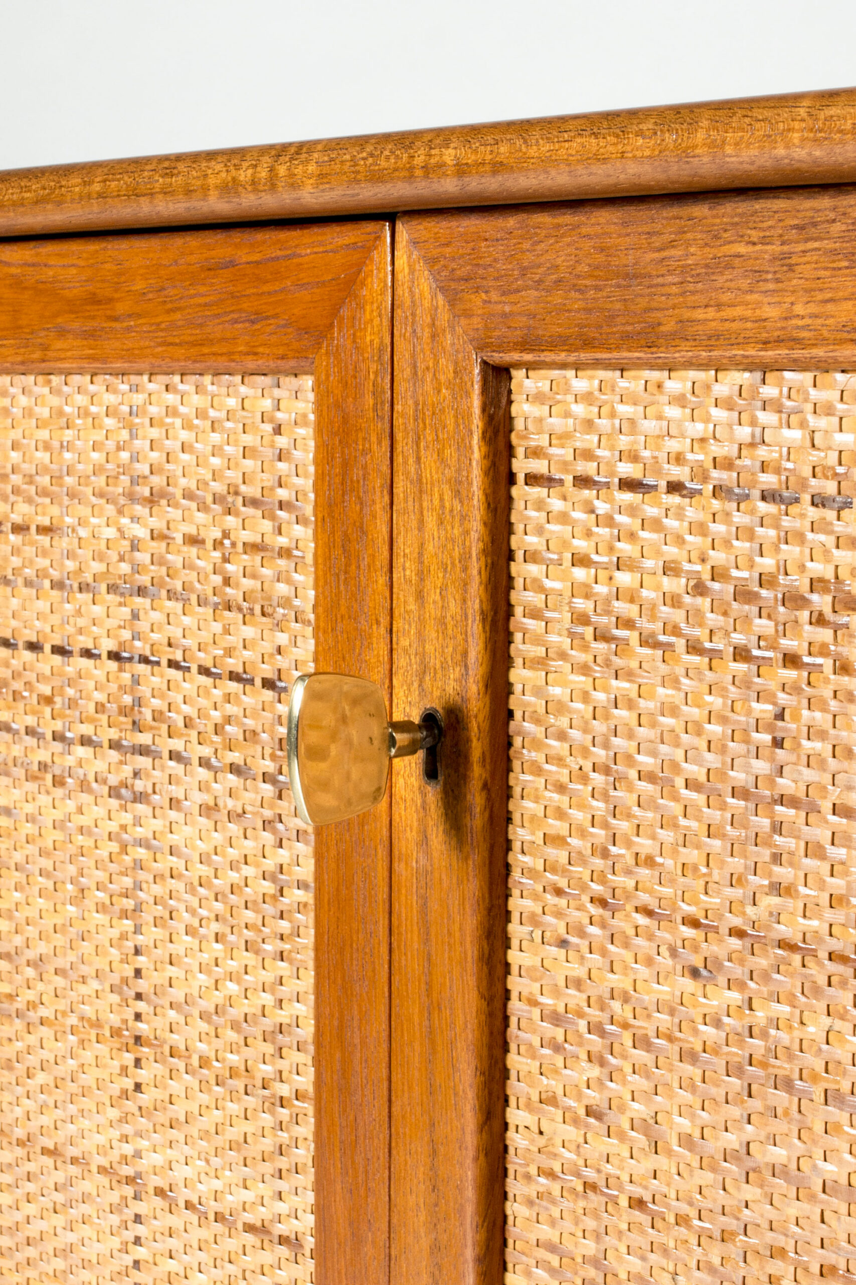 Pair of teak sideboards with beautiful rattan fronts, designed by Alf Svensson. Shelves, and in one drawers, inside each sideboard separated by a wall in the center. Cool, large brass keys and nicely sculpted legs. Beautiful combination of materials.