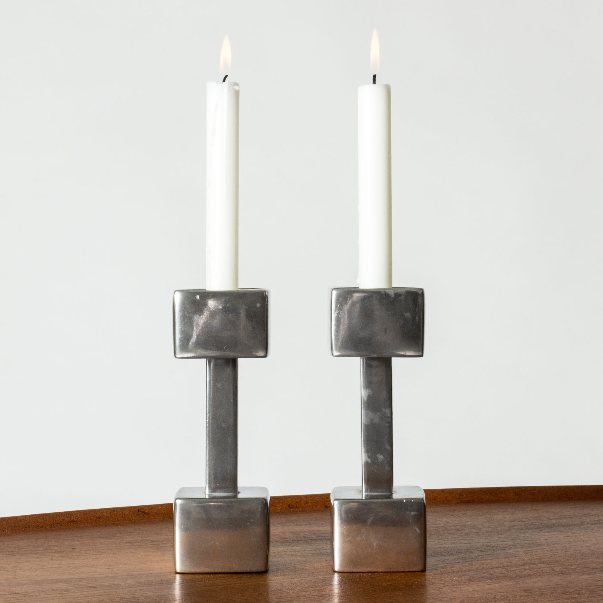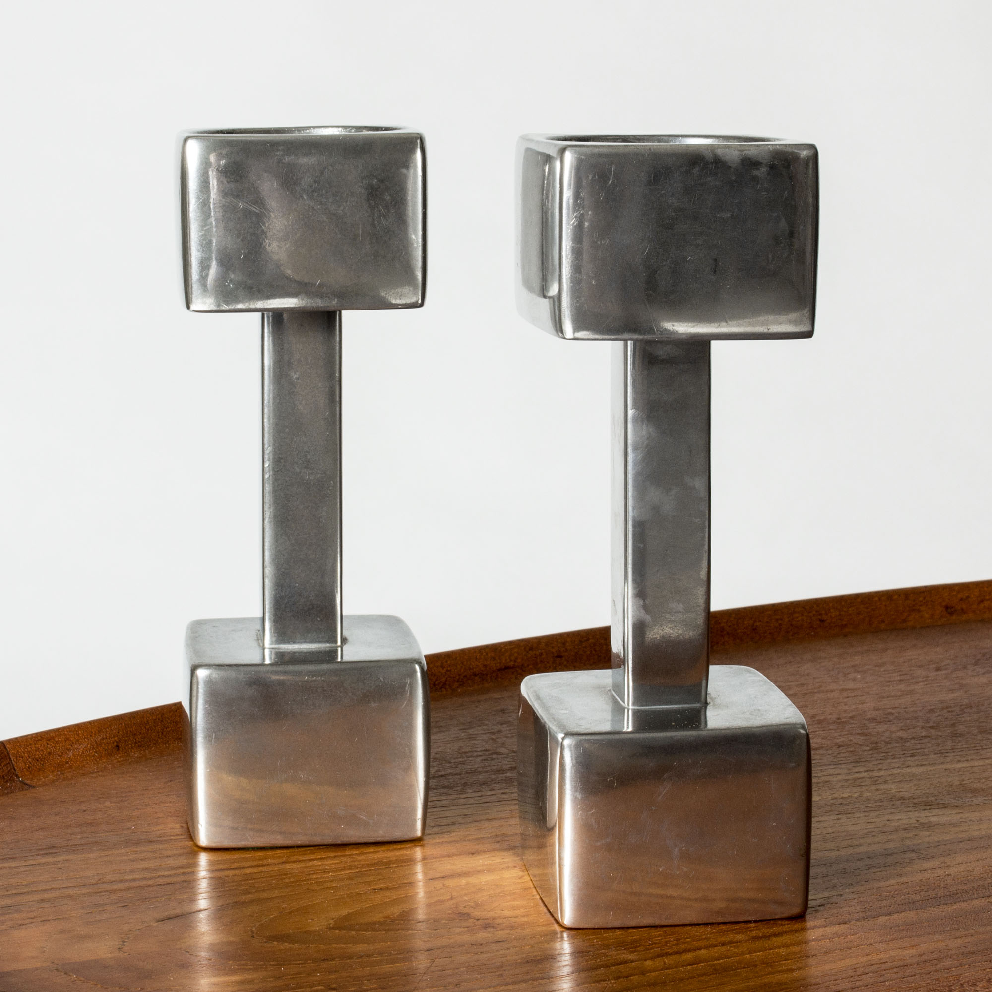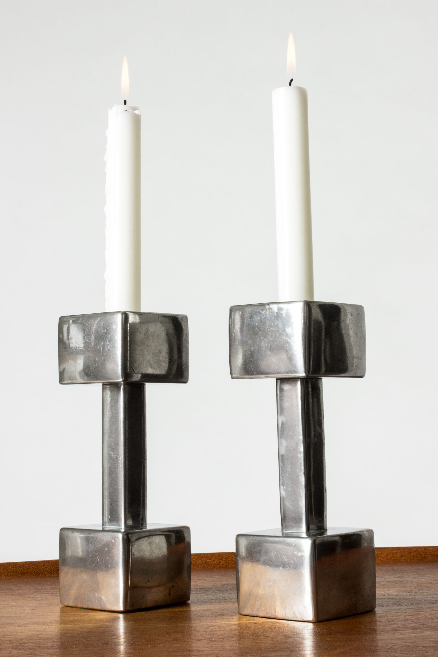 Cool polished pewter candlesticks in a design inspired by weight handles. Designed by Astrid Fog for Just Andersen.