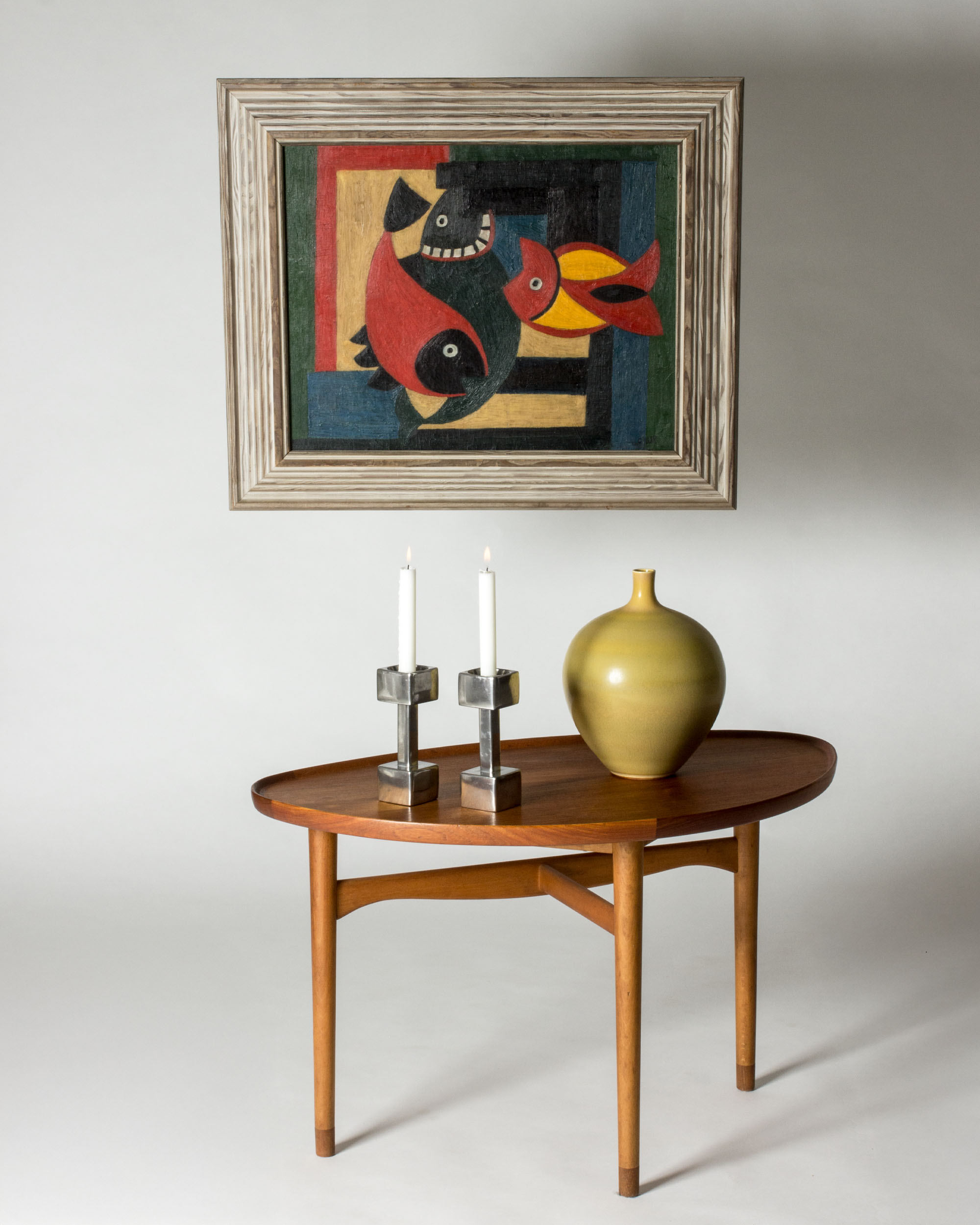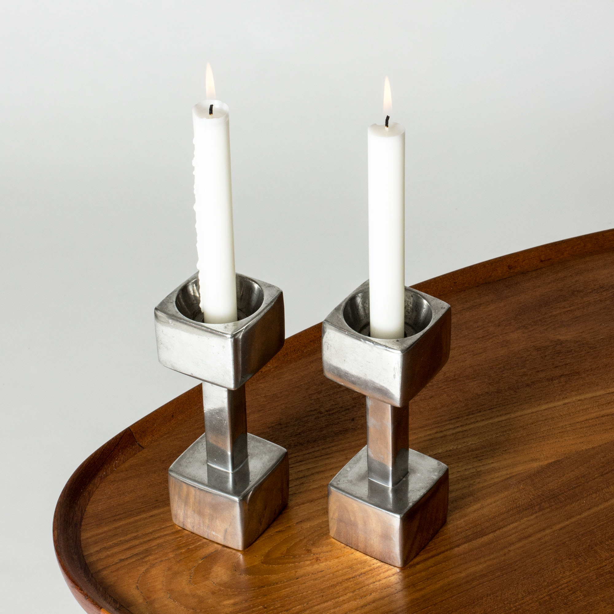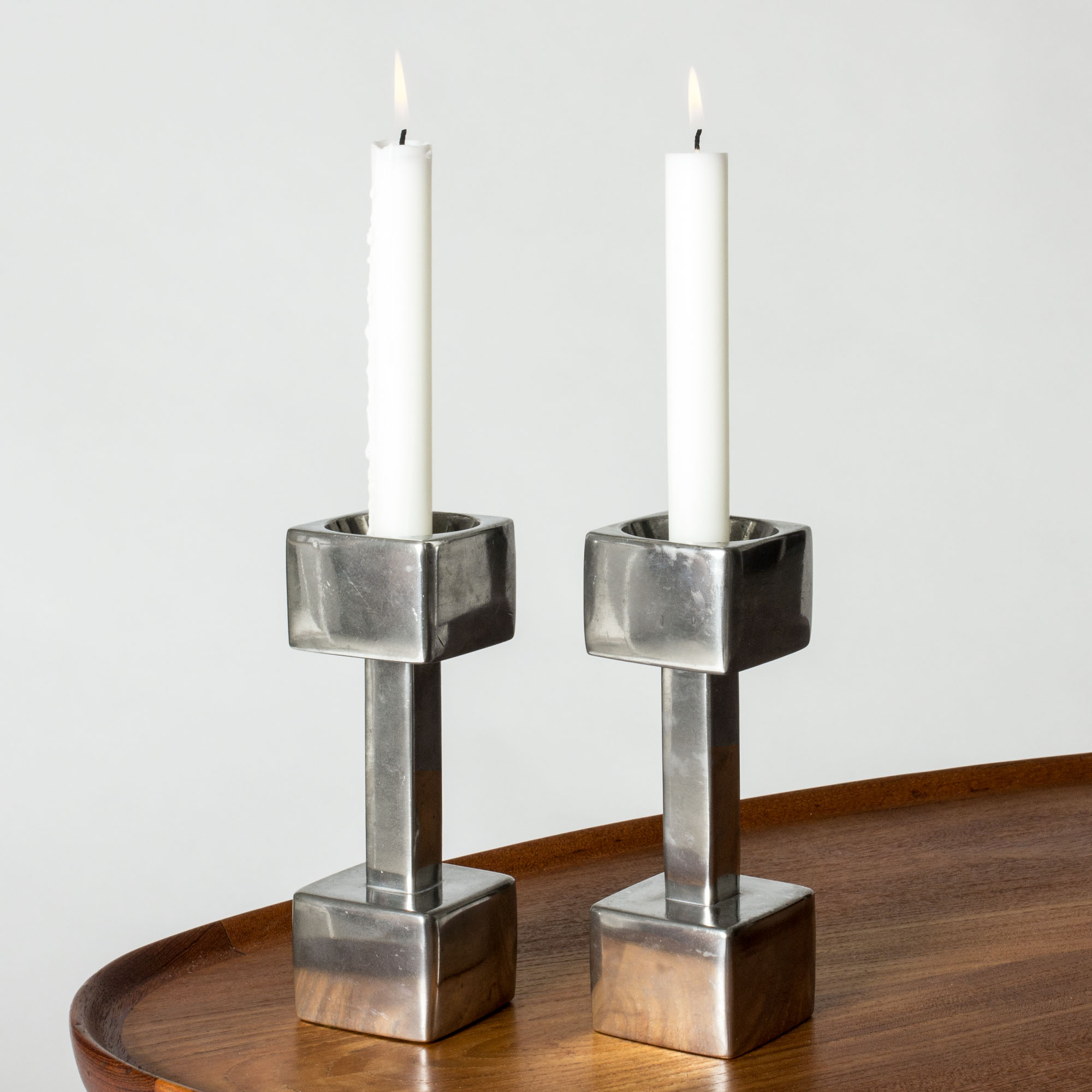 Cool polished pewter candlesticks in a design inspired by weight handles. Designed by Astrid Fog for Just Andersen.
