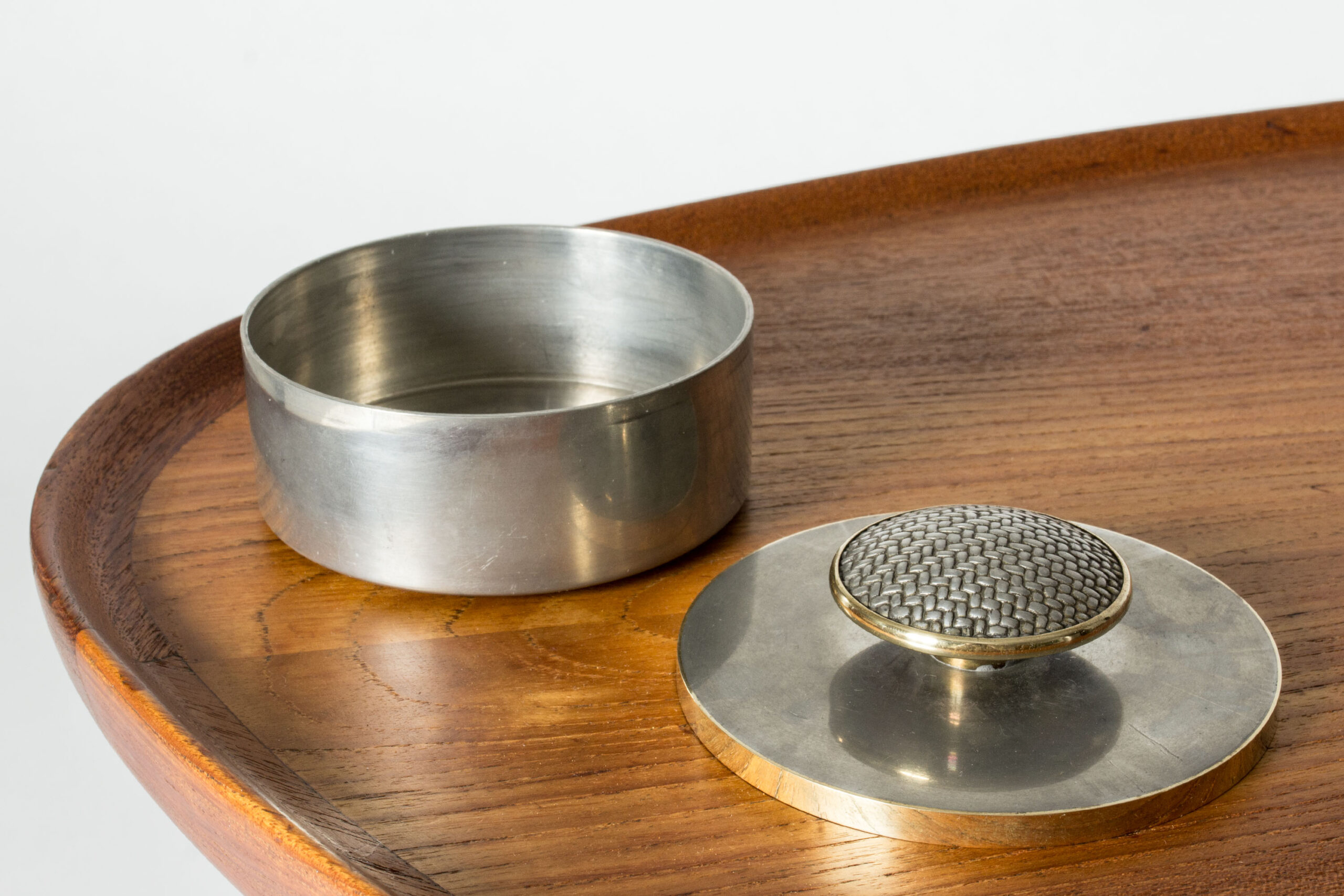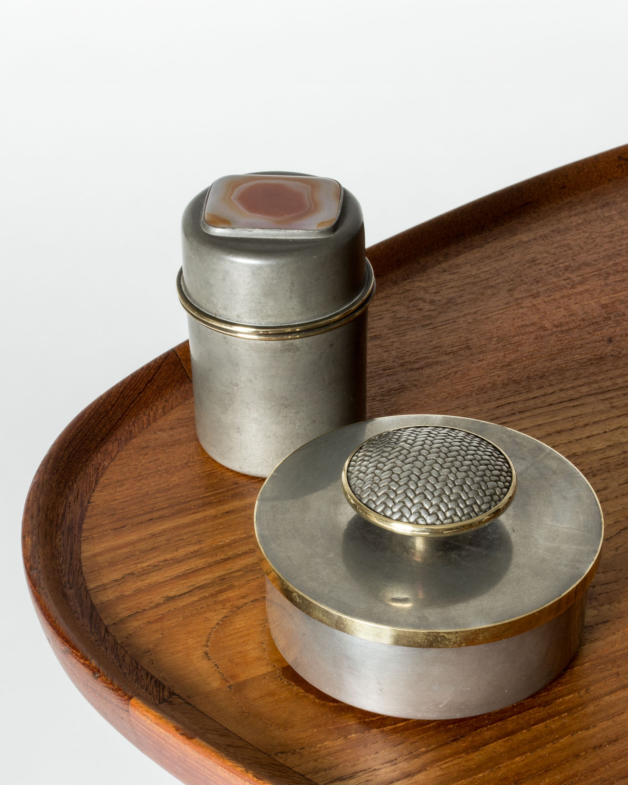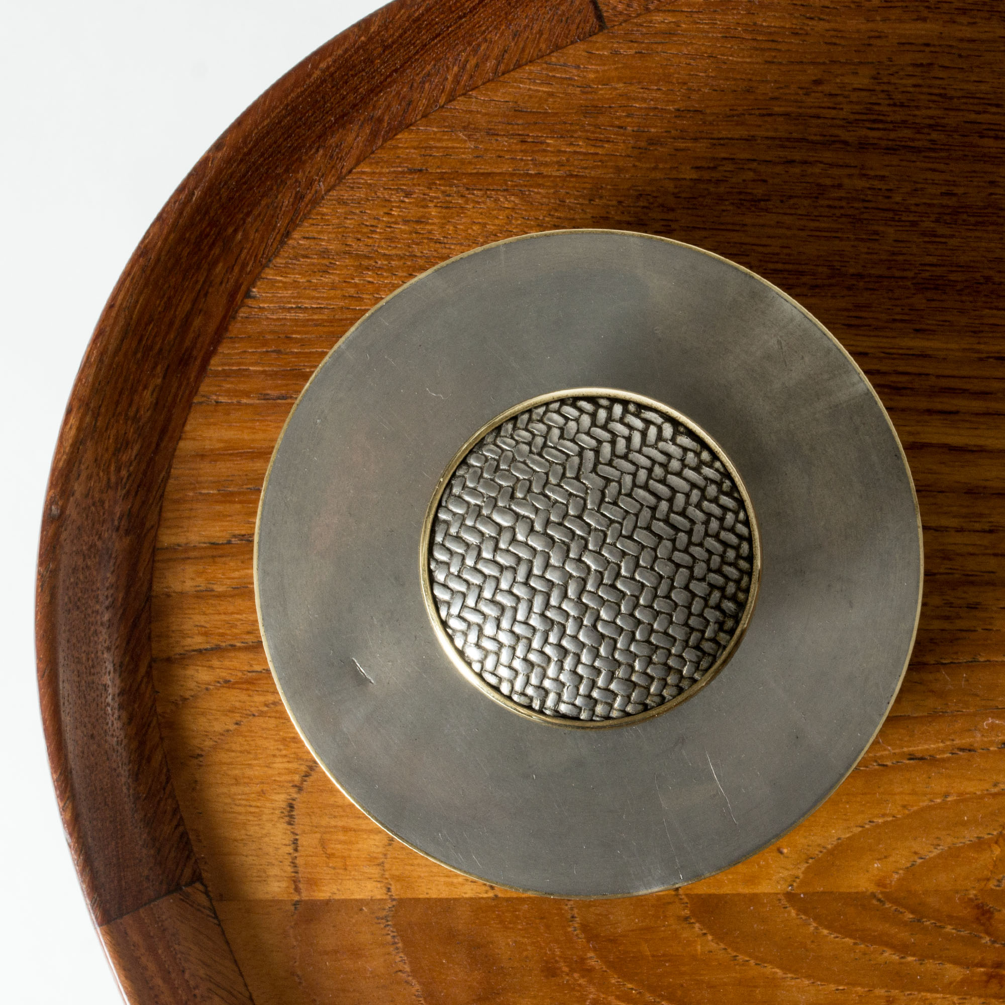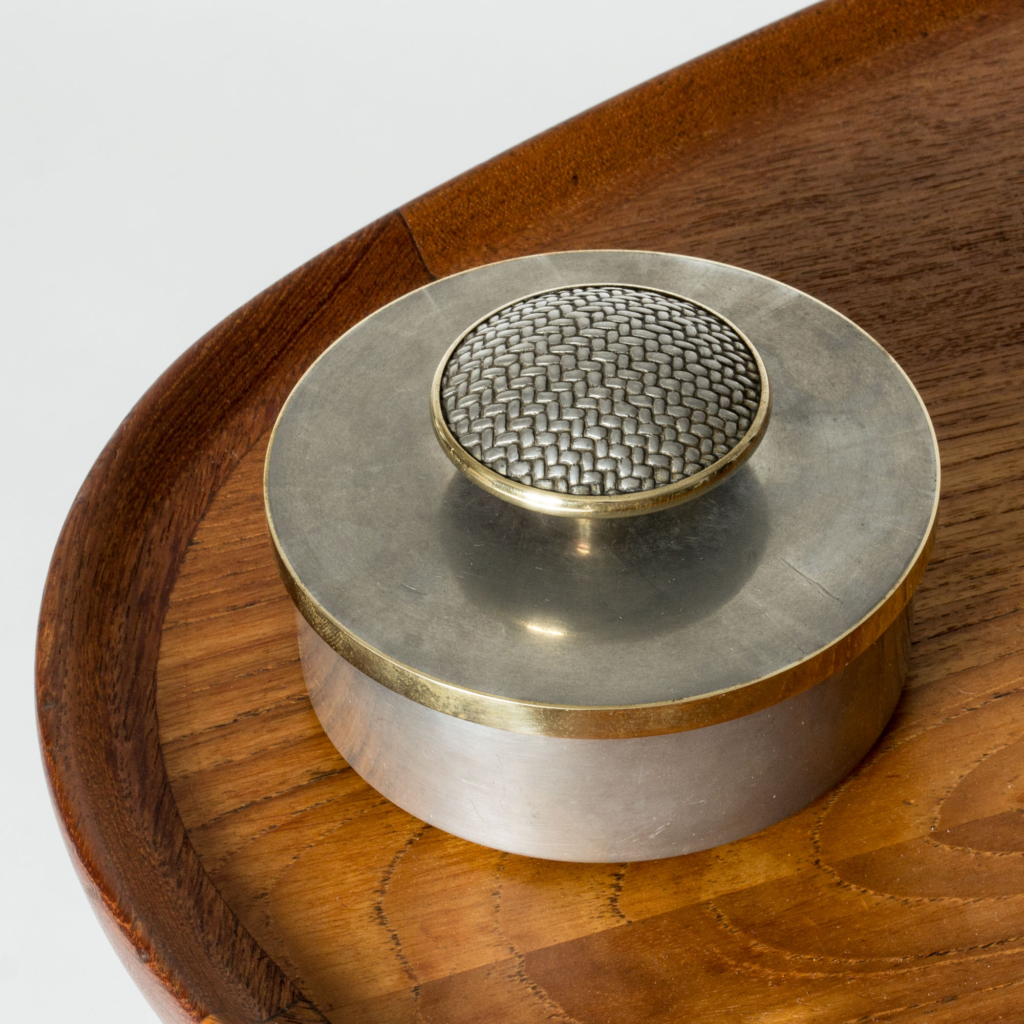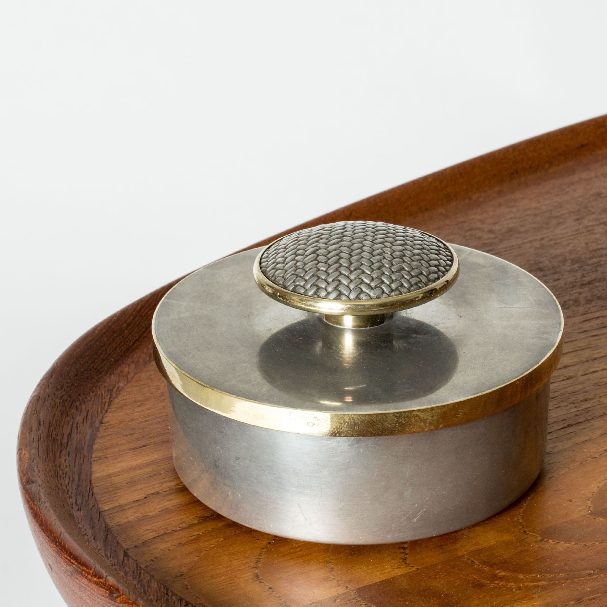 Gorgeous pewter jar by Estrid Ericson for Svenskt Tenn, with a pattern on the knob inspired by the texture of Panama hats. Brass encircles the knob and lid.