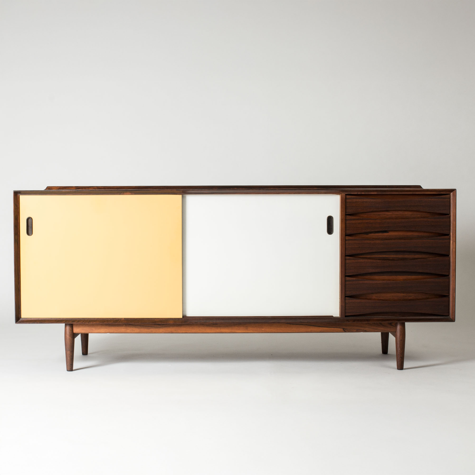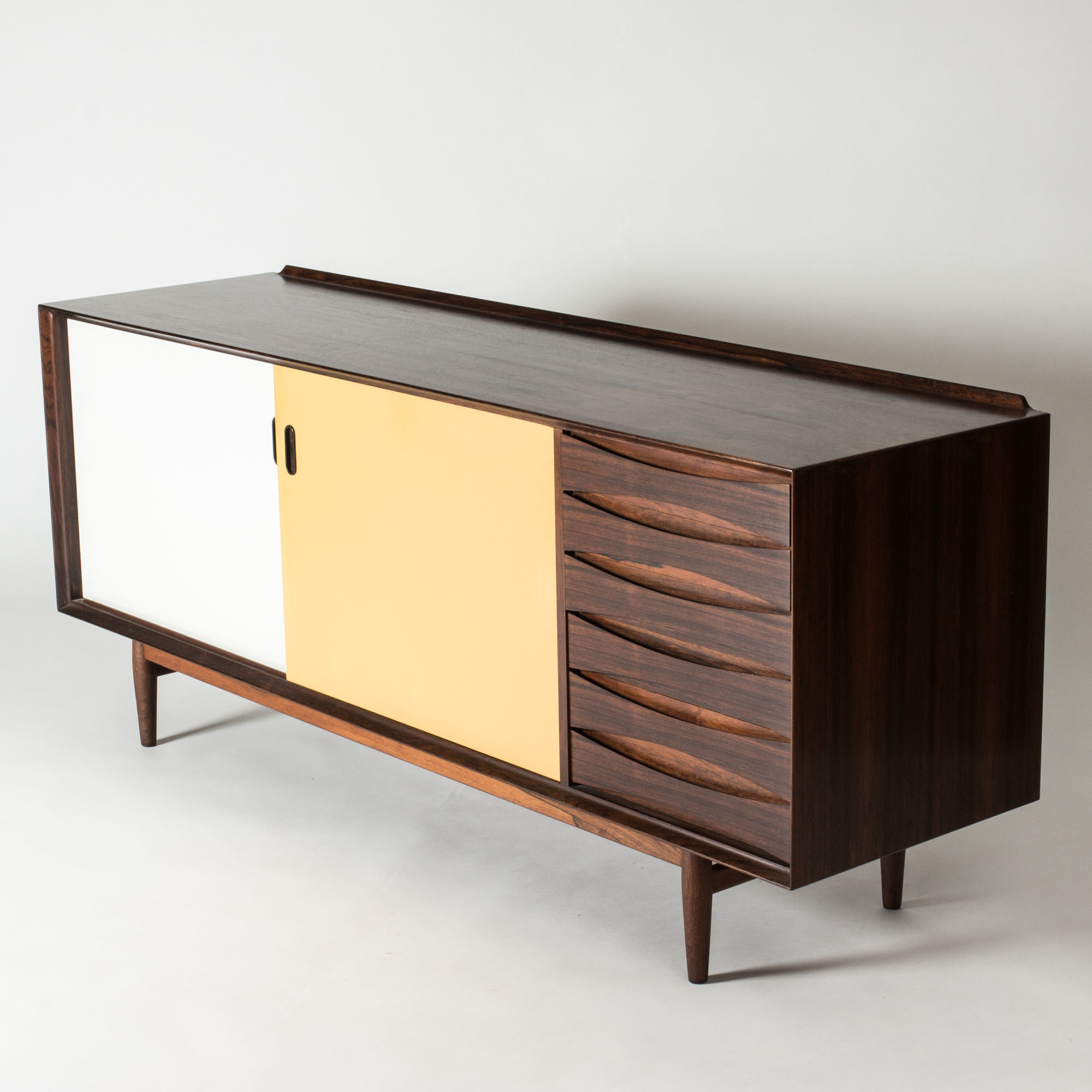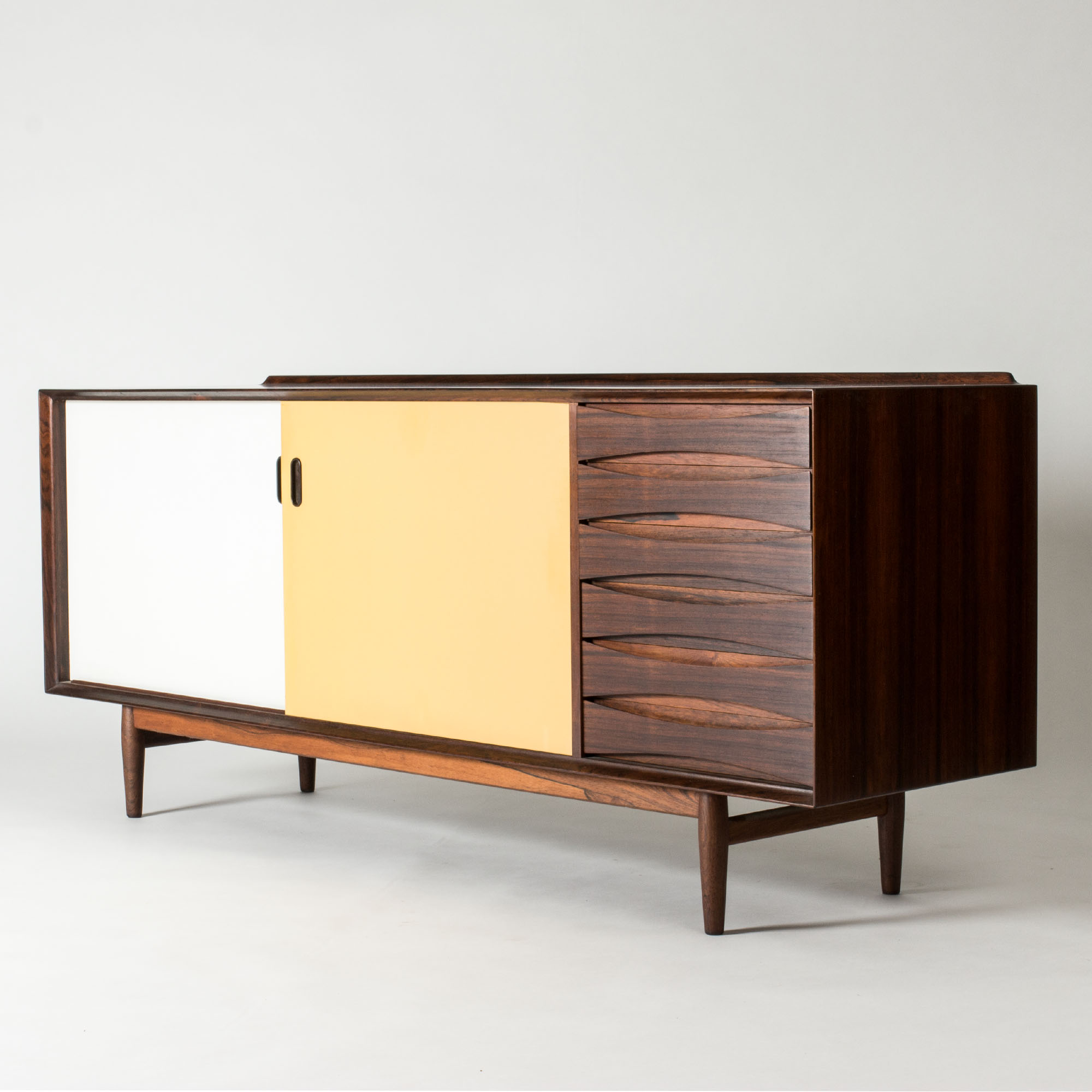 Beautiful “OS29” rosewood sideboard by Arne Vodder, where yellow and white panel doors contrast with the cleanly sculpted drawers to the right. A rim runs along the back of the table top.