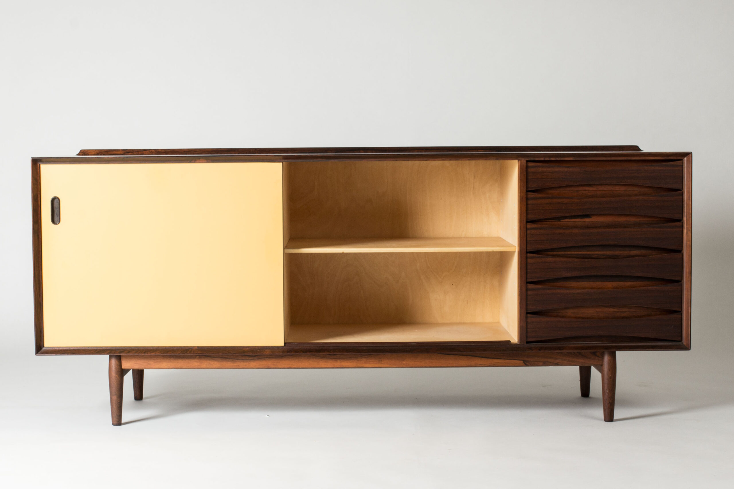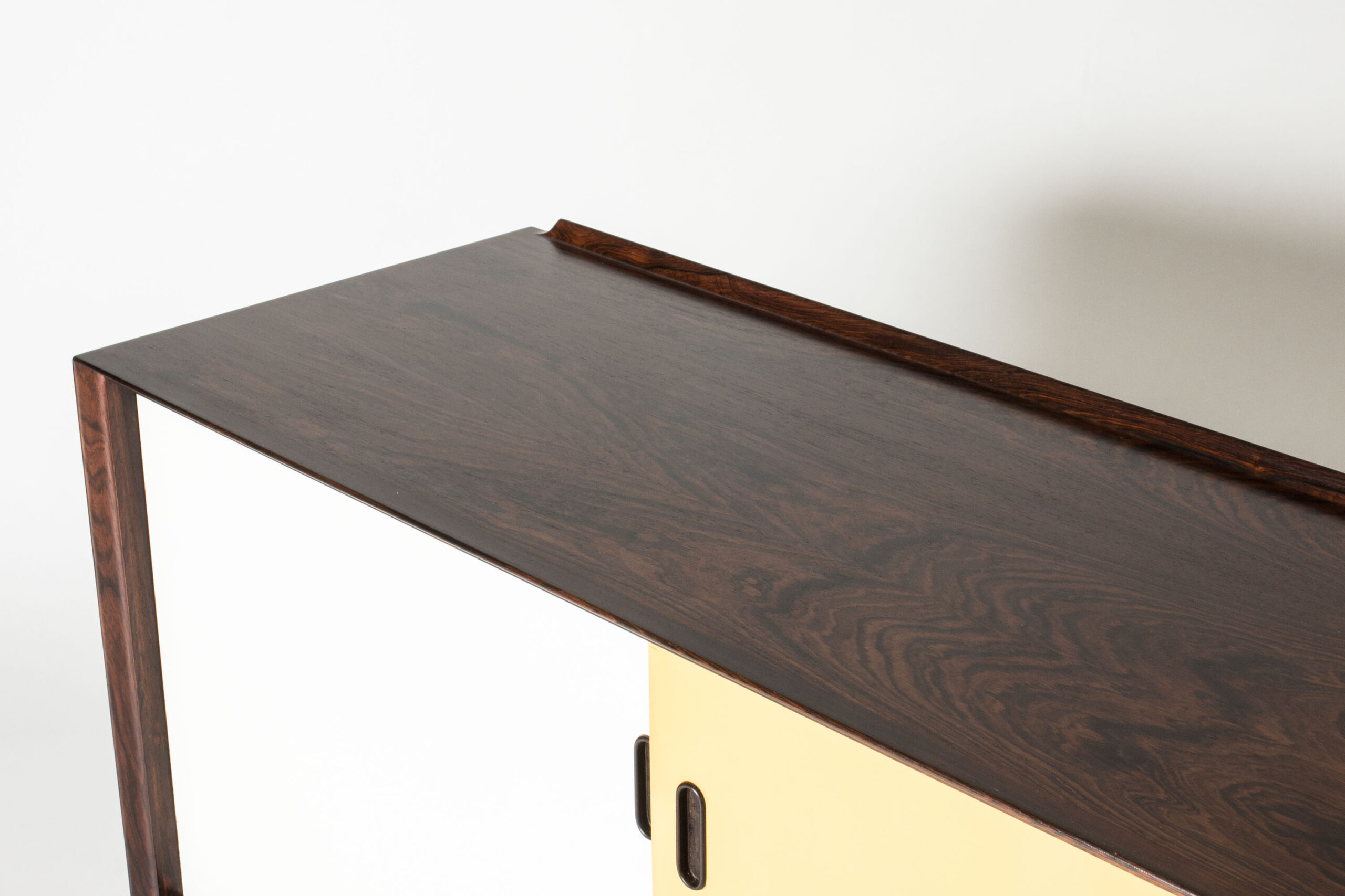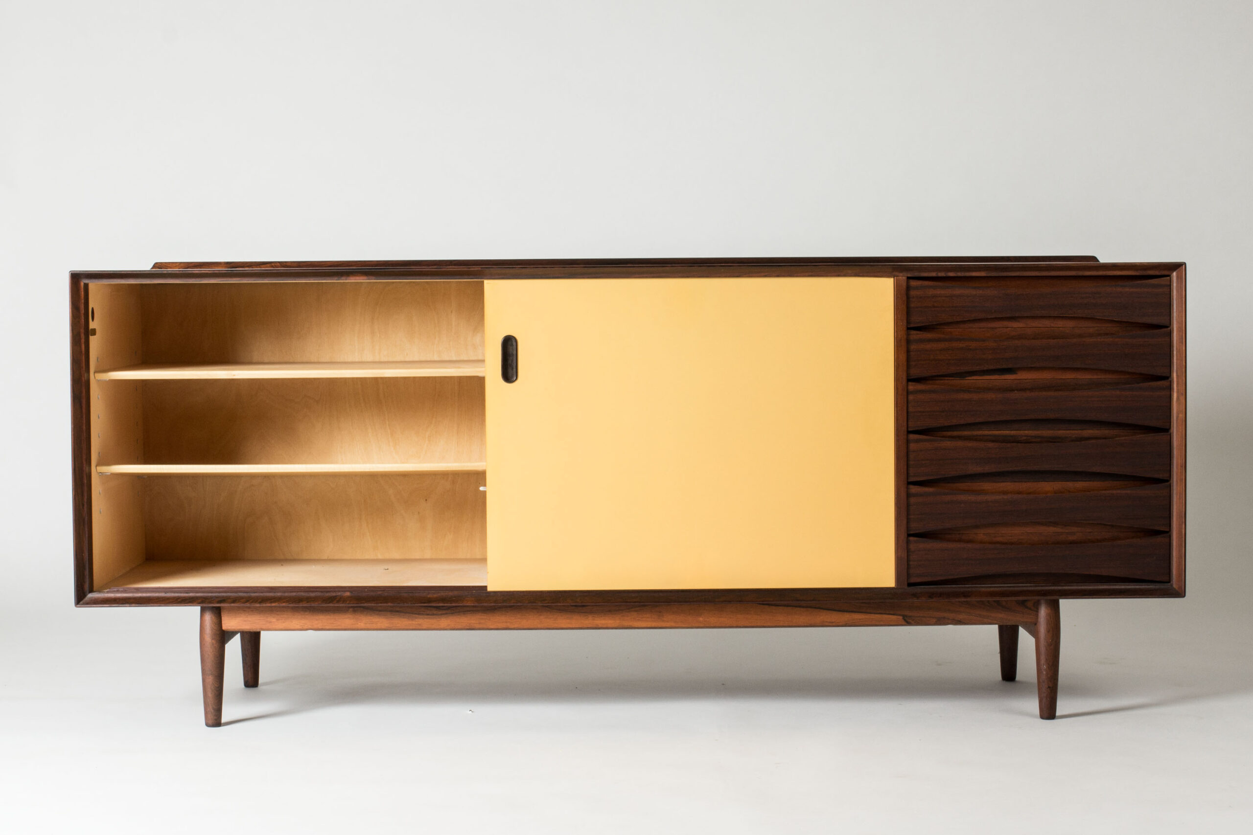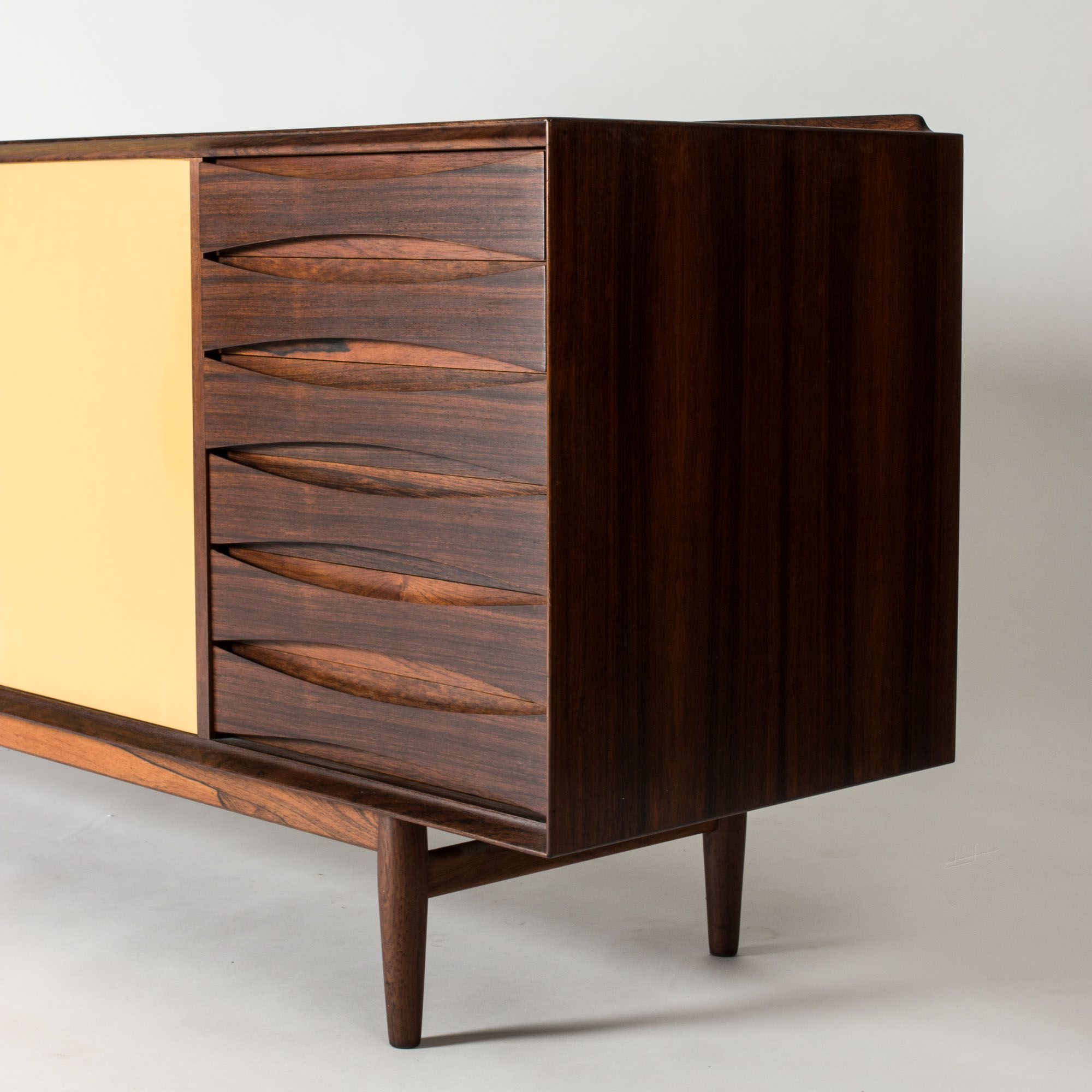 Beautiful “OS29” rosewood sideboard by Arne Vodder, where yellow and white panel doors contrast with the cleanly sculpted drawers to the right. A rim runs along the back of the table top.