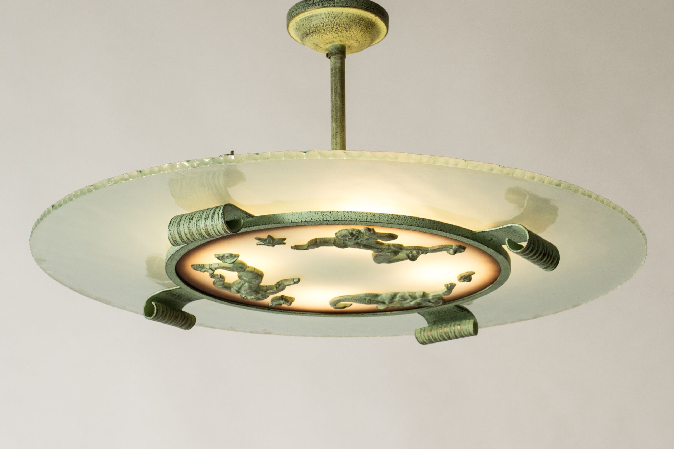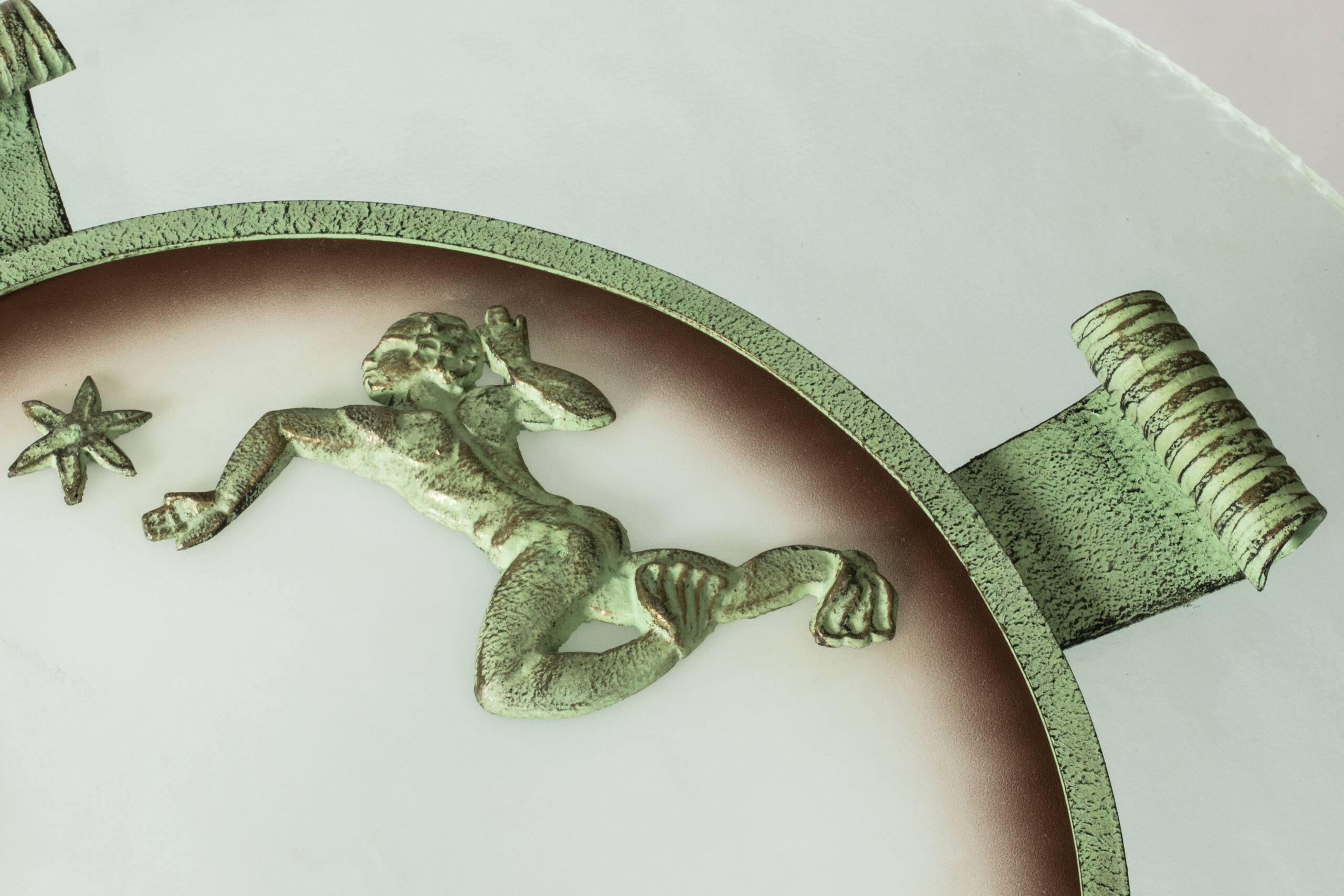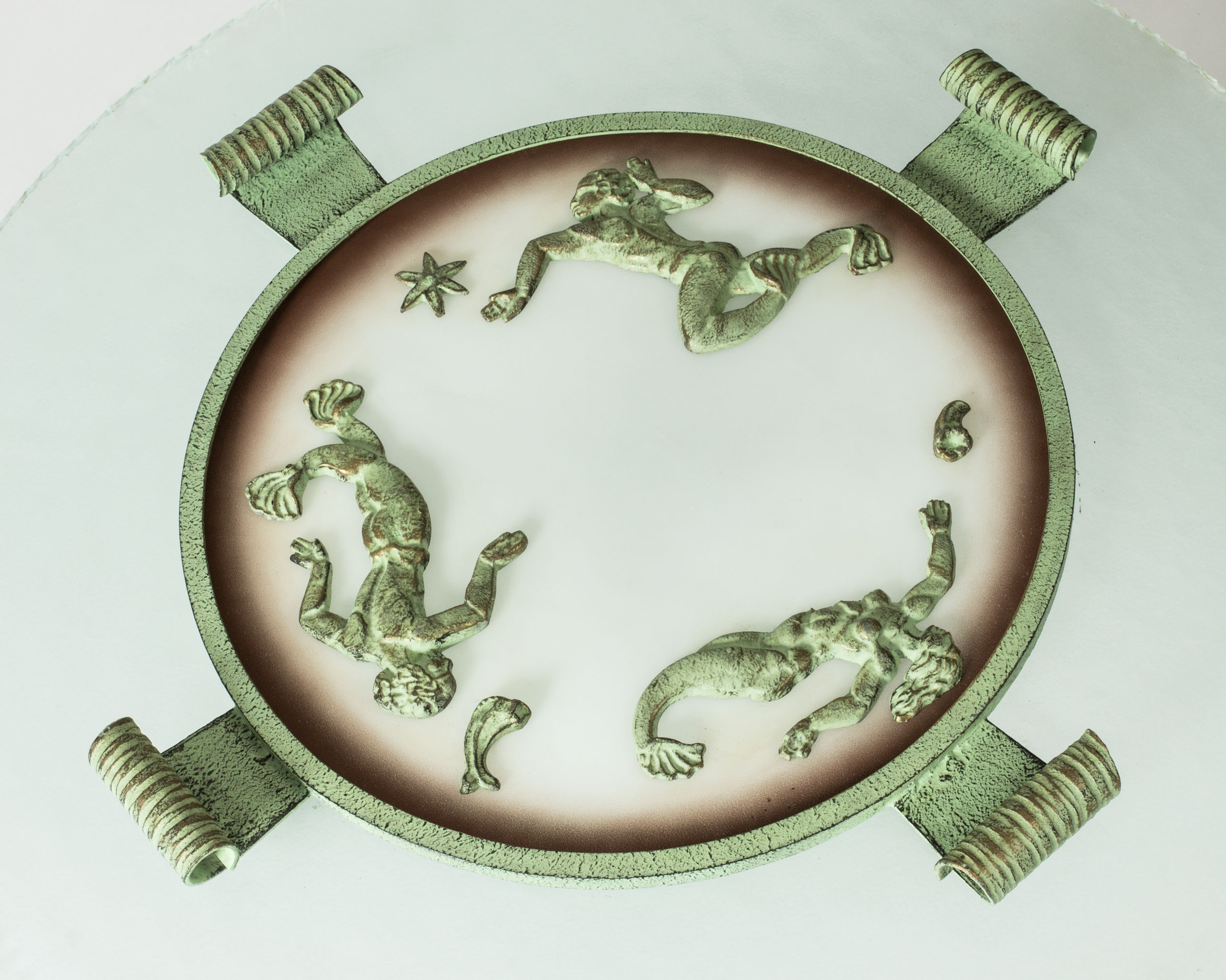 Beautiful, large Swedish Grace flush mount ceiling light from Bjerkås Armatur, made from a sphere of frosted glass. Embellished with green tinted bronze decor of starfish and mermaids.