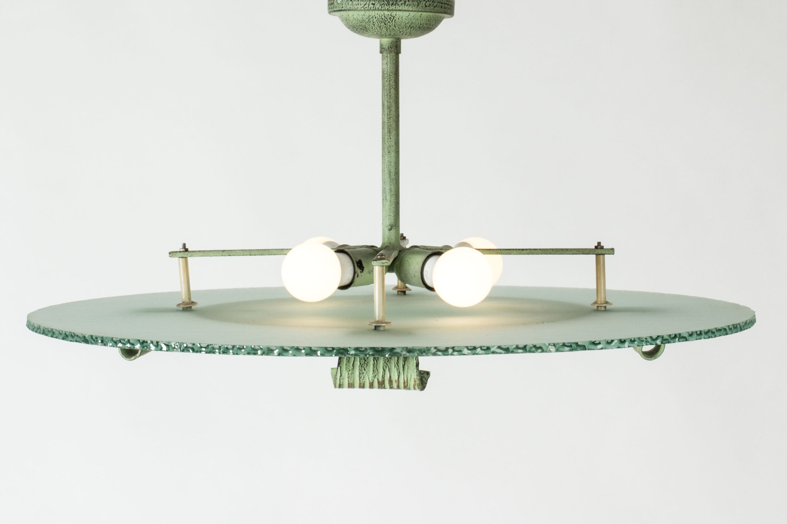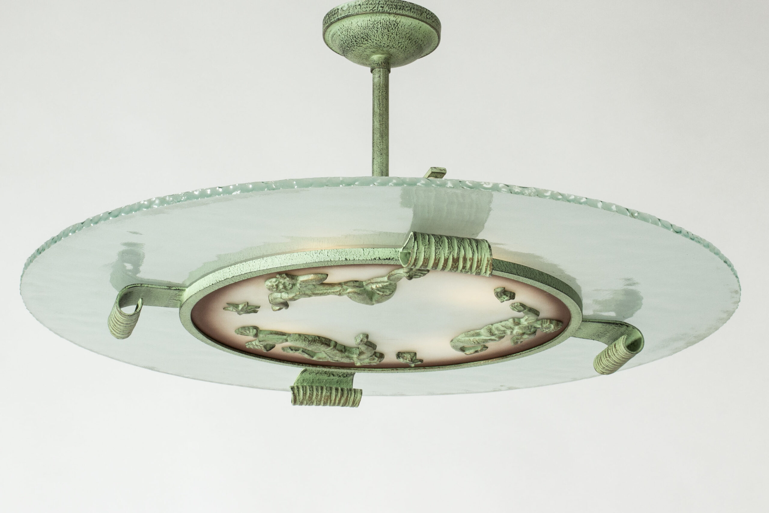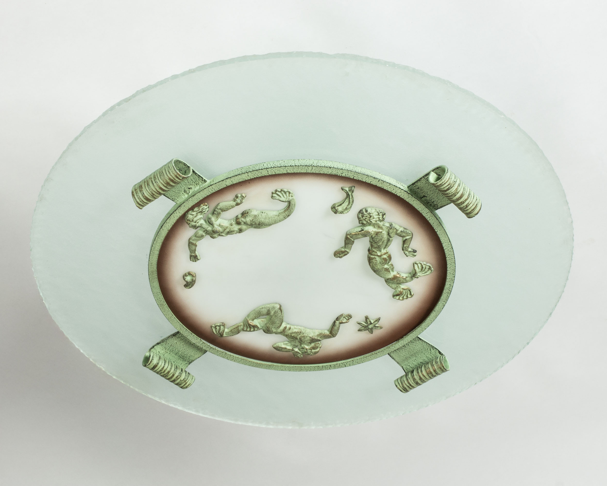 Beautiful, large Swedish Grace flush mount ceiling light from Bjerkås Armatur, made from a sphere of frosted glass. Embellished with green tinted bronze decor of starfish and mermaids.