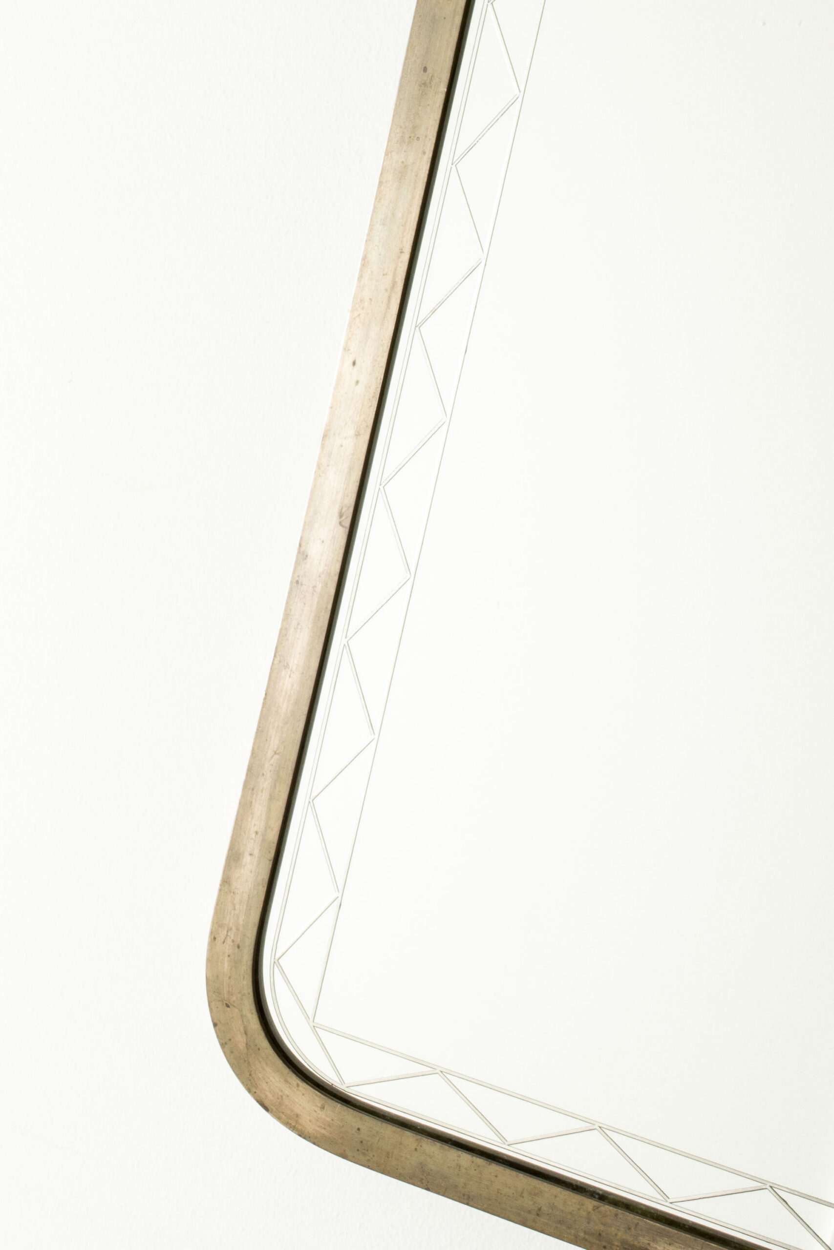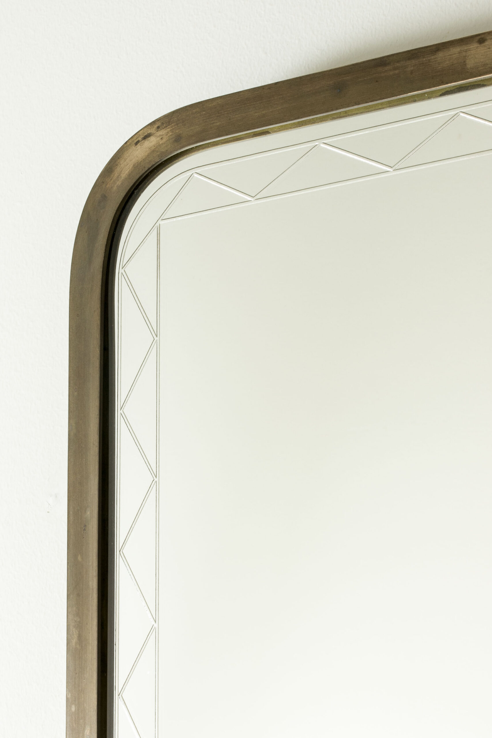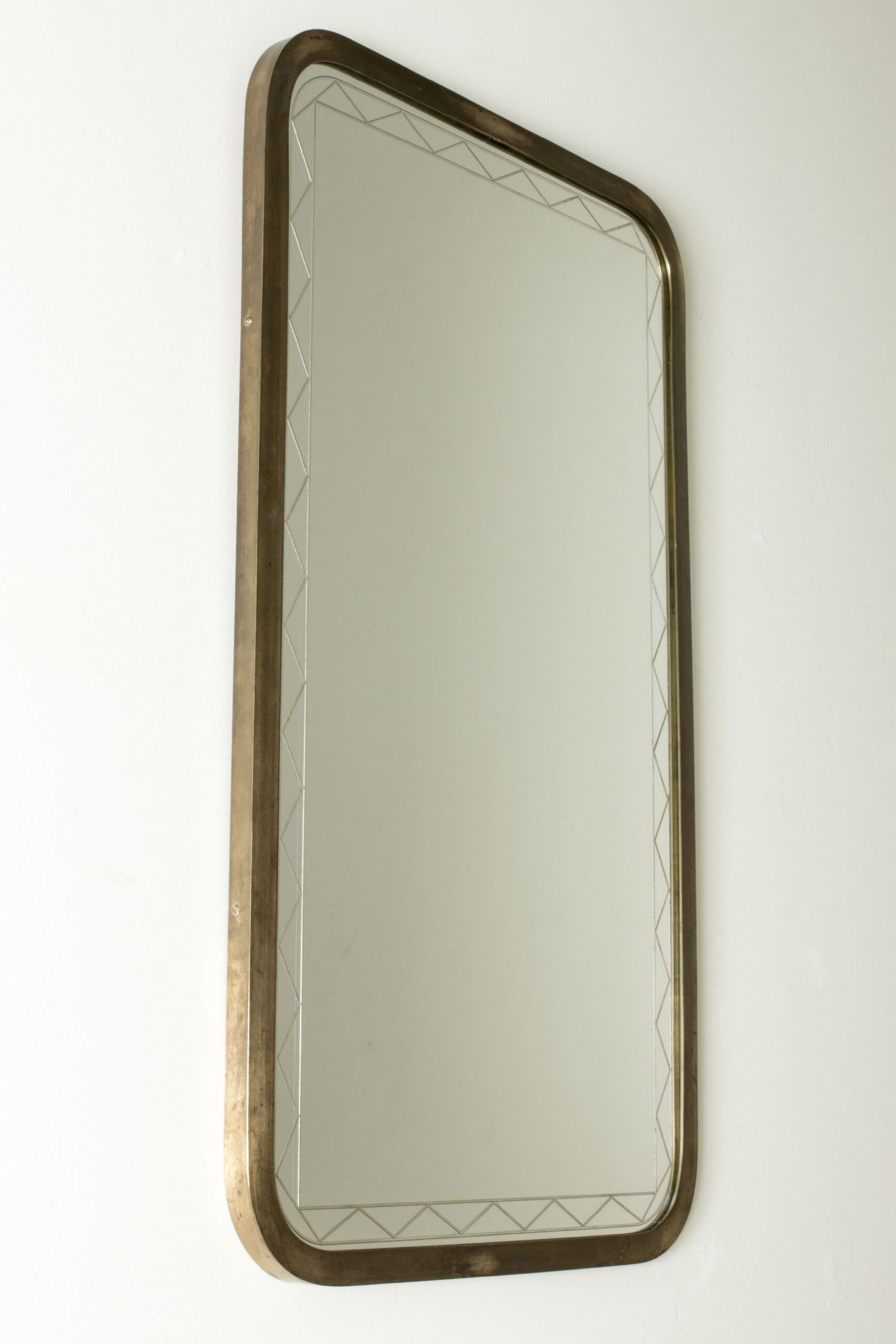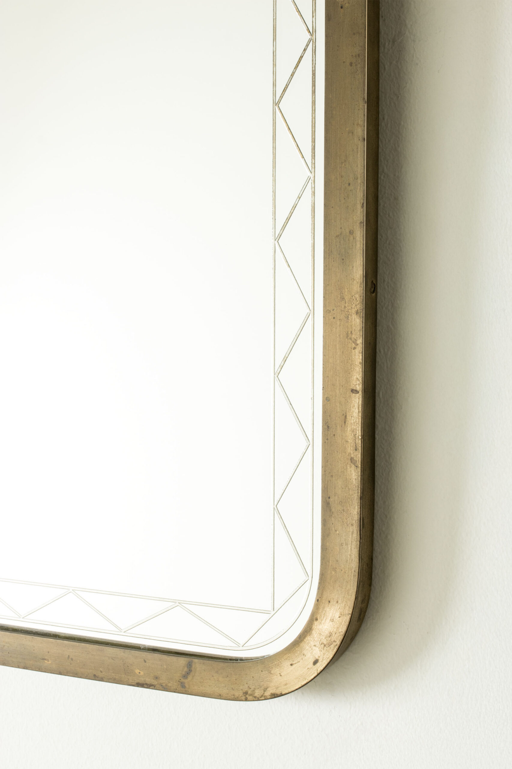 Lovely Swedish Modern wall mirror, with a brushed brass frame. Etched graphic pattern on the glass inside the edge of the frame.