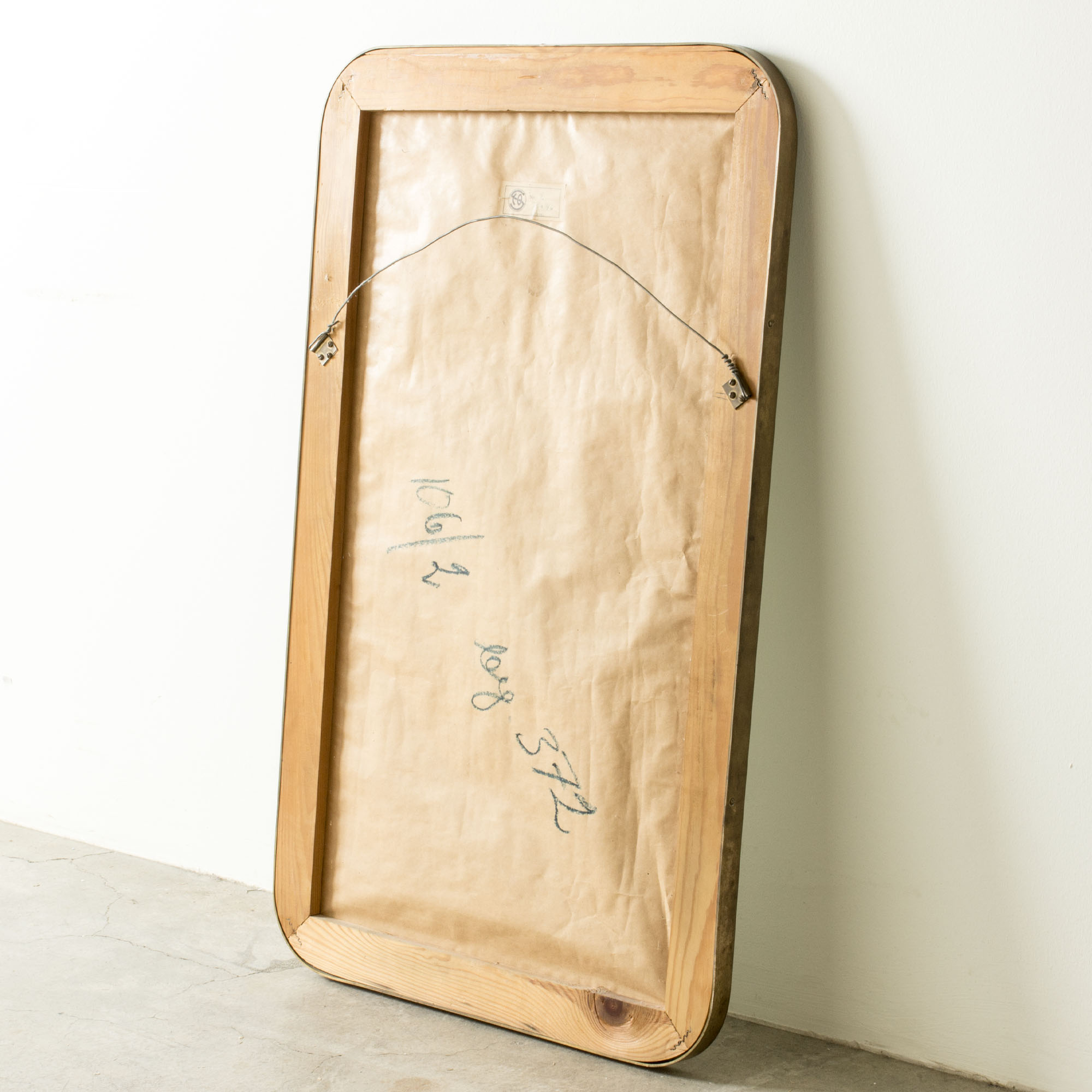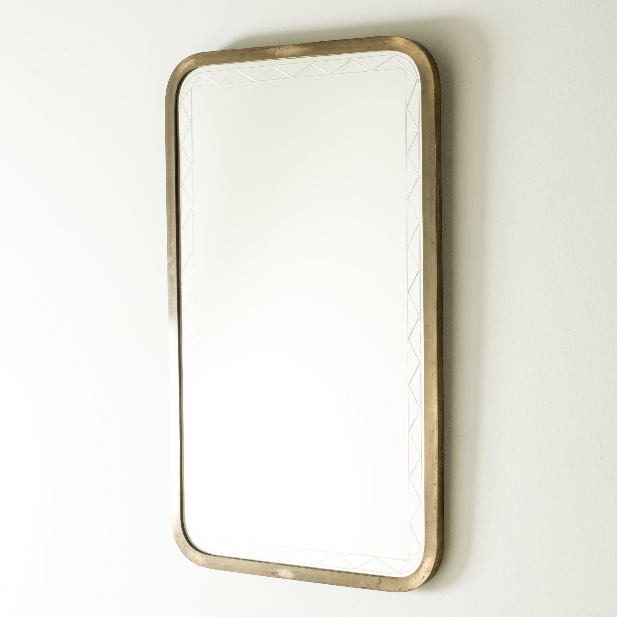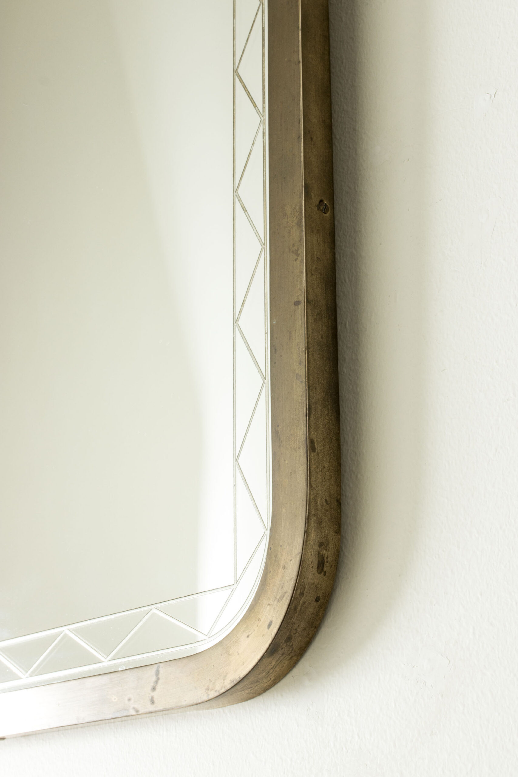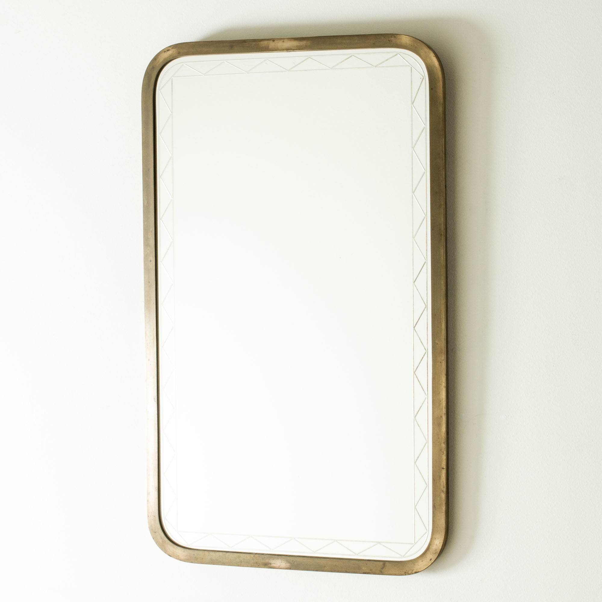 Lovely Swedish Modern wall mirror, with a brushed brass frame. Etched graphic pattern on the glass inside the edge of the frame.