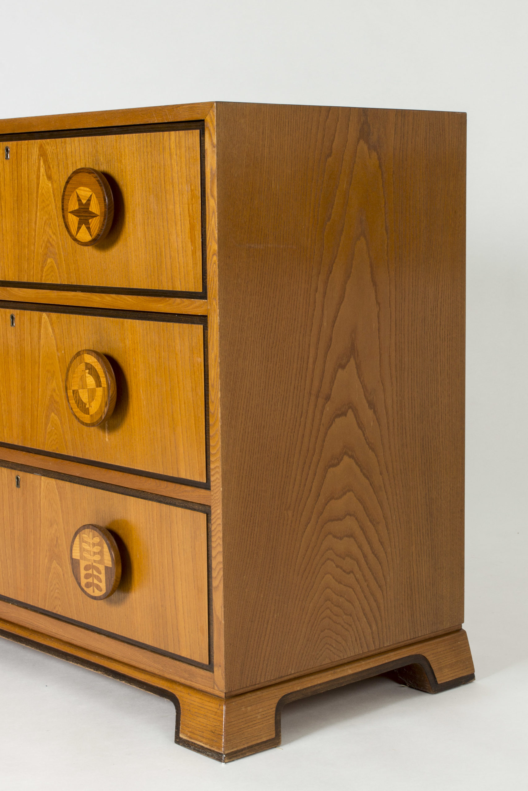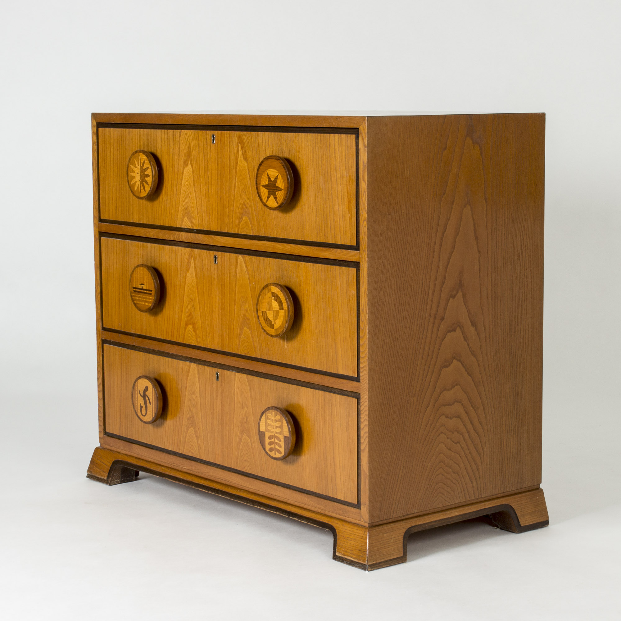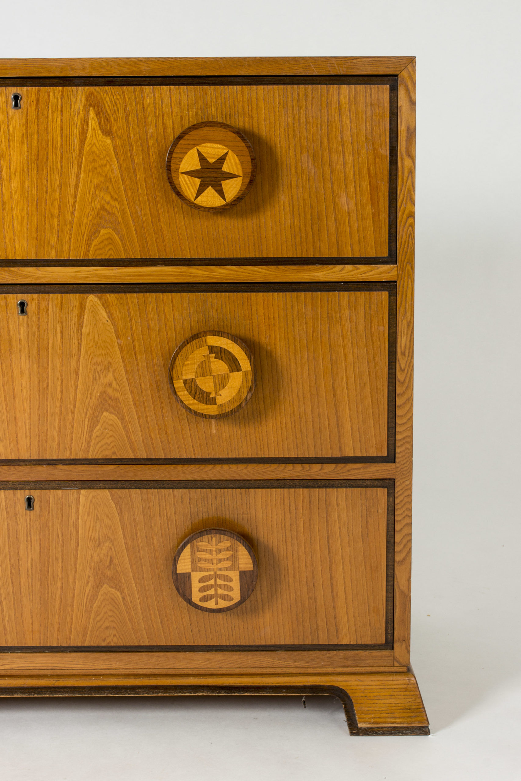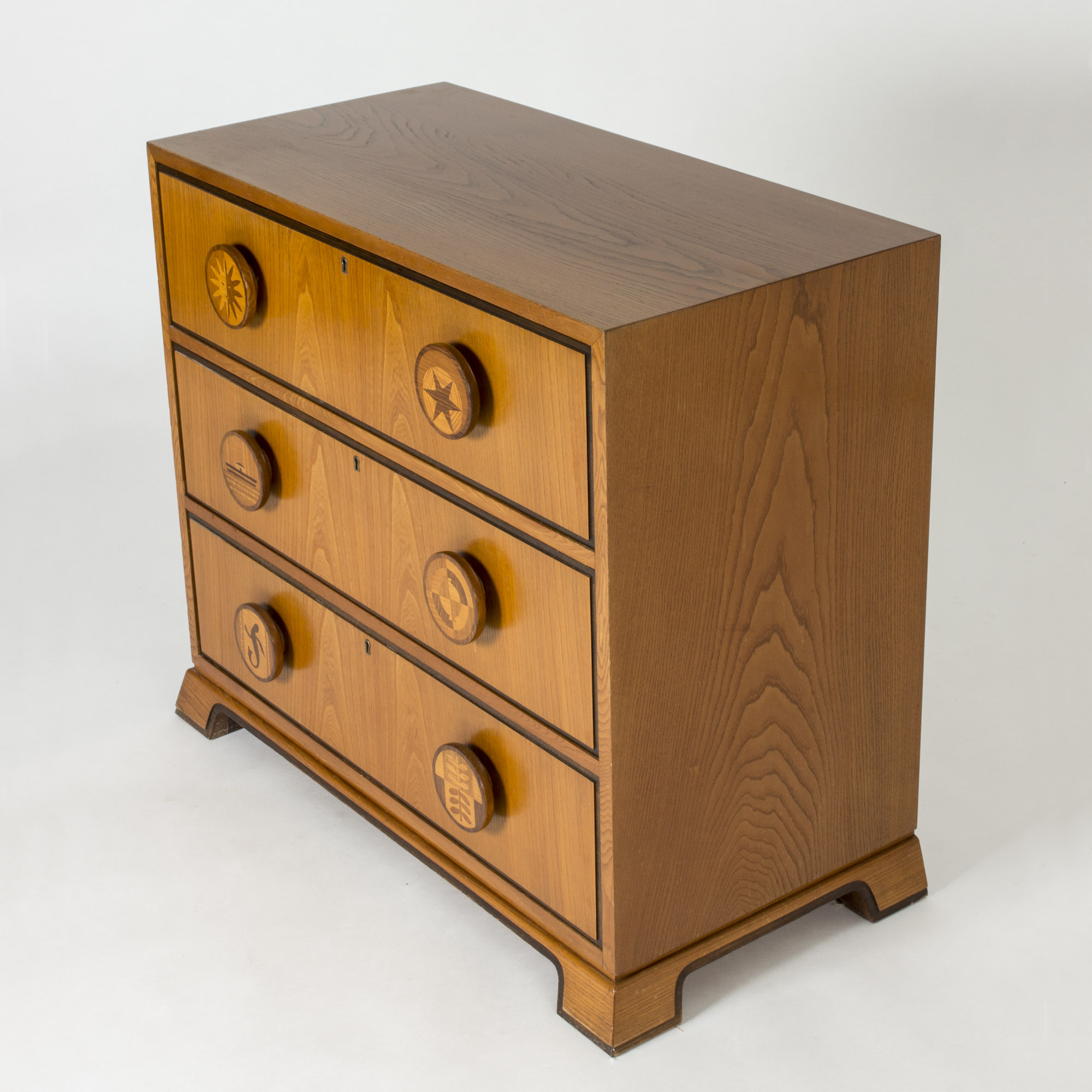 Chest of drawers by Otto Schulz for Boet. Amazing Swedish Modern chest of drawers, made from mahogany. Oversized round drawer handles with inlayed decor of different images. They show a sun, a star, a boat on the water, a compass, a lizard and leaves. Beautiful woodgrain and contrast between the strict lines and graphic decor.