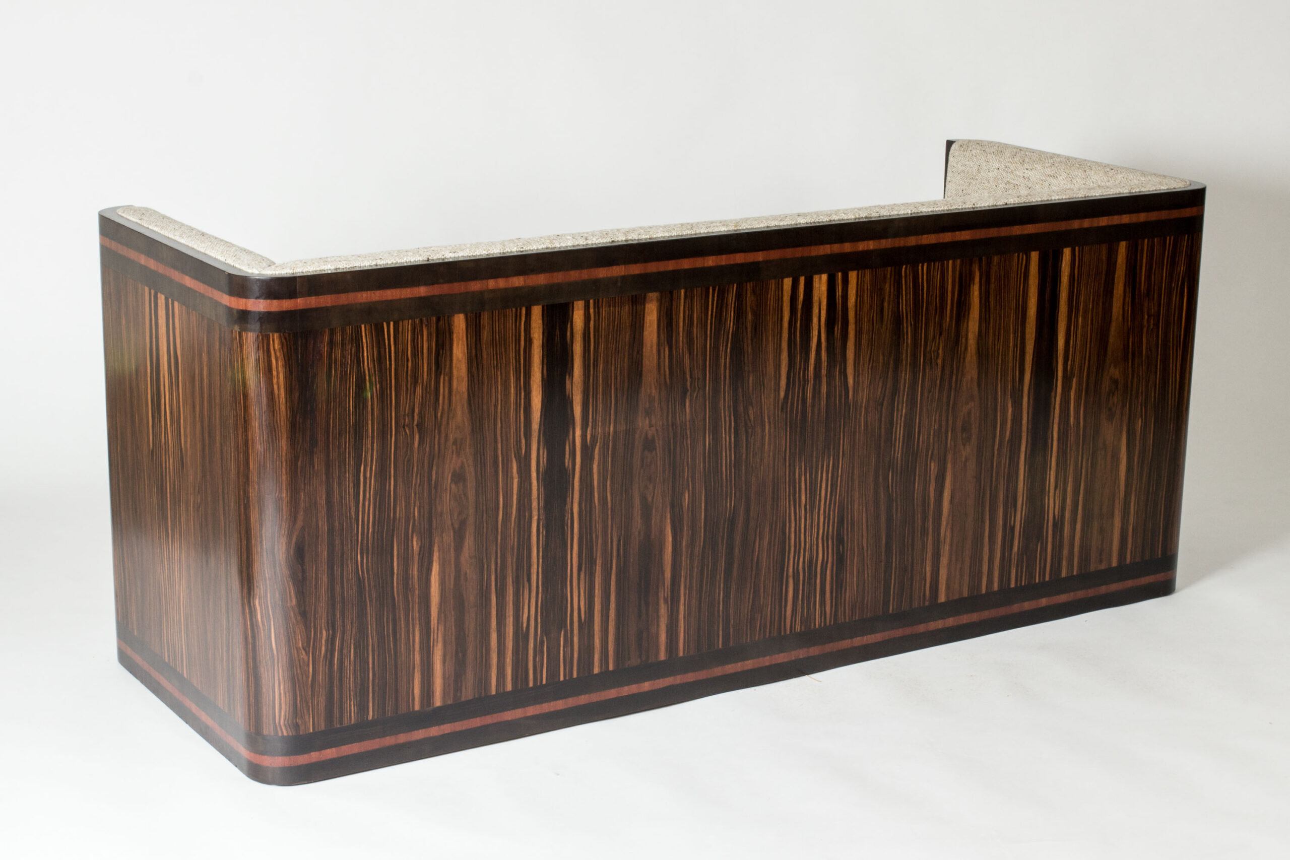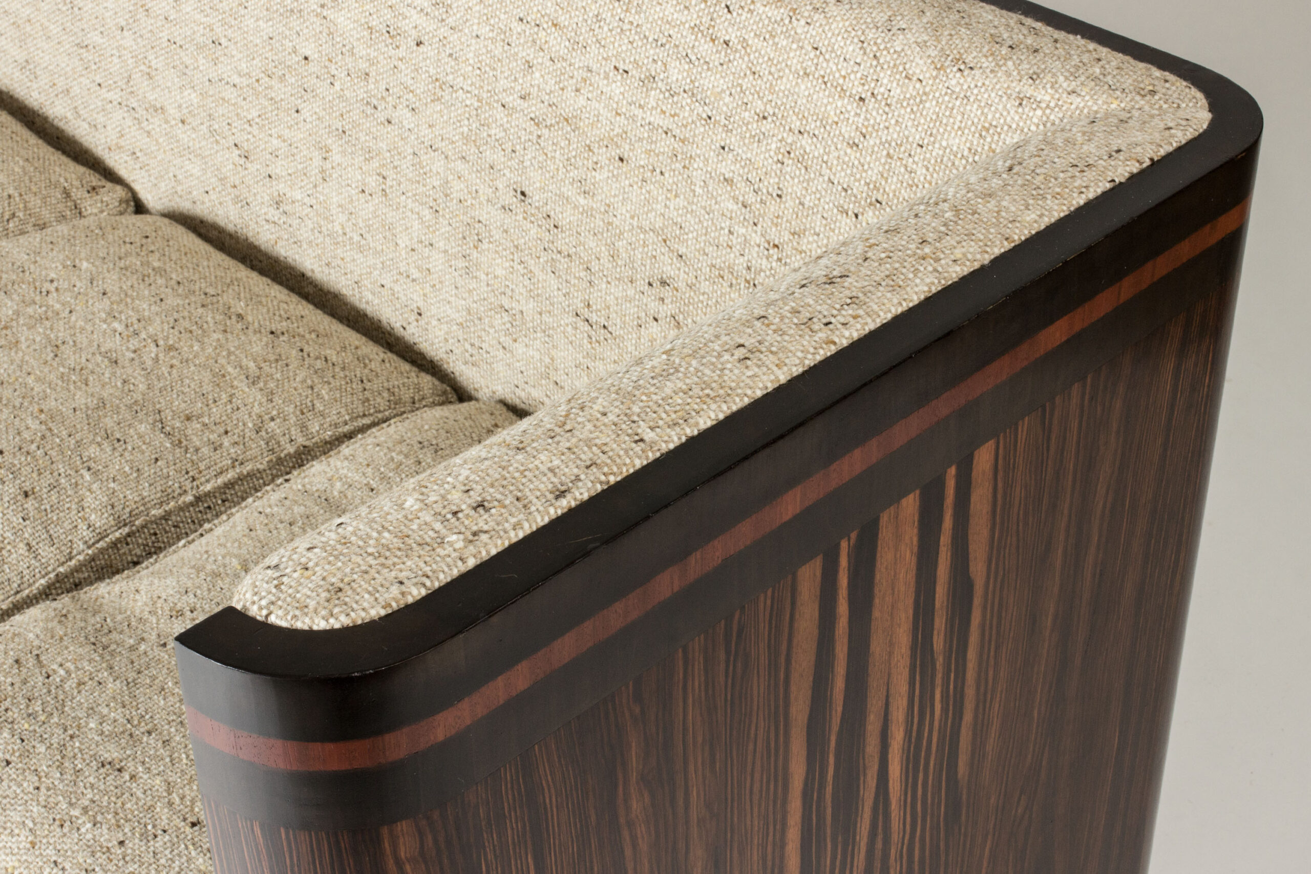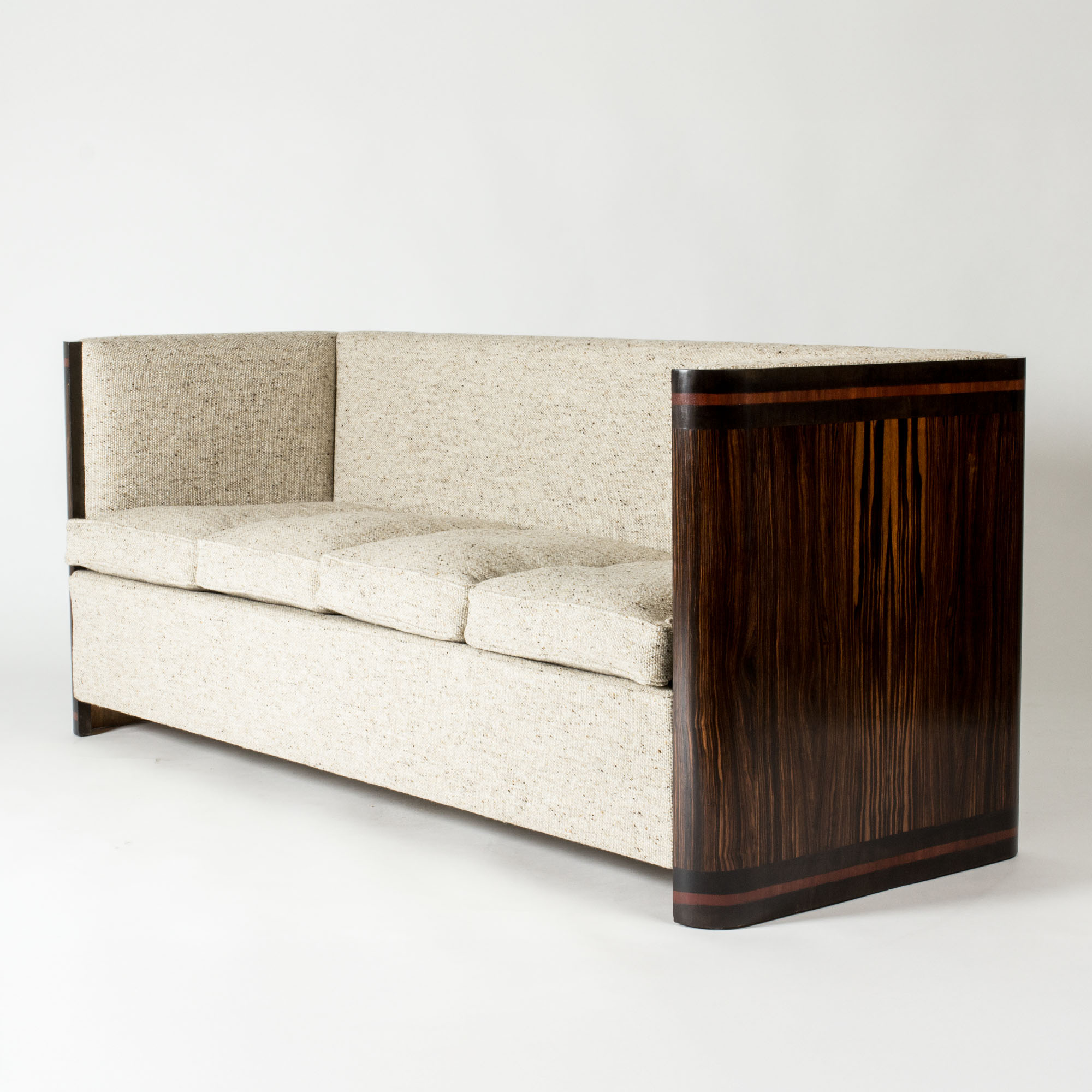 Very elegant Swedish Modern sofa, with a compact wooden frame along the back and sides, made from rosewood with lighter wooden stripes around the top and bottom. Re-upholstered in a luxurious wool fabric that is a modern update in the style of the original fabric. Comfy down cushions.
