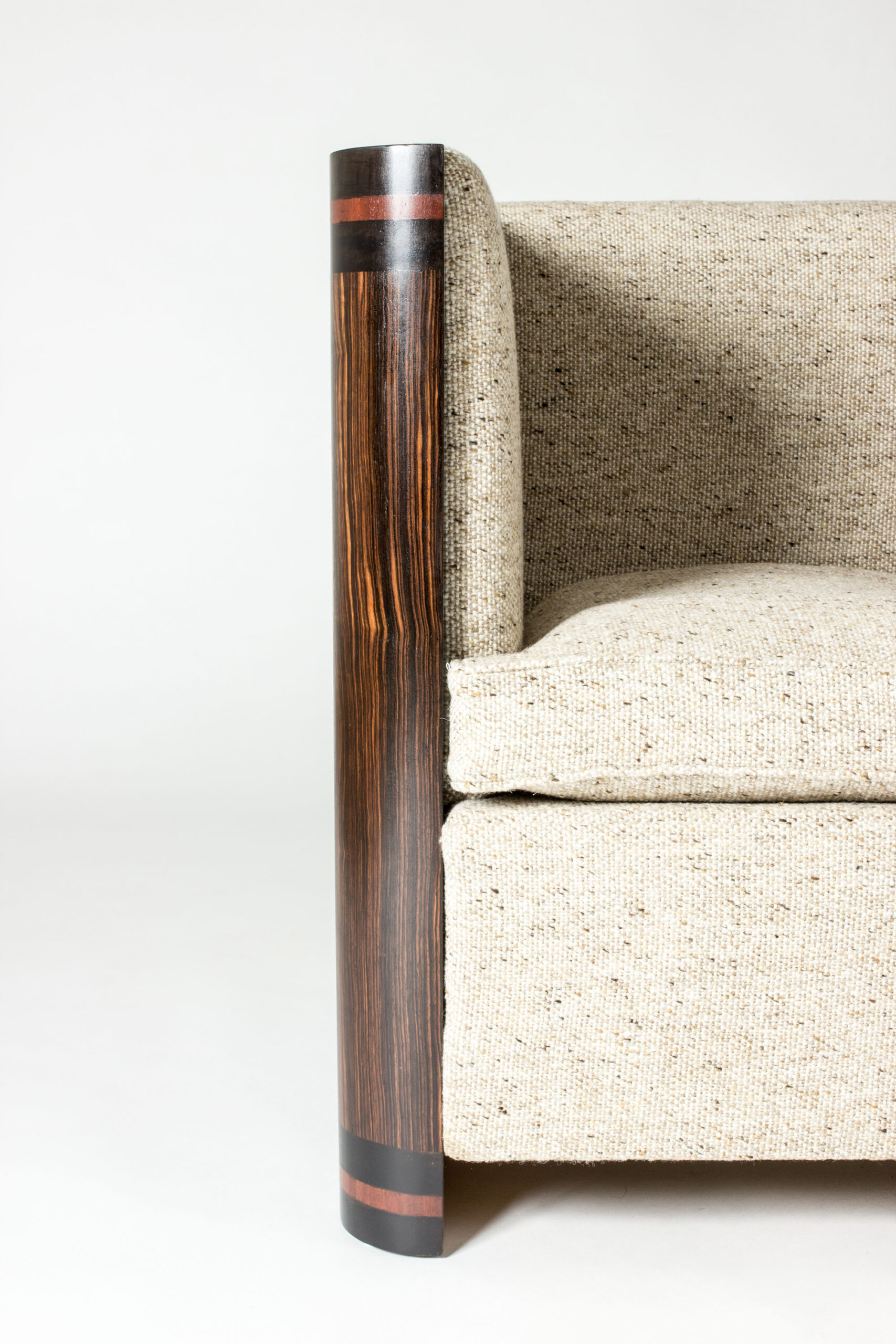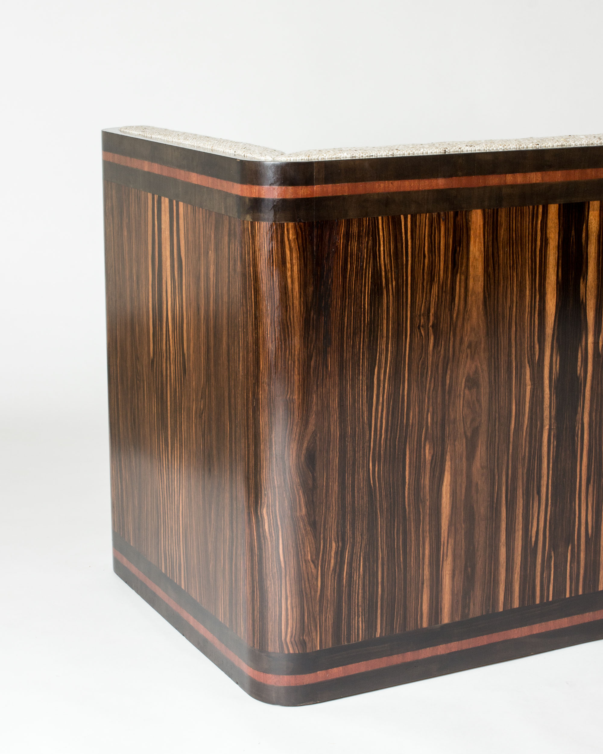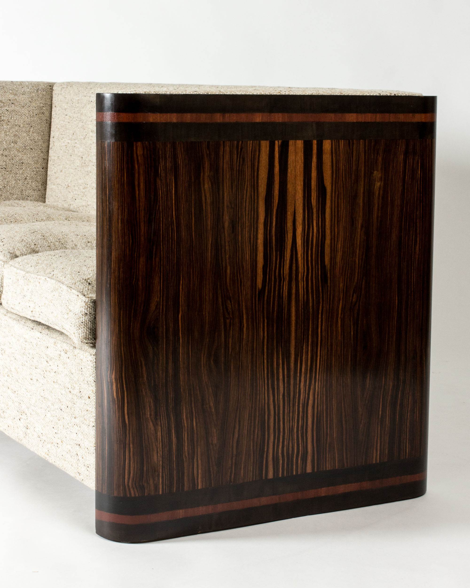 Very elegant Swedish Modern sofa, with a compact wooden frame along the back and sides, made from rosewood with lighter wooden stripes around the top and bottom. Re-upholstered in a luxurious wool fabric that is a modern update in the style of the original fabric. Comfy down cushions.